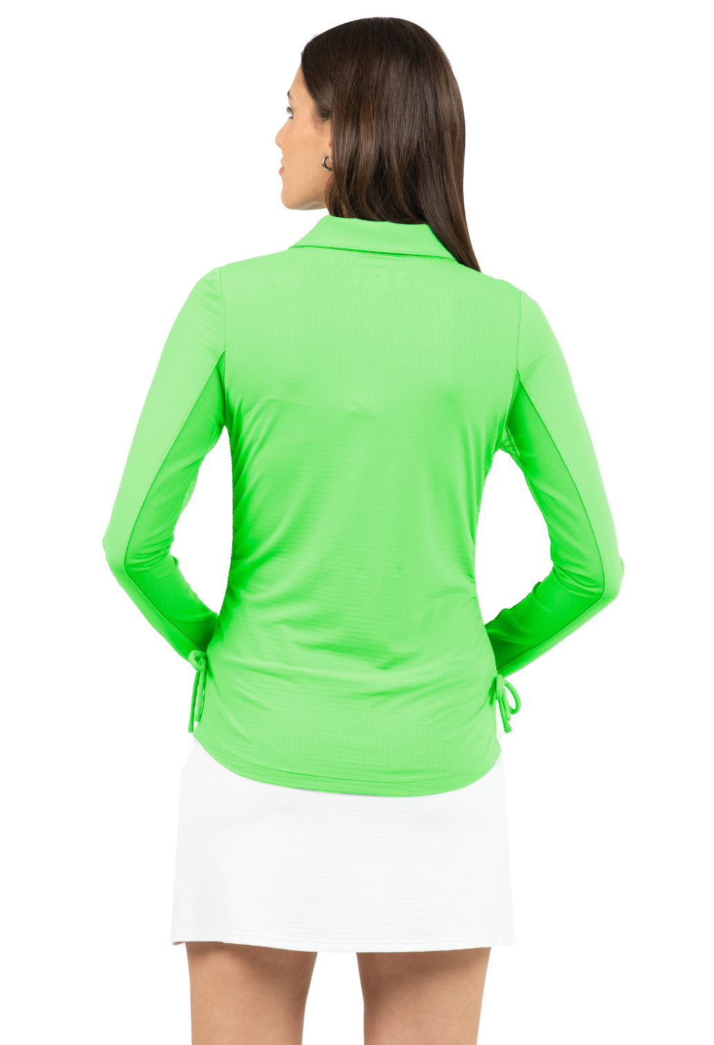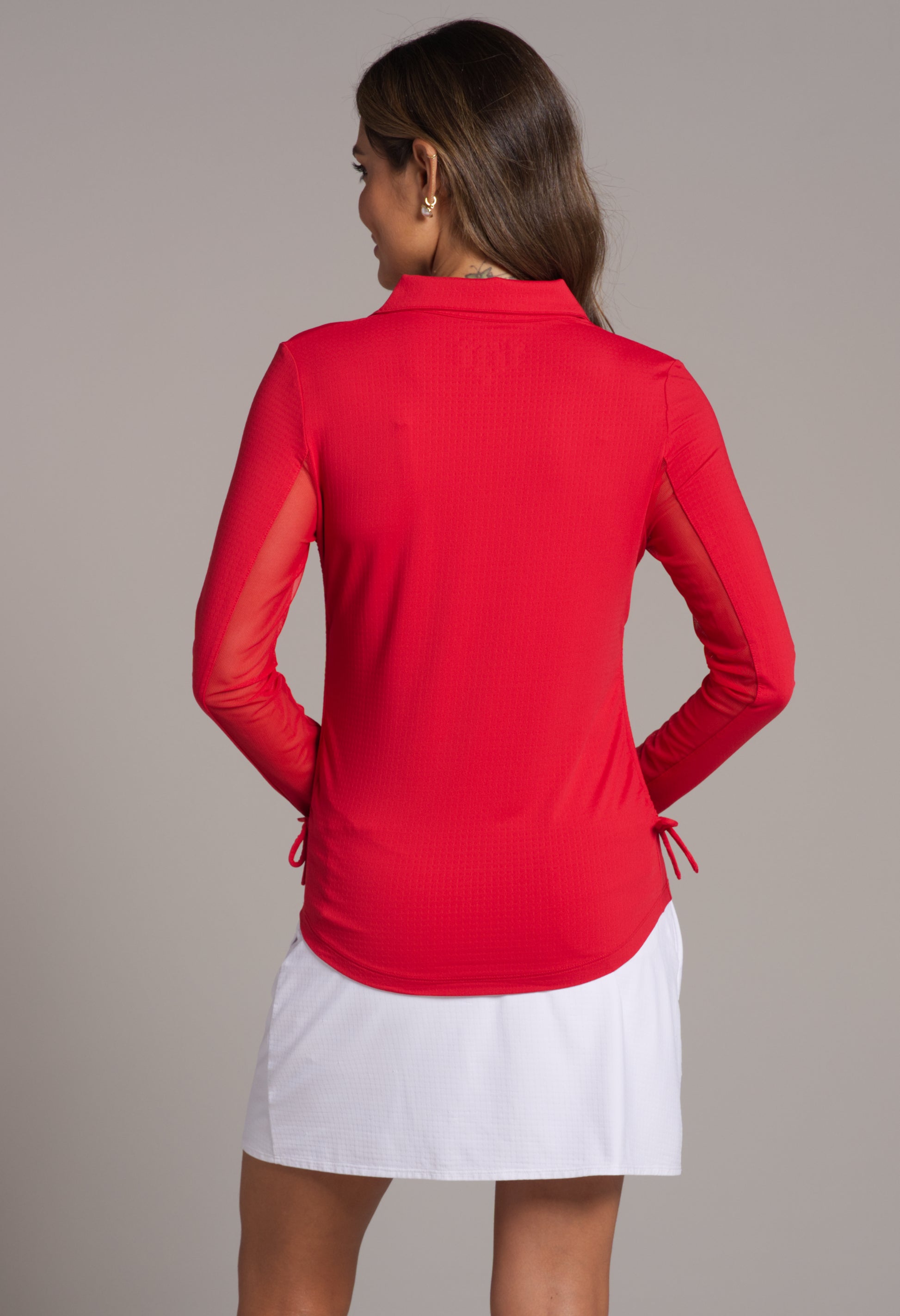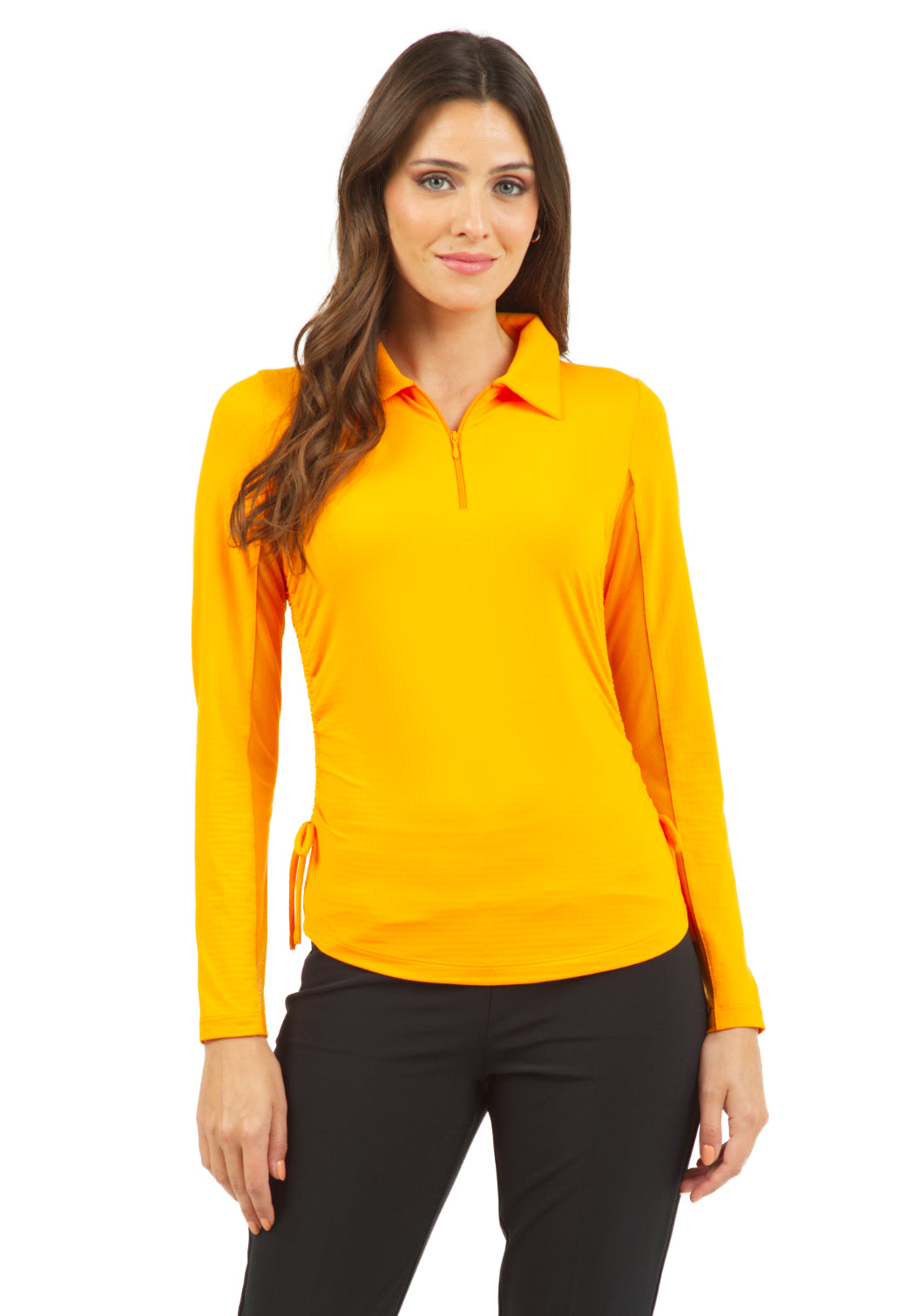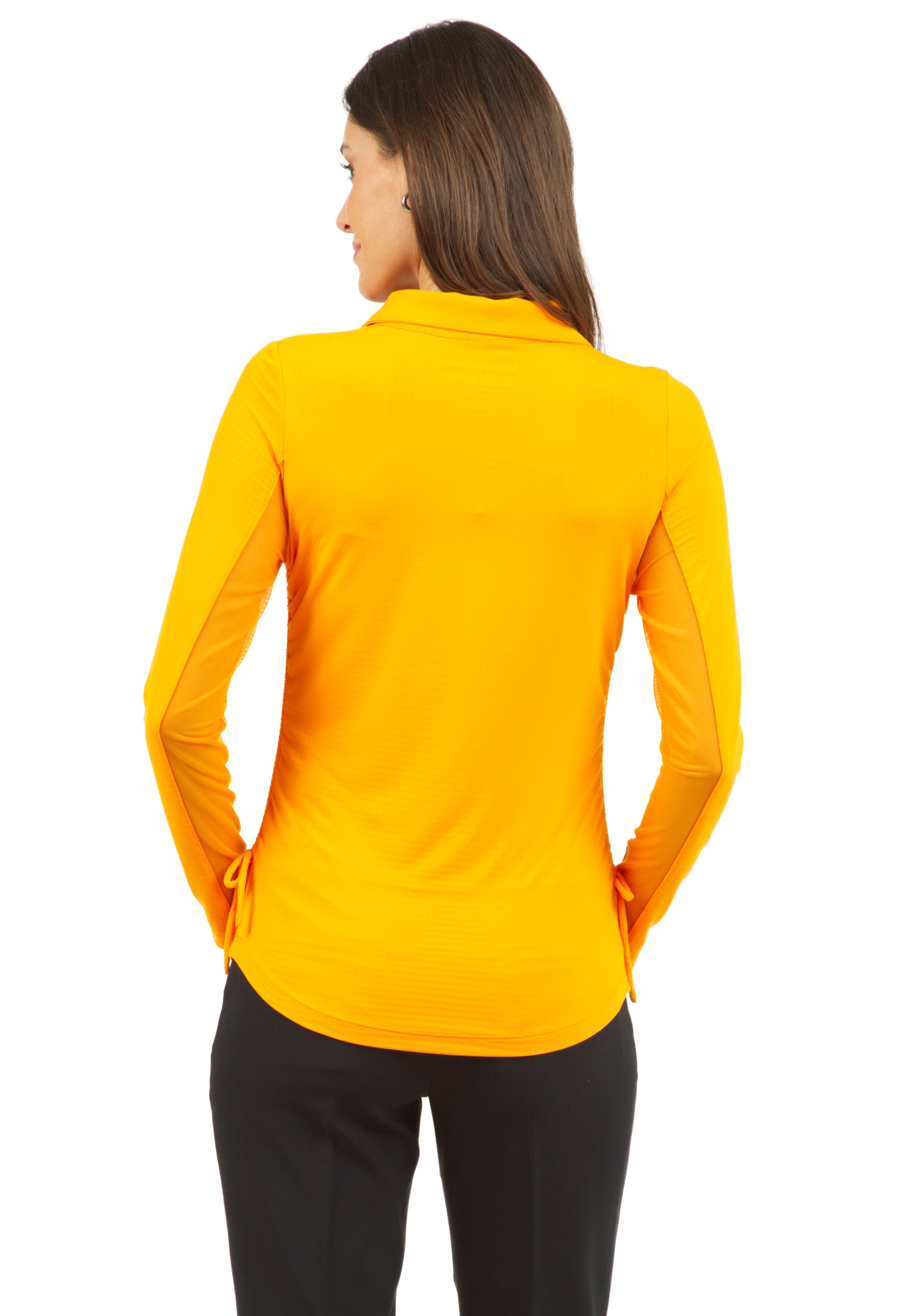 This flattering polo top has adjustable ties along the sides to let you create the length and look you choose. This silhouette features our patented Iceƒil Cooling Technology lowering your skin temperature up to five degrees. The mesh inner arm panels provide additional ventilation to keep you cool and dry for all your athleisure activities. UPF 50+ sun protection protects you from the sun along with anti-bacterial and moisture wicking properties allows you to look and feel your best on the hottest humid days.