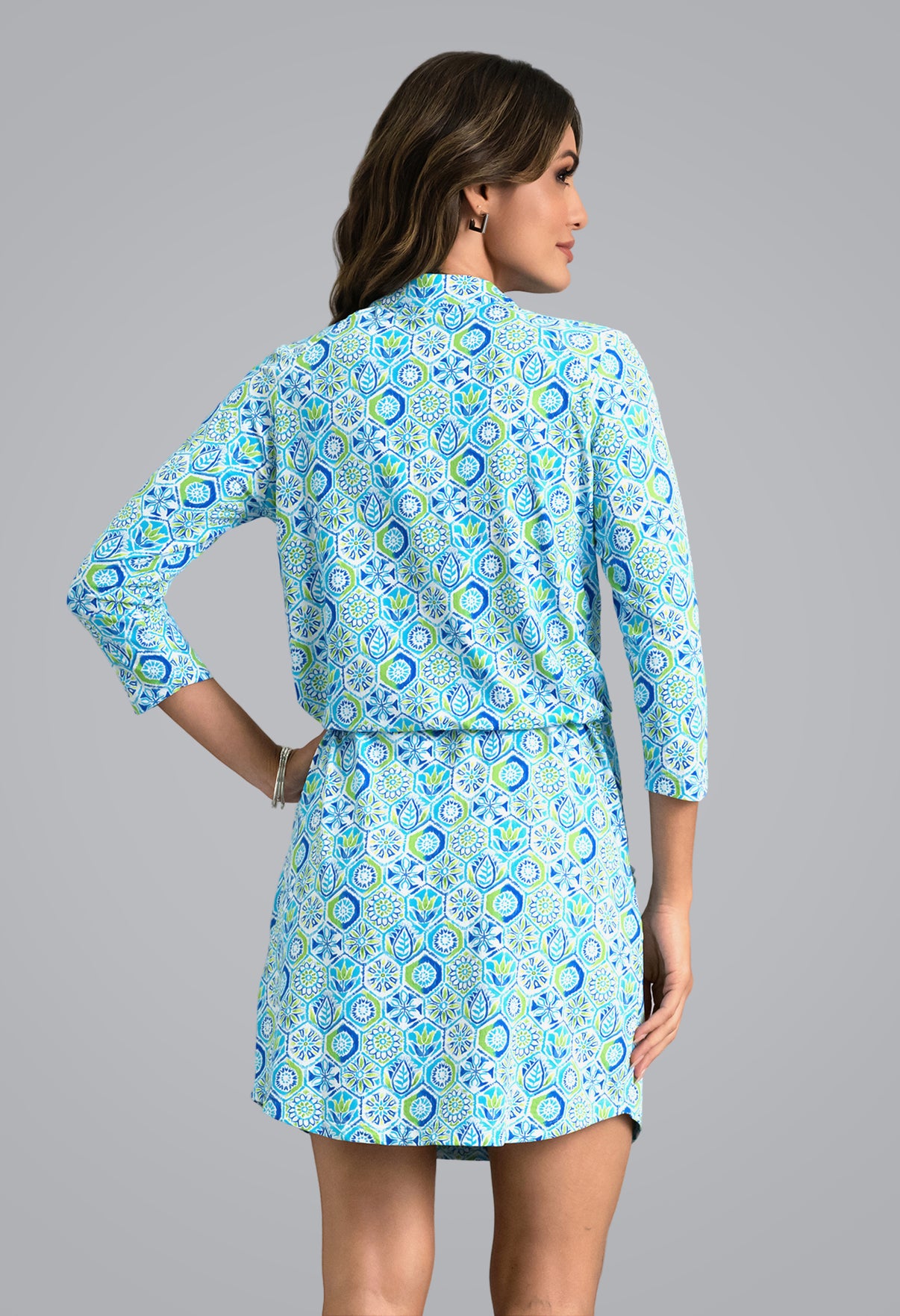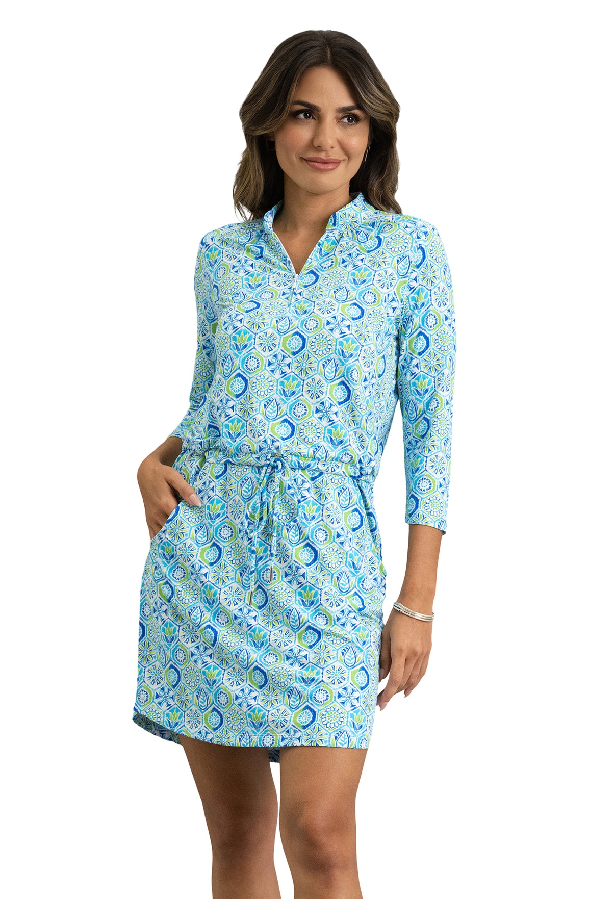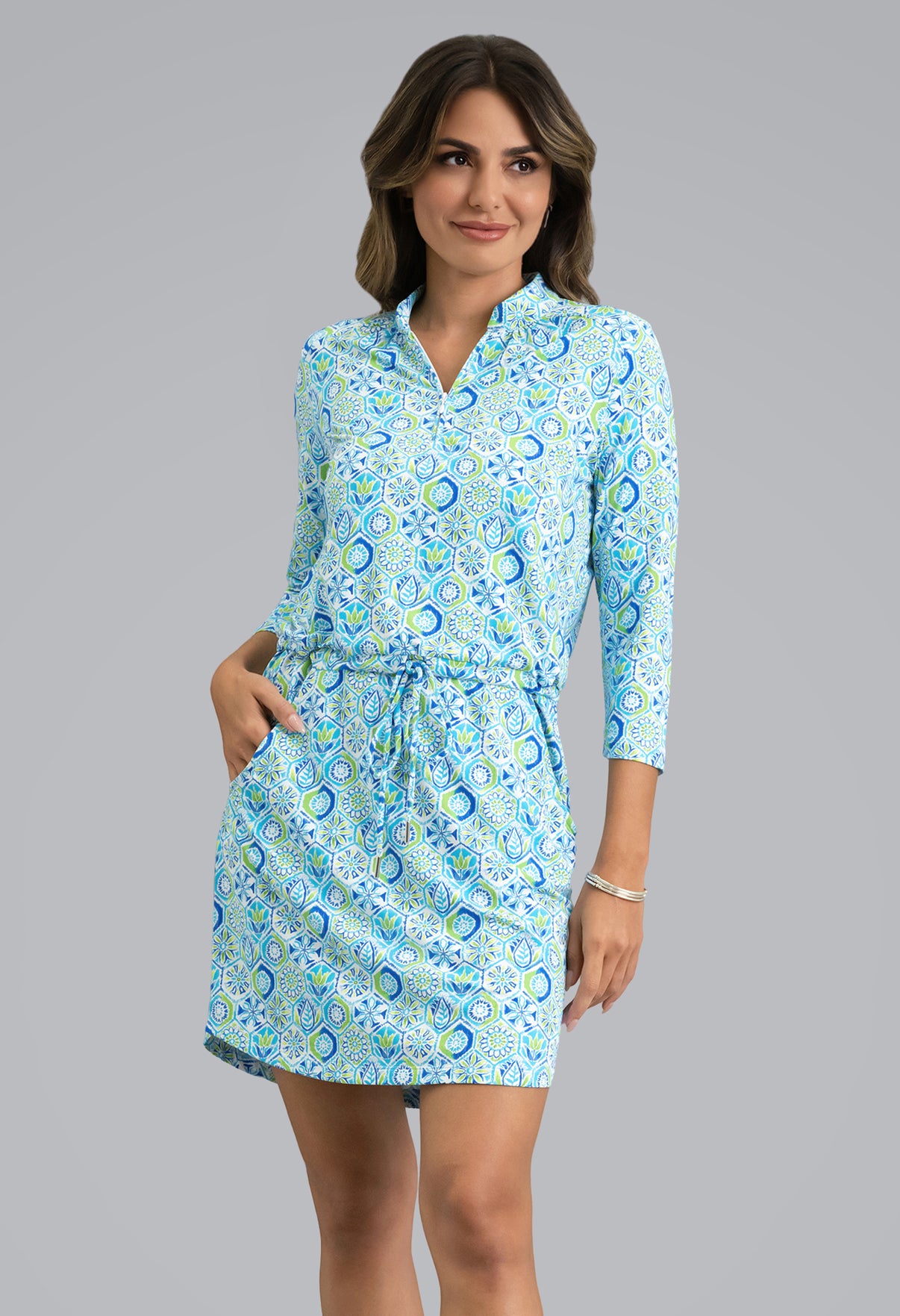 Meet your new statement-maker. The Alexis Print 3/4 Sleeve Drawstring Dress mixes graphic lines and lively color for a look that’s equal parts playful and put-together. The adjustable drawstring waist lets you create your perfect shape, while 3/4 sleeves add easy coverage and all-day comfort. Crafted from our signature IceFil® fabric, it’s soft, light, and breathable—cooling the skin by up to five degrees while wicking away moisture and resisting odor. With UPF 50+ sun protection built in, it’s a look that shines from day to night.