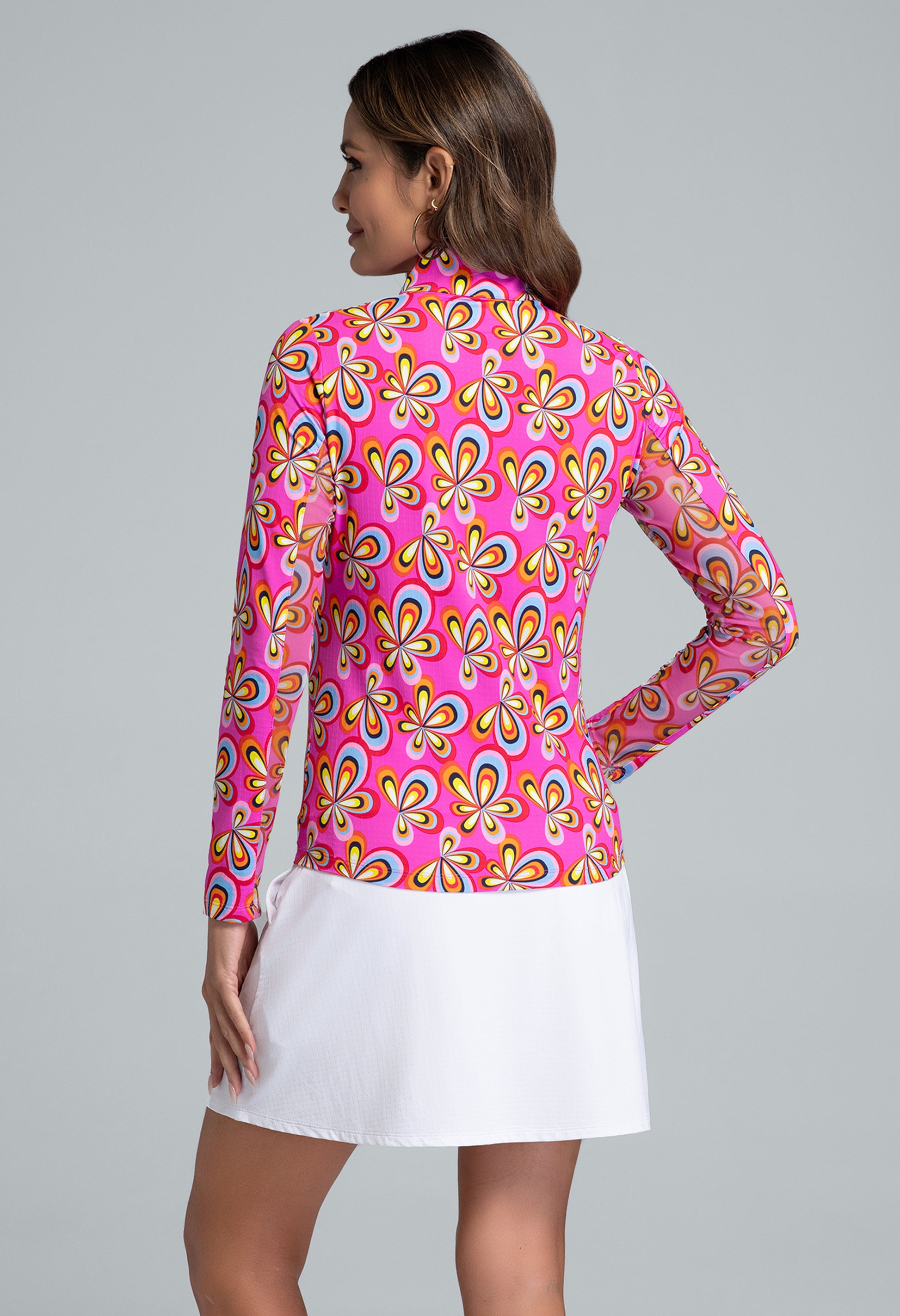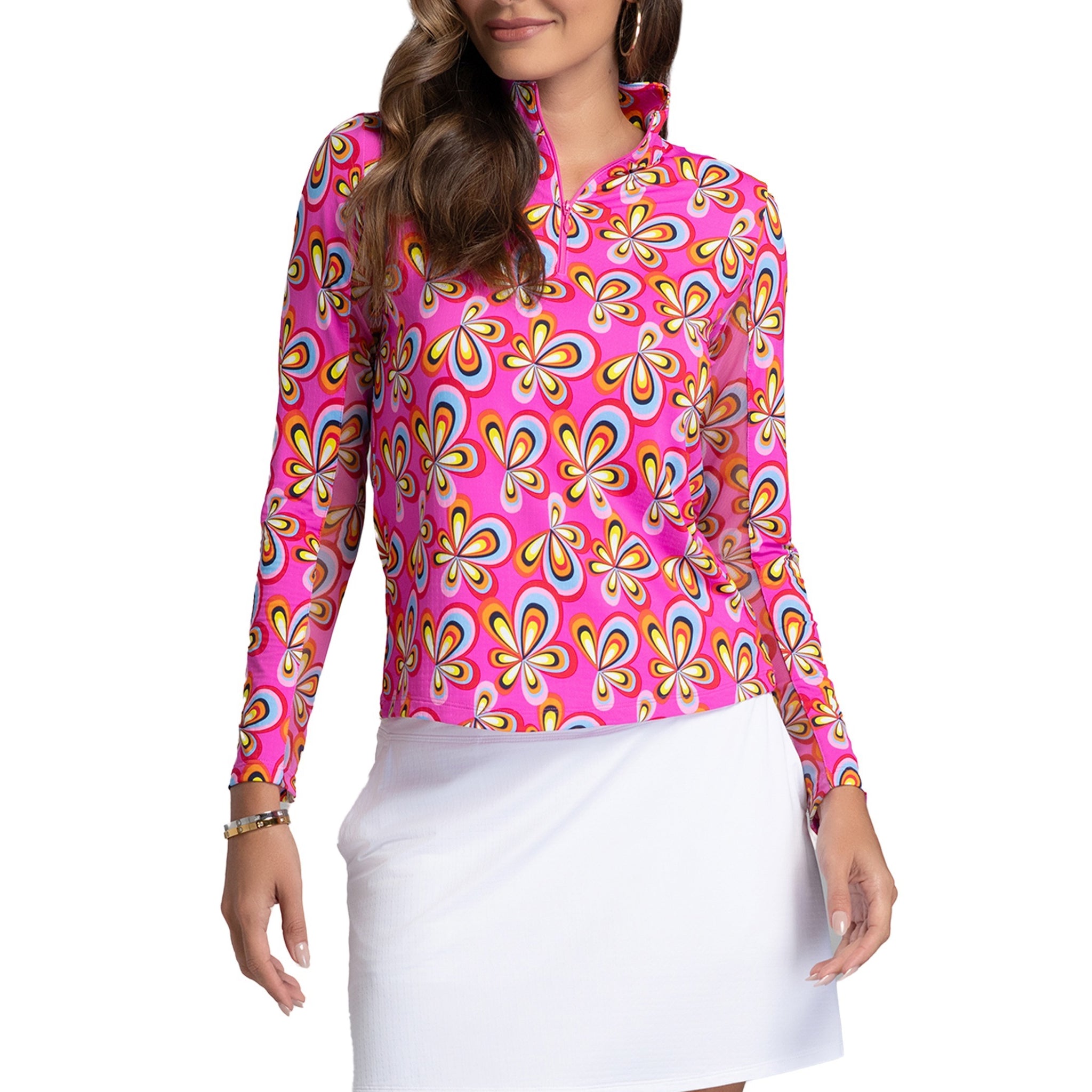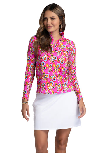 Bring the flower power. The Arya Long Sleeve Mock Neck Top combines bold, vintage-inspired blooms with modern performance features. With UPF 50+ sun protection and moisture-wicking Iceƒil® fabric, this top is made to move — on the course, court, or wherever the day takes you. A sleek silhouette, mesh underarm panels for added breathability, and a stand collar deliver elevated polish in every colorway.
