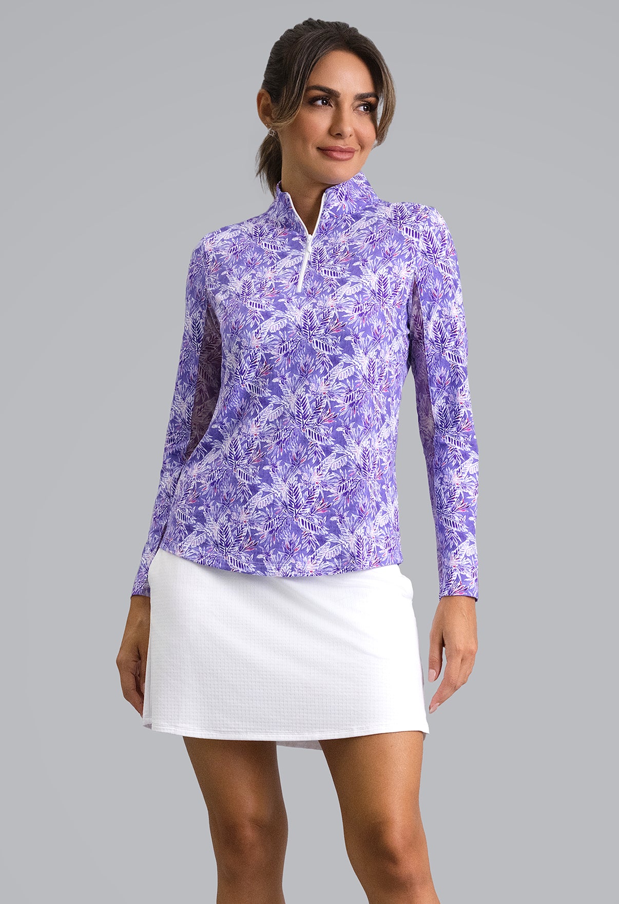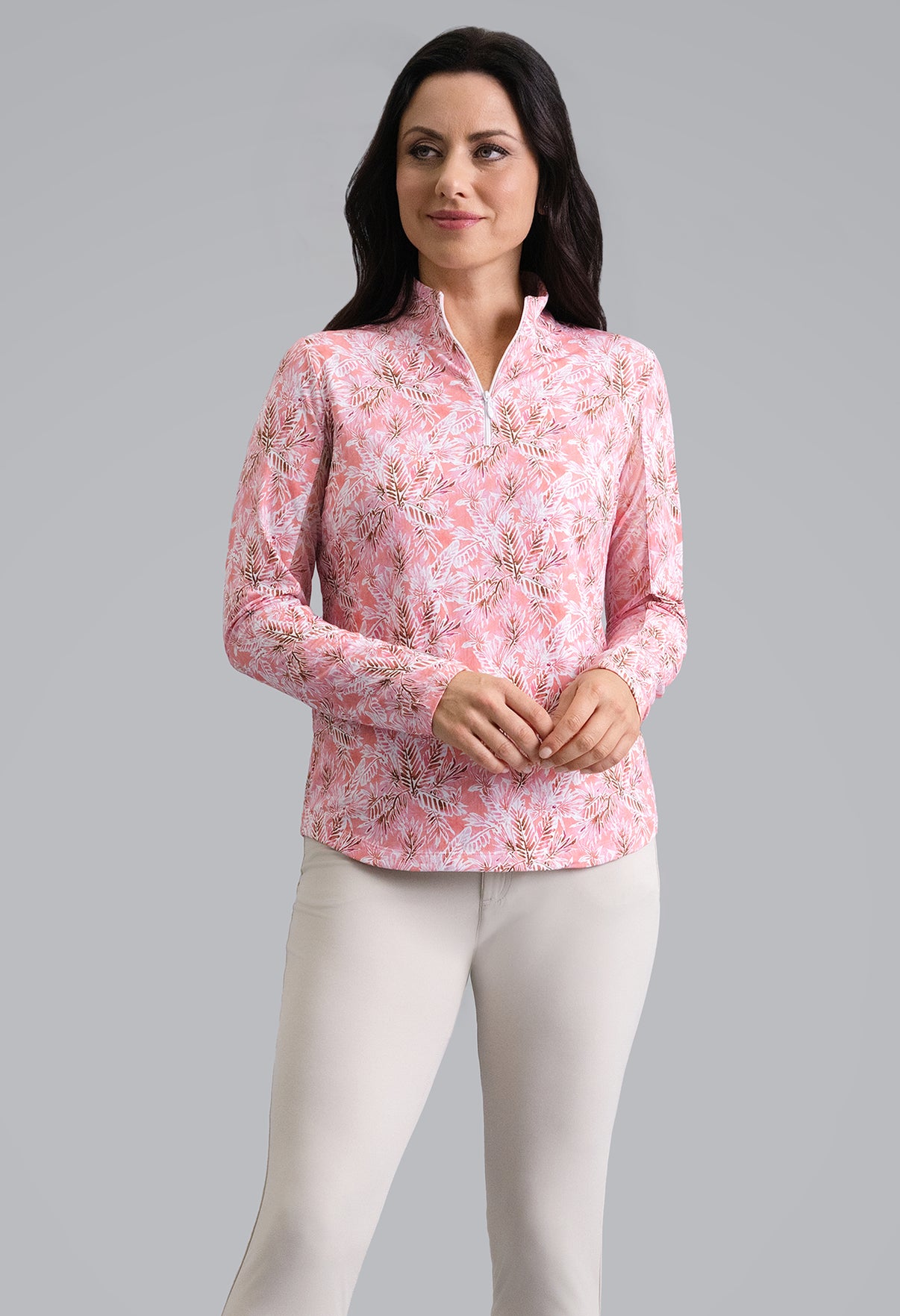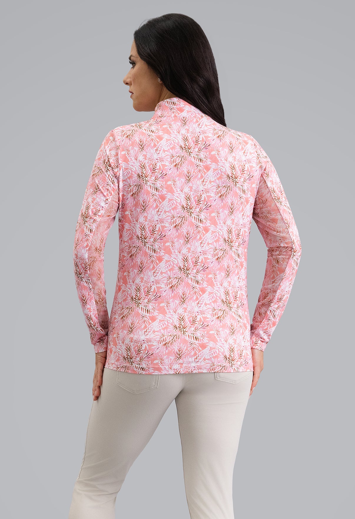 Soft color meets tropical charm in the Briana Print Long Sleeve Mock Neck Top. The airy palm design creates subtle dimension in Peach or Plum, blending effortless style with performance comfort. Made with IceFil® cooling fabric, it lowers skin temperature, wicks moisture, and provides UPF 50+ protection for sunny days on or off the course.