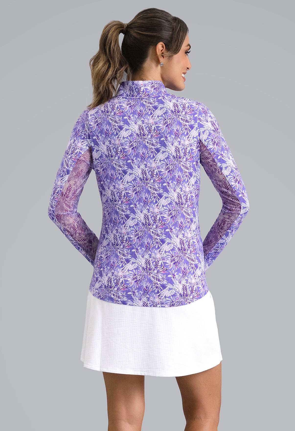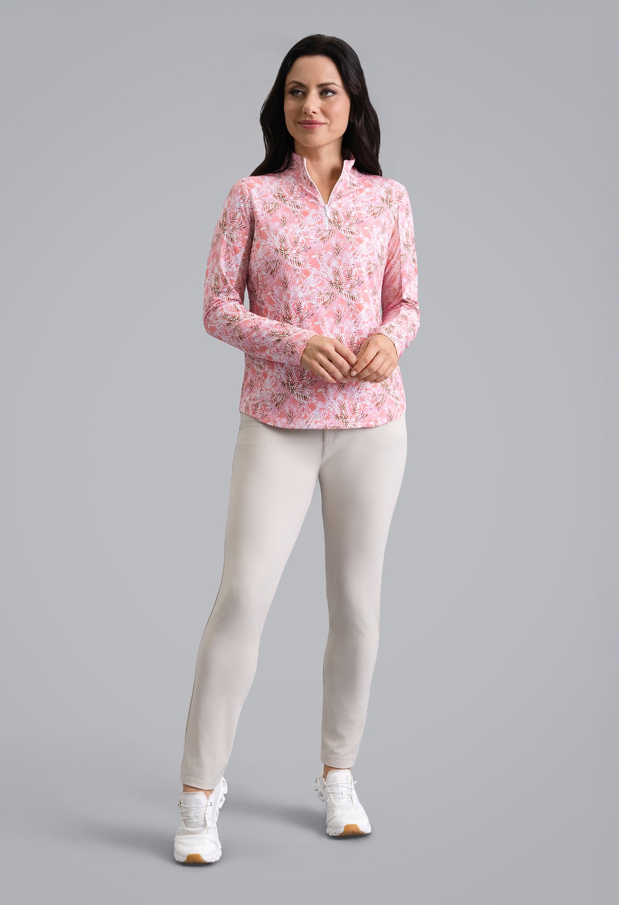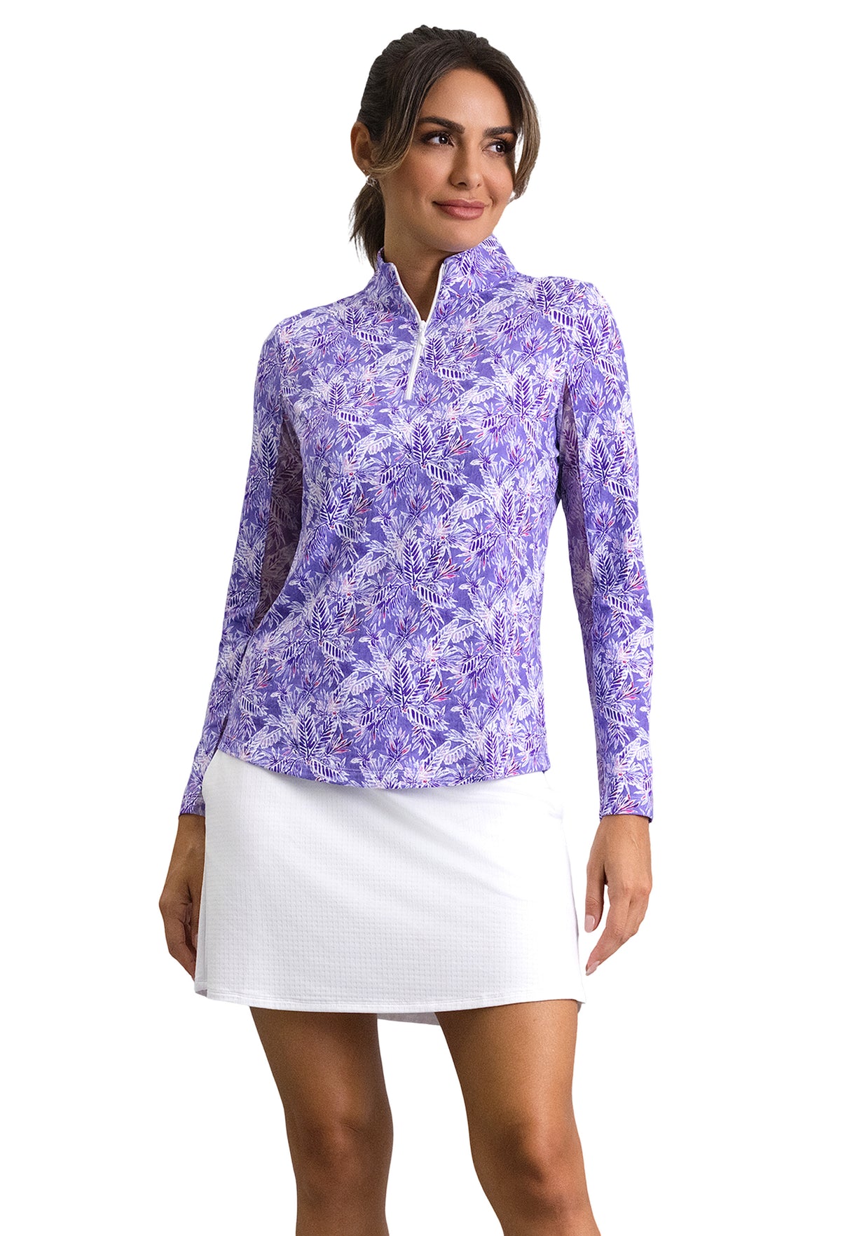 Soft color meets tropical charm in the Briana Print Long Sleeve Mock Neck Top. The airy palm design creates subtle dimension in Peach or Plum, blending effortless style with performance comfort. Made with IceFil® cooling fabric, it lowers skin temperature, wicks moisture, and provides UPF 50+ protection for sunny days on or off the course.