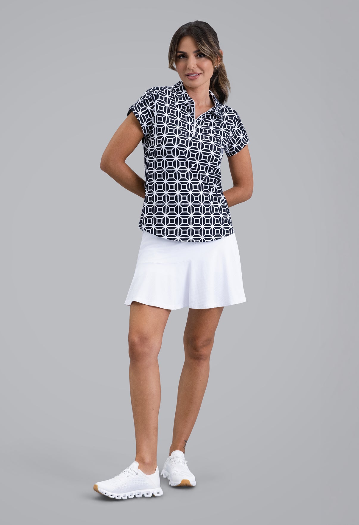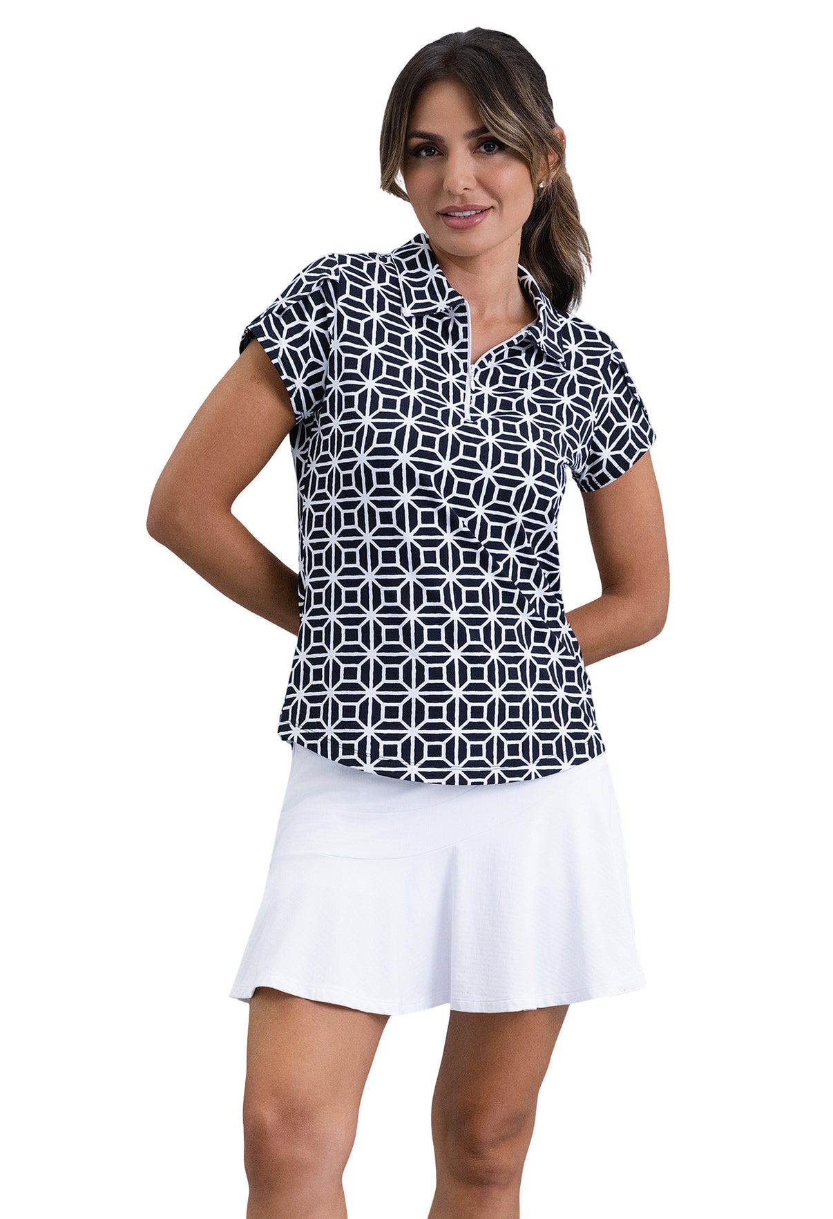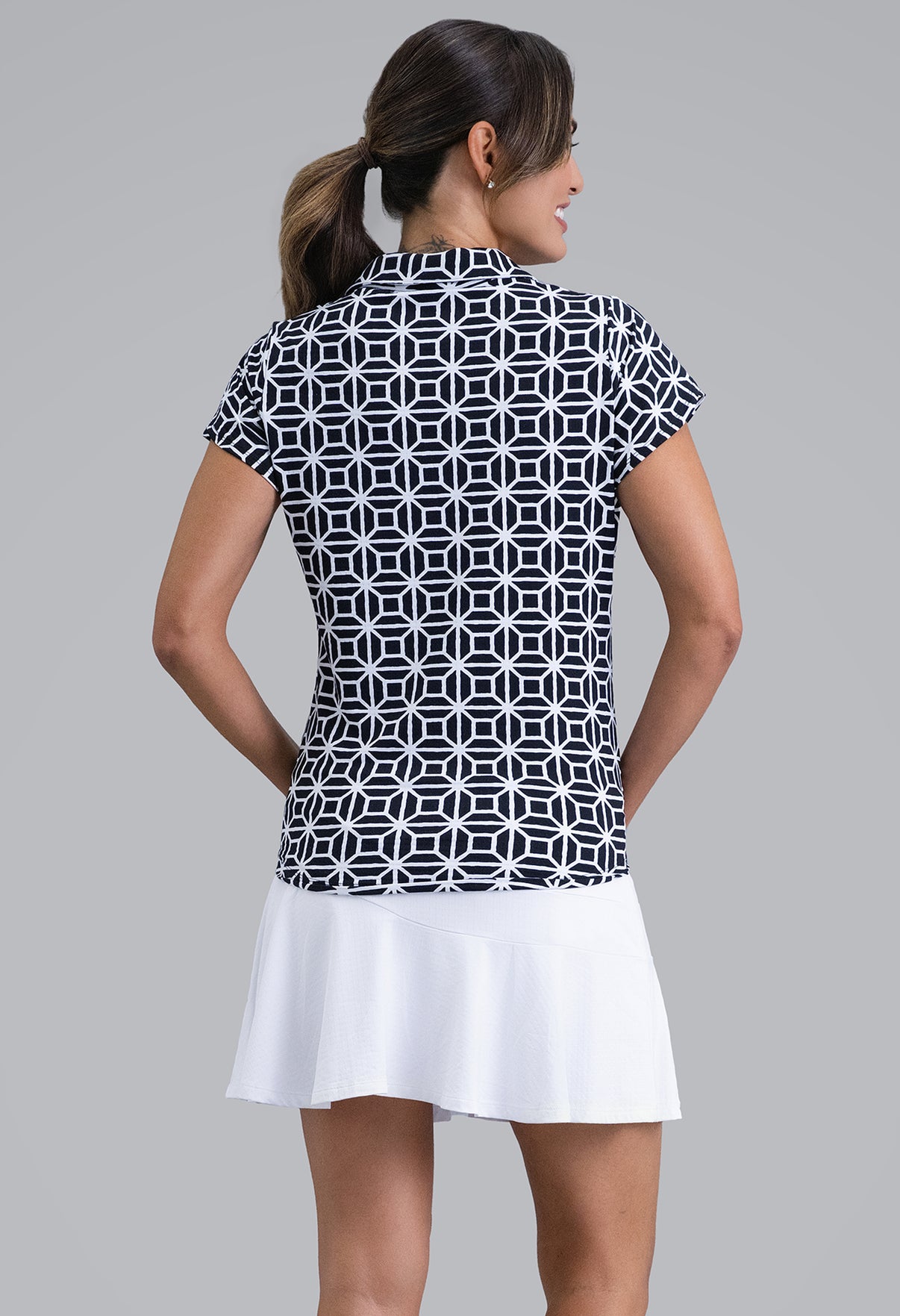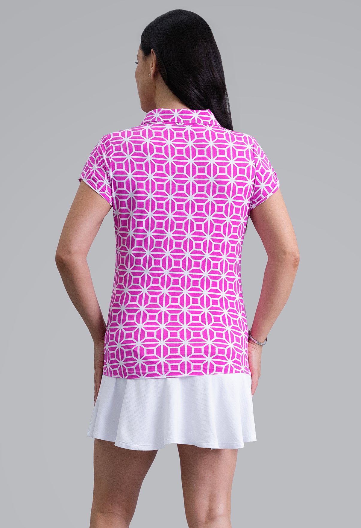 Structured yet soft, the Carolyn Print Tulip Sleeve Top combines a bold geometric design with a feminine touch. Available in Hot Pink and Black, its clean lines and lively contrast make a statement on and off the course. Designed in IceFil® cooling fabric, it’s light, breathable, and ready for warm days in motion.