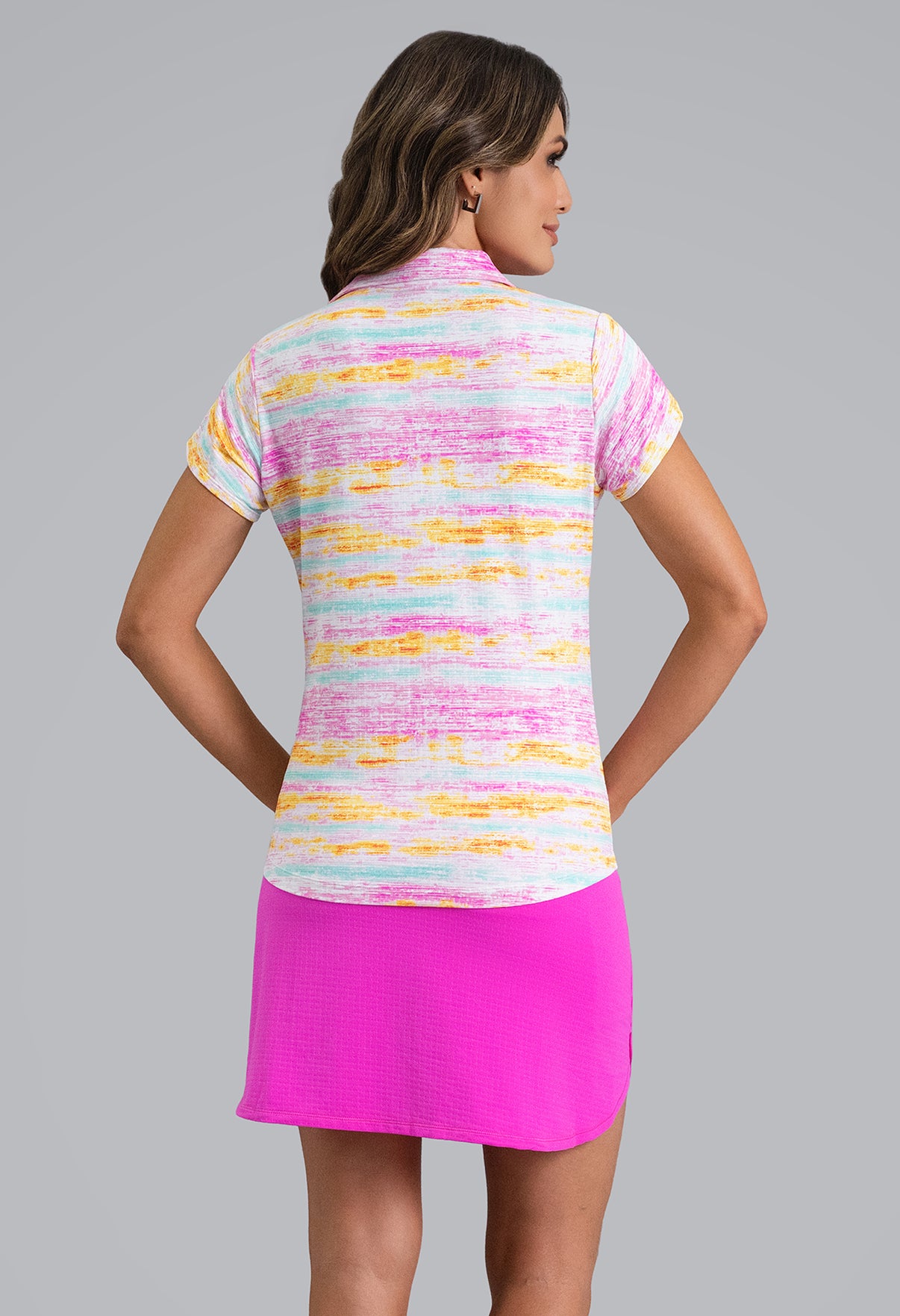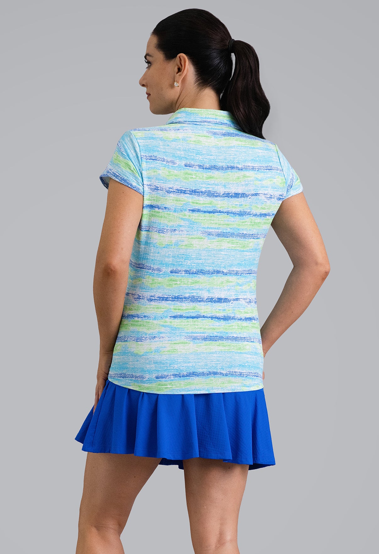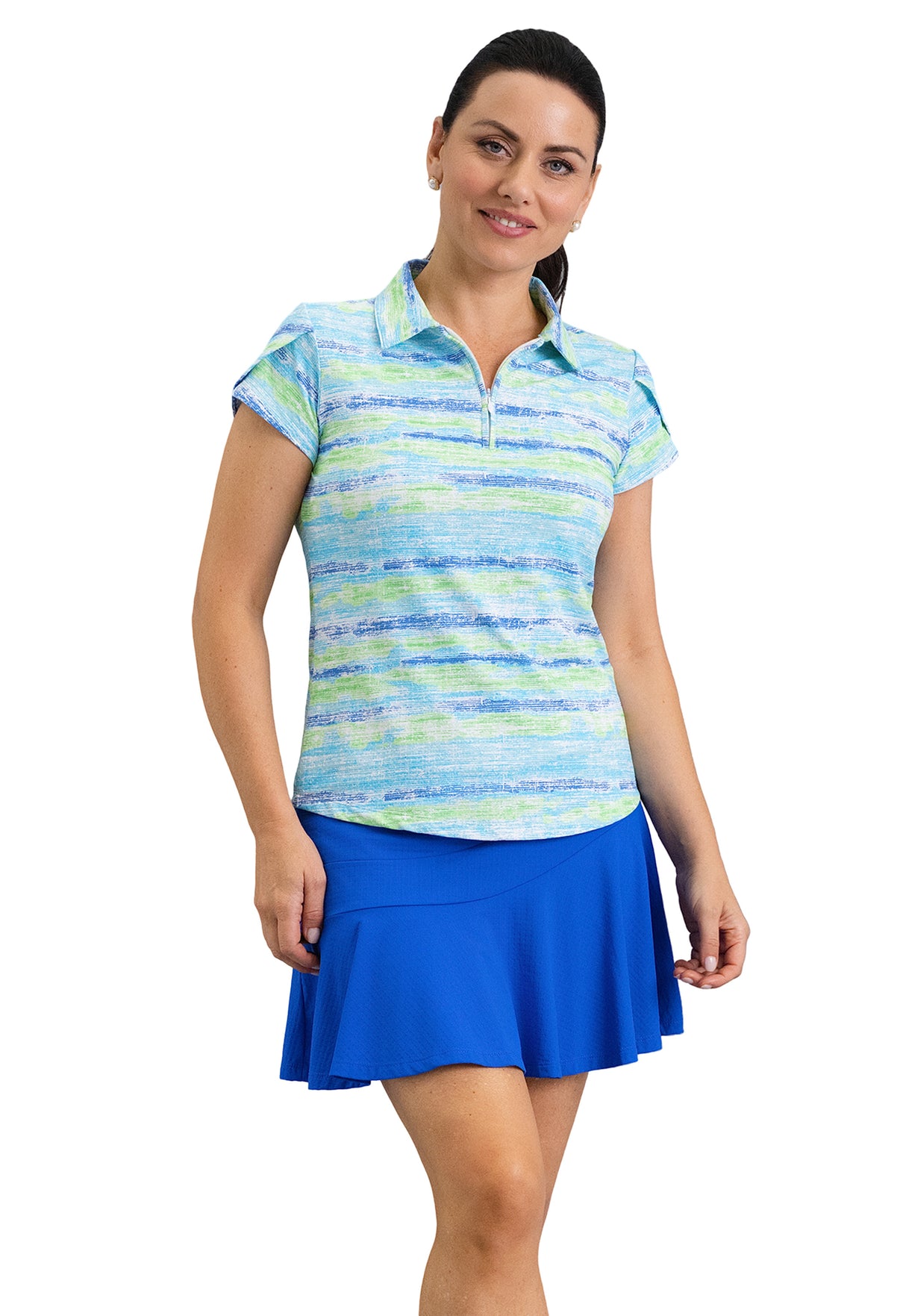 The Gia Print Tulip Sleeve Top brings a pop of color and personality to your everyday rotation. The fluid, watercolor-like stripes in Hot Pink/Multi or Blue/Multi create a fresh, modern look, while the tulip sleeves add a soft, feminine finish. Designed in IceFil® cooling fabric, it keeps you cool, dry, and comfortable from morning coffee to afternoon rounds.