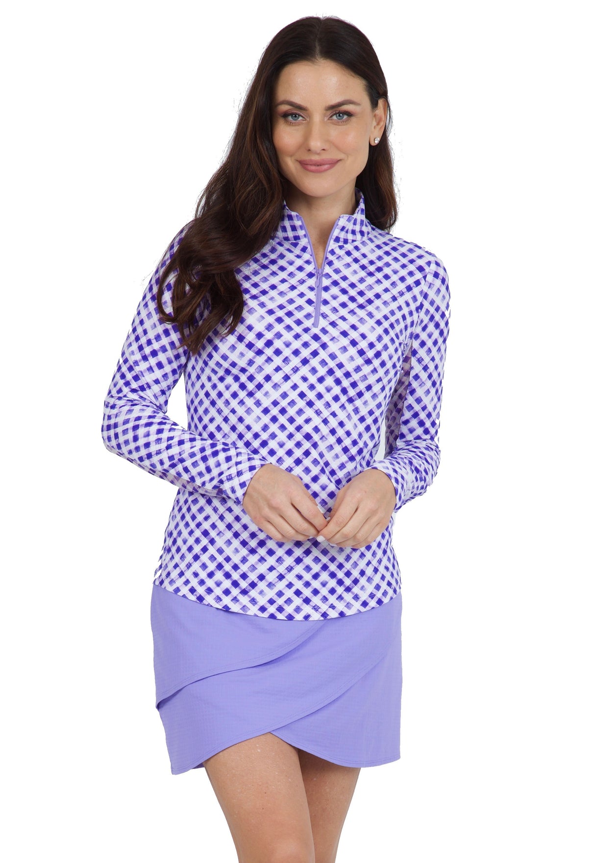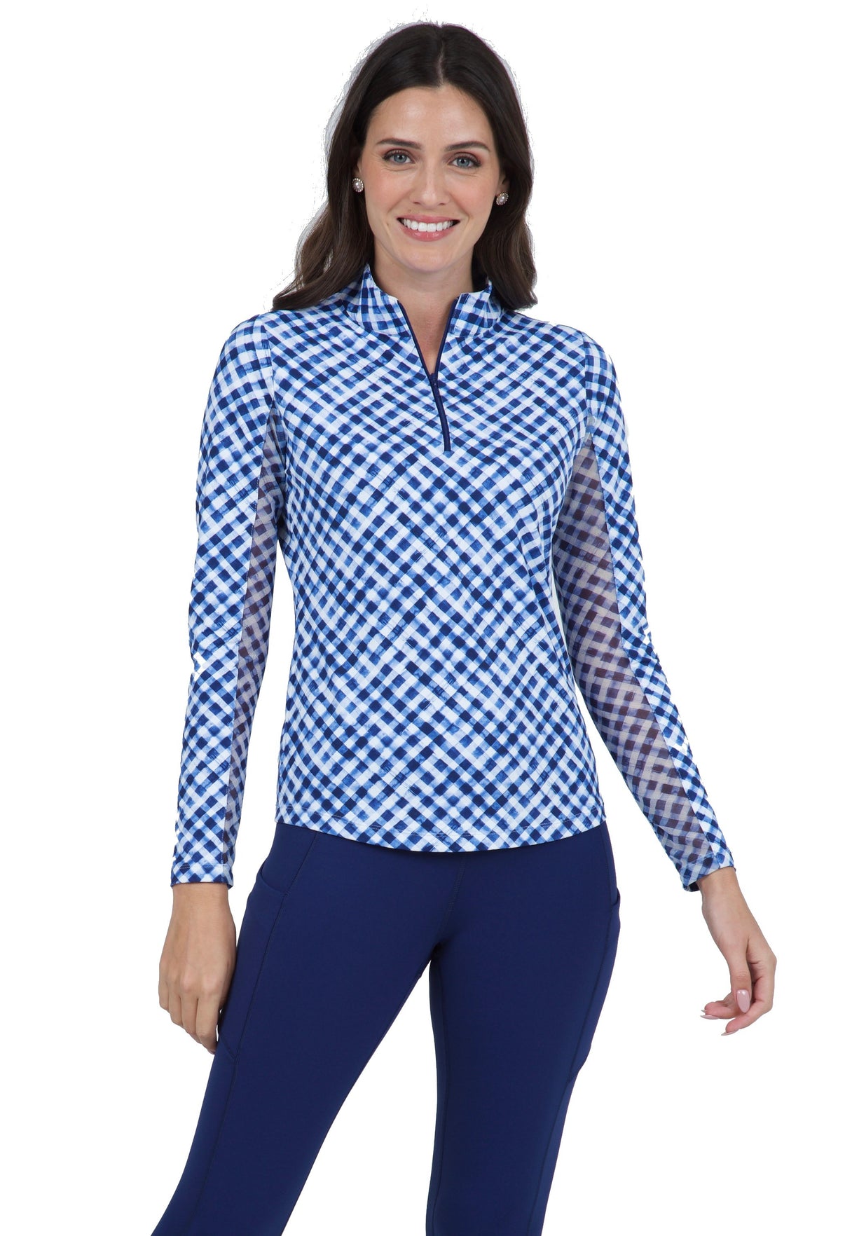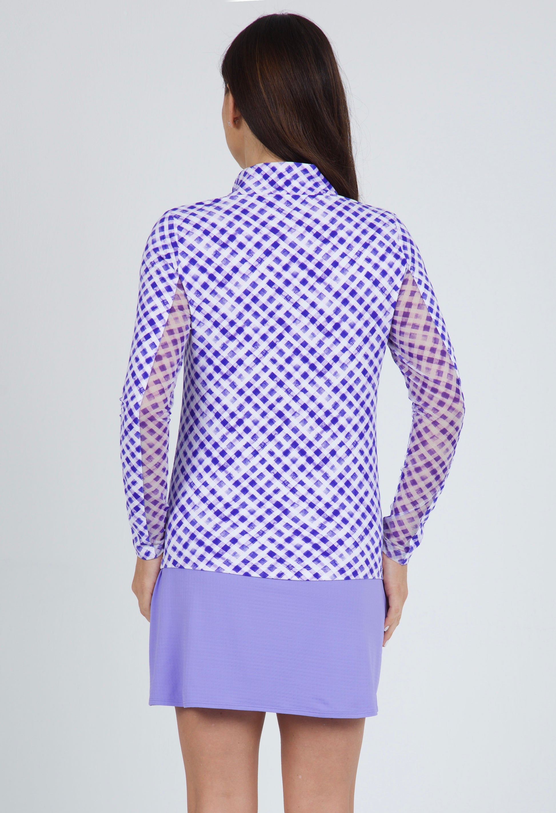 This is our ever-popular Long Sleeve Mock Neck Top in a diagonal Gingham print for a fresh take on the classic pattern. The combination of long sleeves featuring a mesh underarm panels along with Iceƒil® fabric provides sun protection with cooling comfort. Enjoy a fresh feeling all day with moisture-wicking, anti-stink, two-way air circulation and cooling technology.