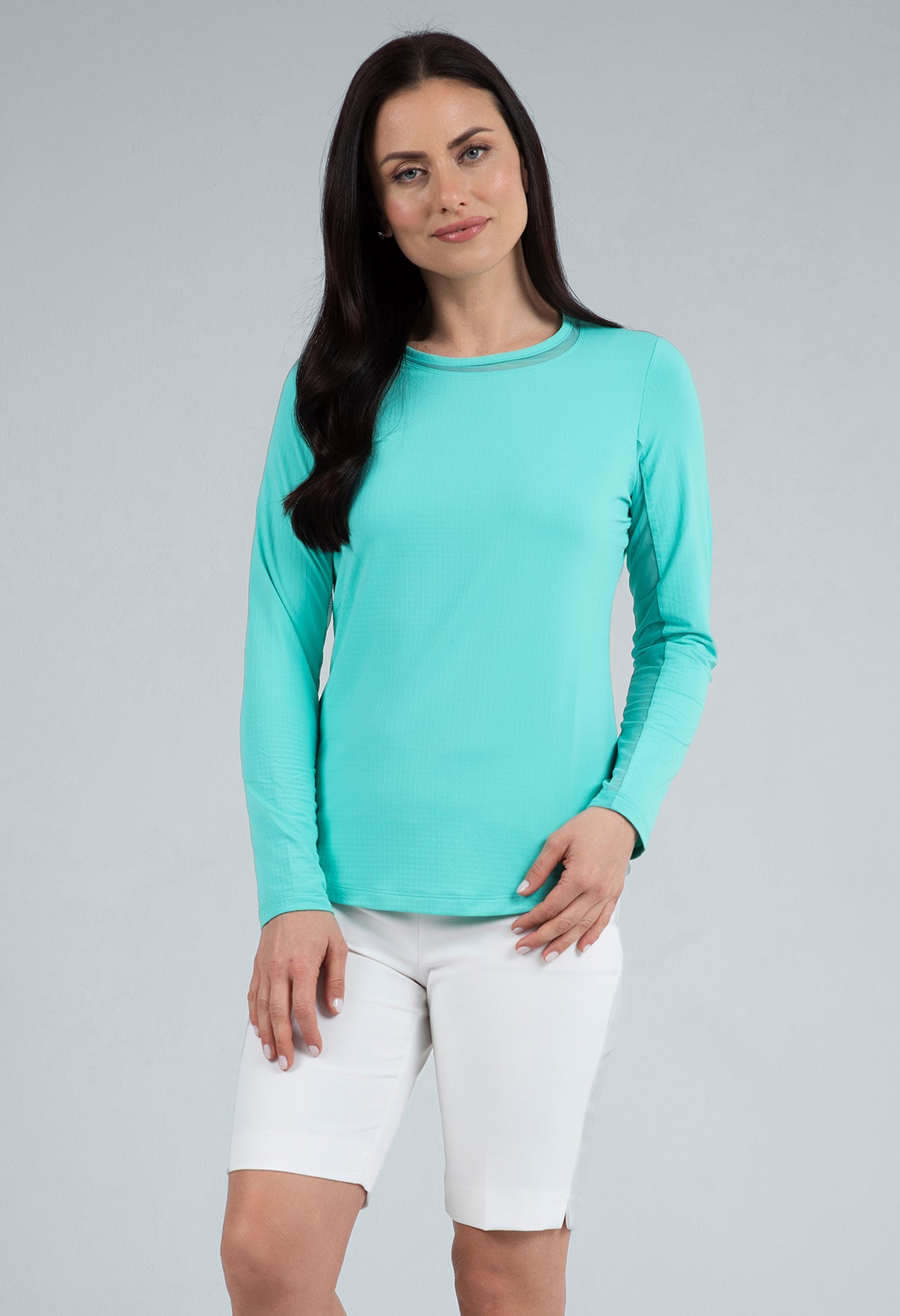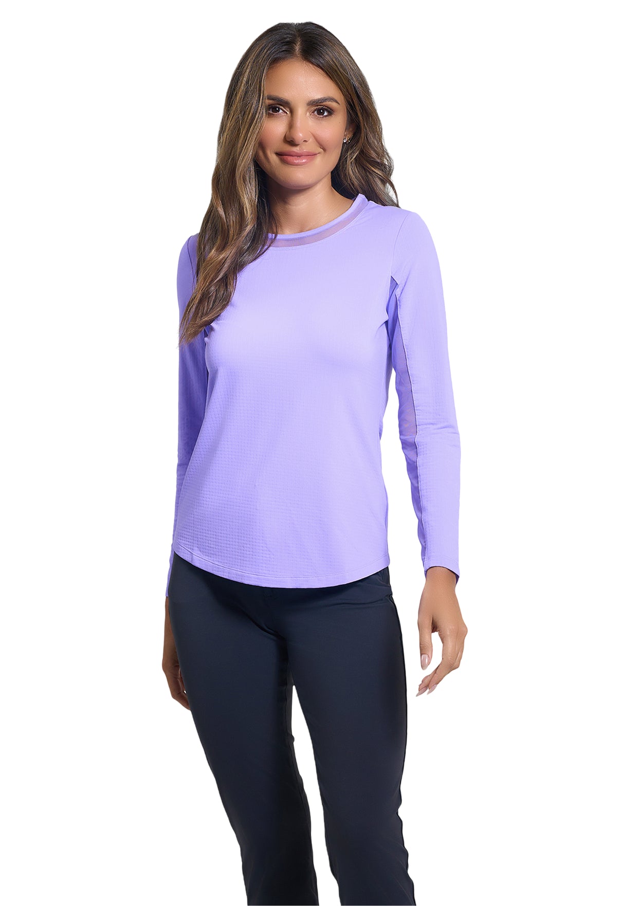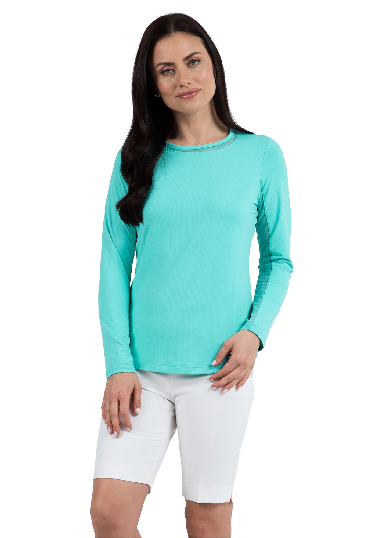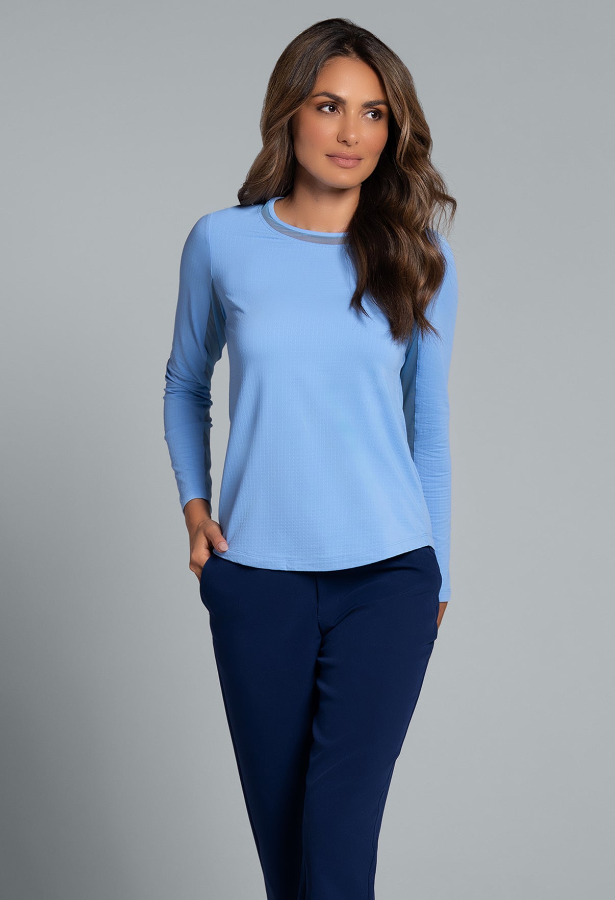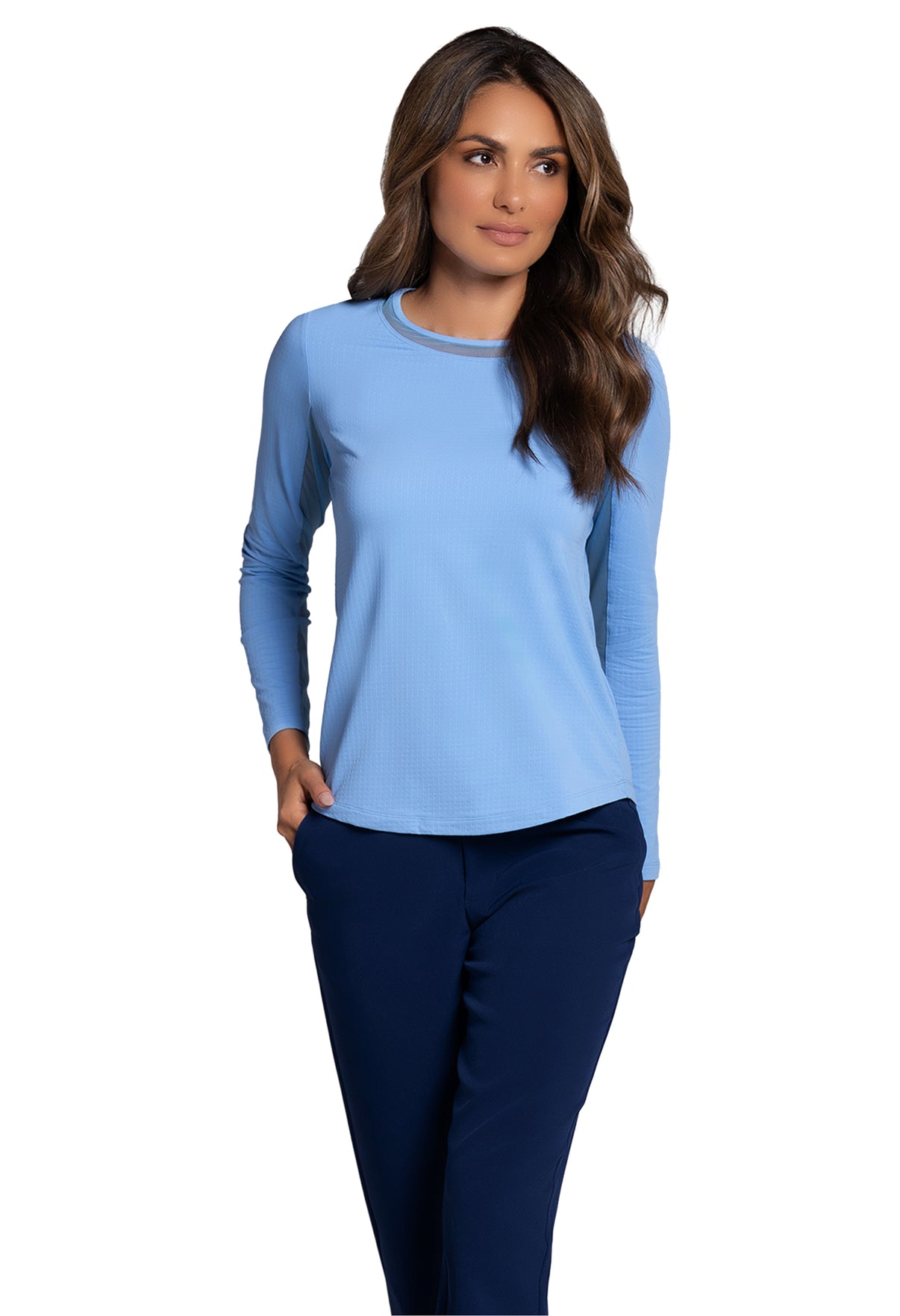 Our updated Long Sleeve Crew Neck Top features a mesh inlay around the neck to complement the under-arm mesh panel, promoting additional comfort and breathability, giving this athleisure top a feminine twist. This silhouette features our patented Iceƒil® cooling technology, converting sweat to refrigerant and cooling your skin up to 5 degrees, keeping you cool and dry on the hottest, most humid days. This garment also features UPF 50+ sun protection, moisture-wicking, and anti-odor properties.