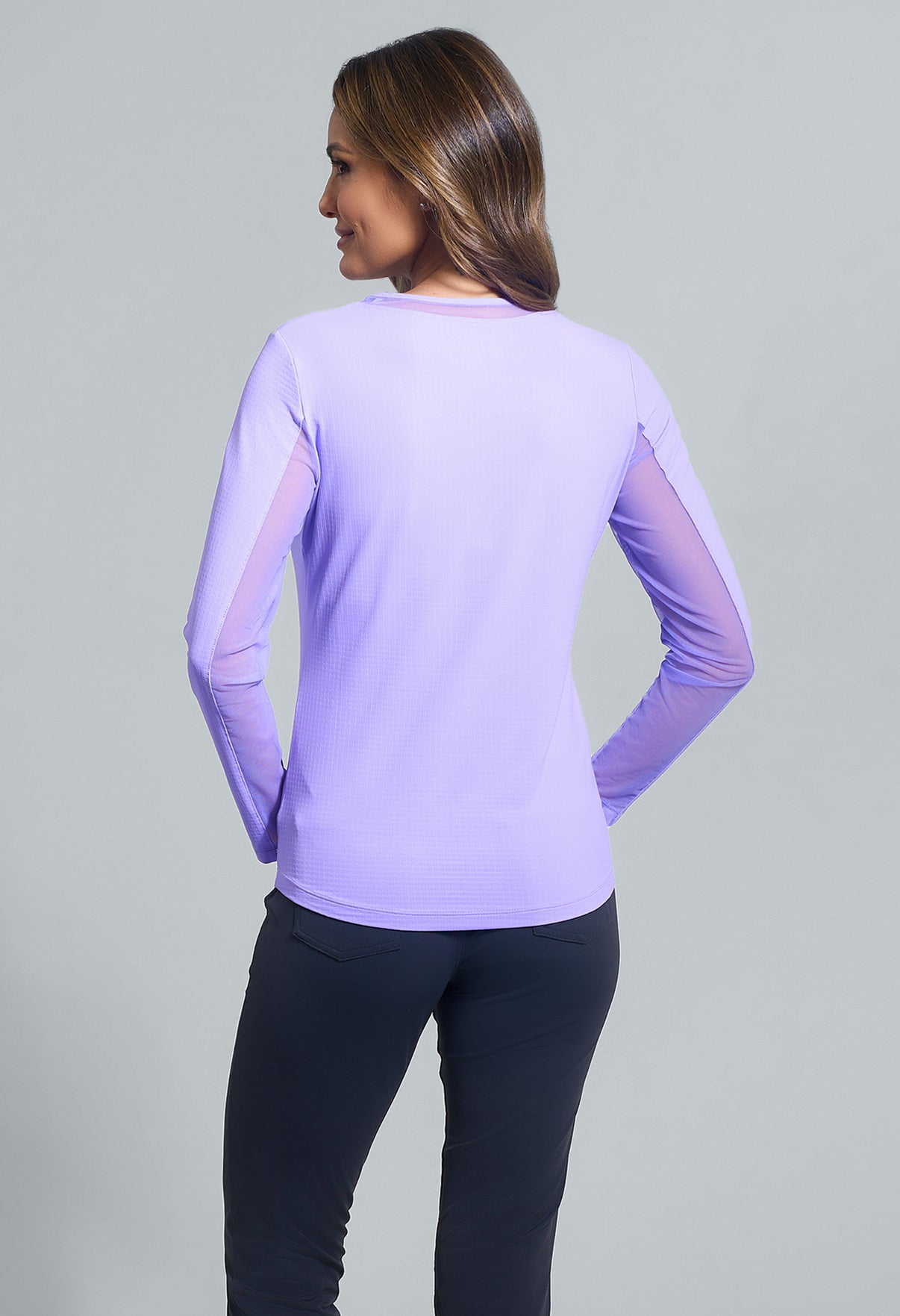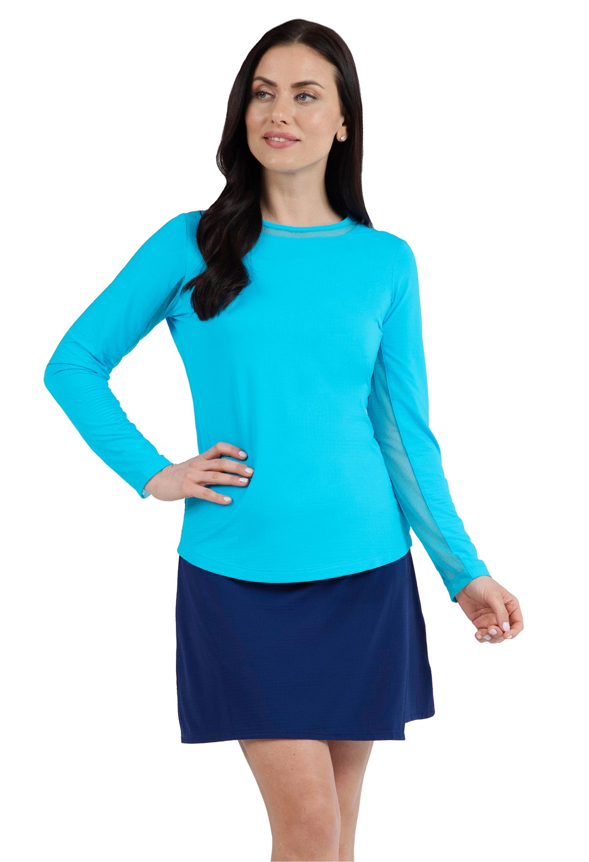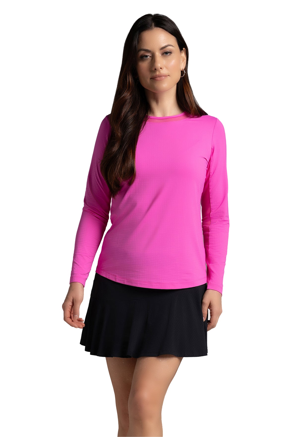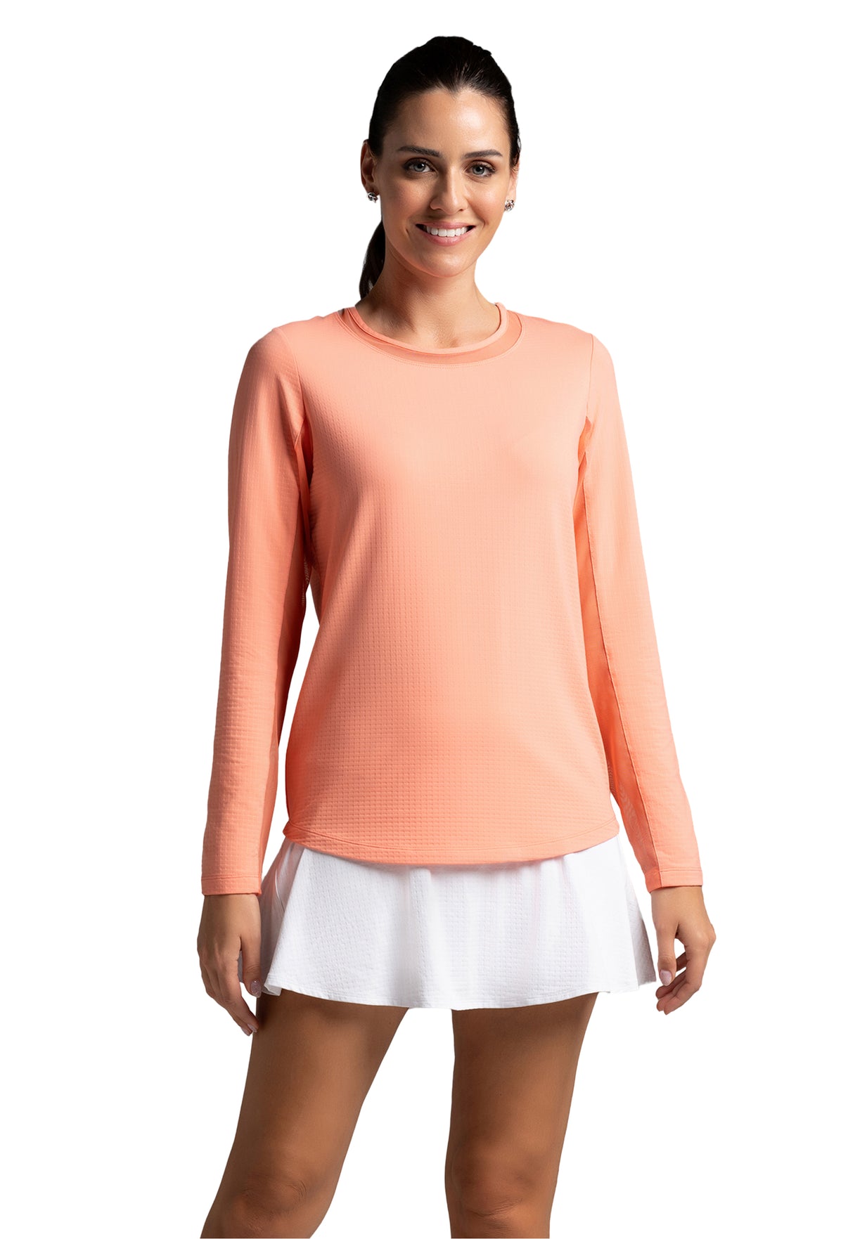 Our updated Long Sleeve Crew Neck Top features a mesh inlay around the neck to complement the under-arm mesh panel, promoting additional comfort and breathability, giving this athleisure top a feminine twist. This silhouette features our patented Iceƒil® cooling technology, converting sweat to refrigerant and cooling your skin up to 5 degrees, keeping you cool and dry on the hottest, most humid days. This garment also features UPF 50+ sun protection, moisture-wicking, and anti-odor properties.