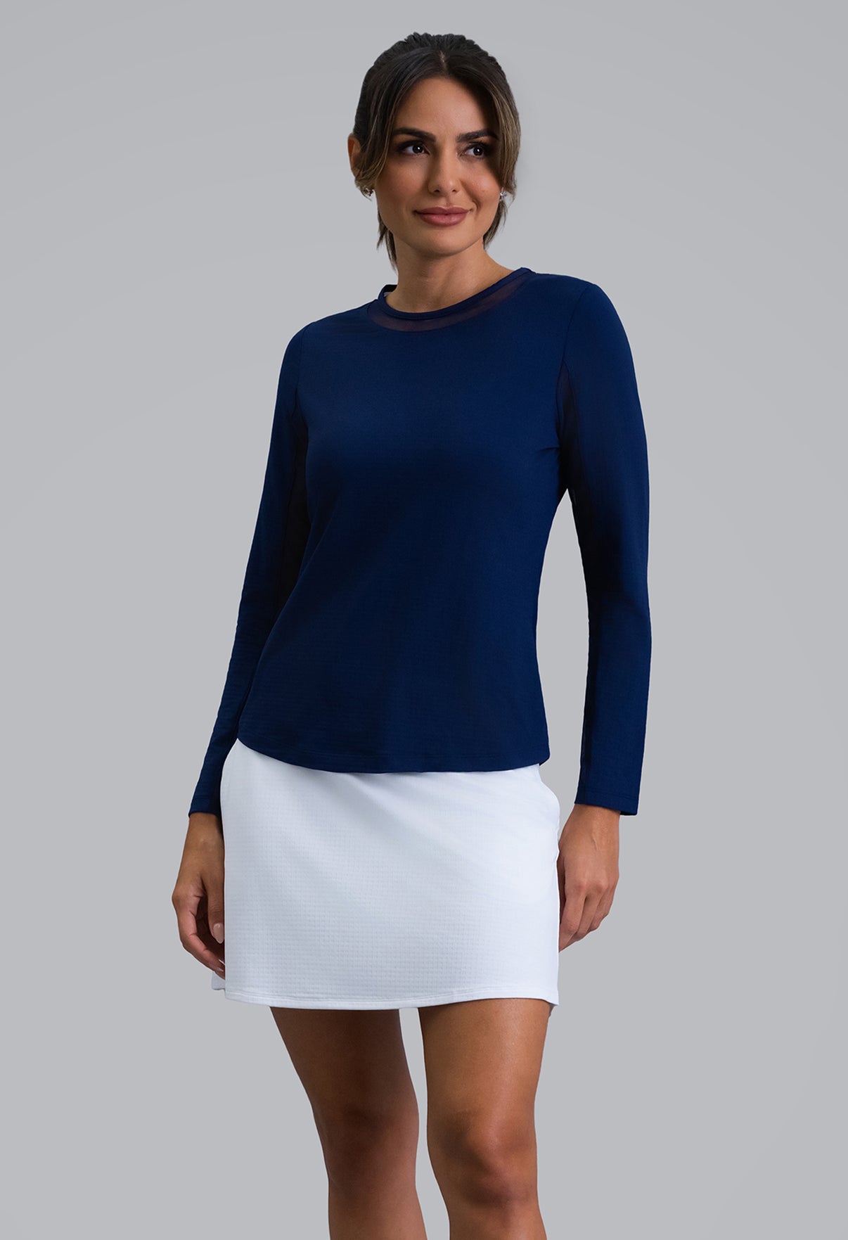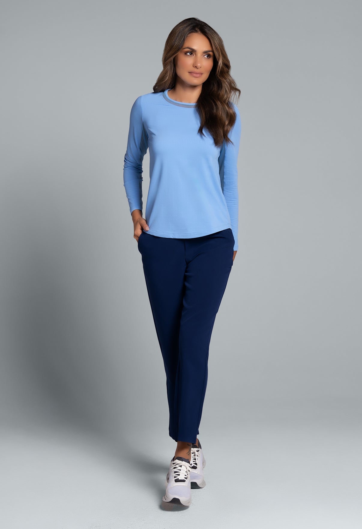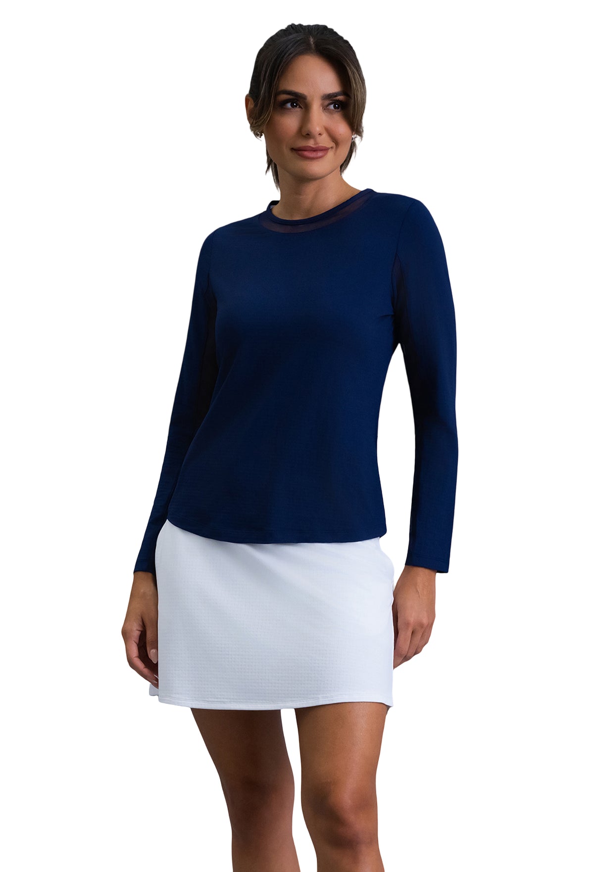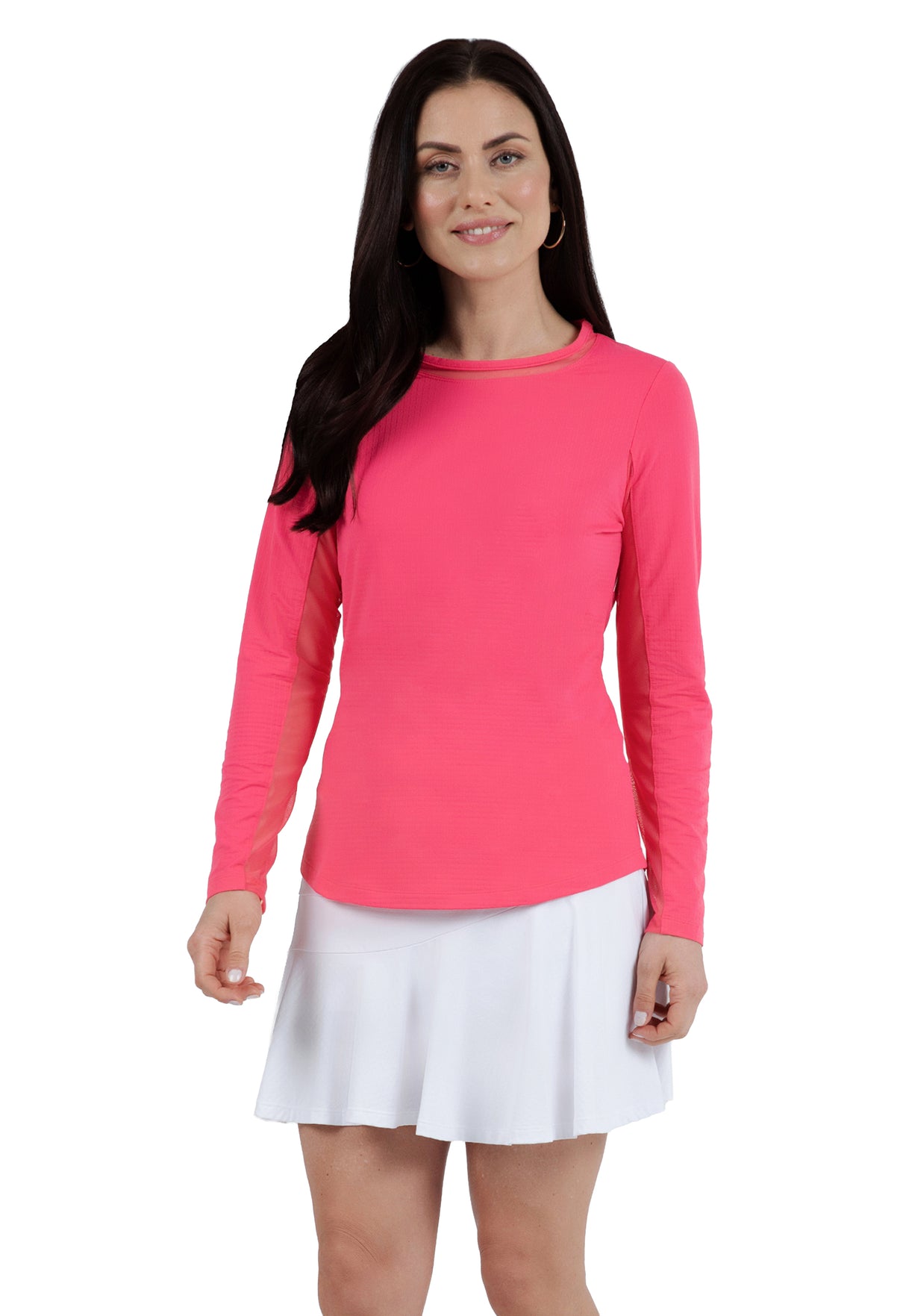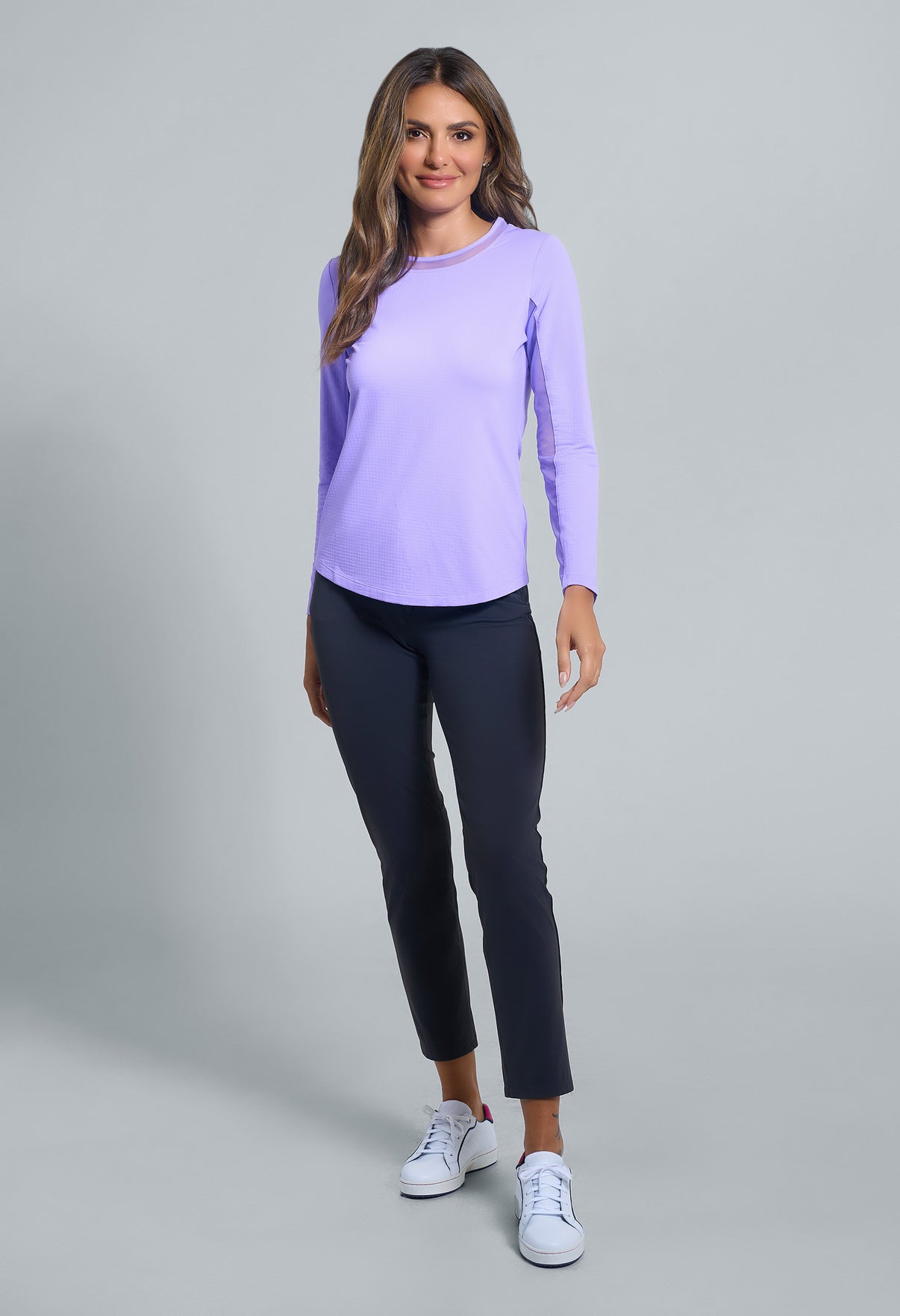 Our updated Long Sleeve Crew Neck Top features a mesh inlay around the neck to complement the under-arm mesh panel, promoting additional comfort and breathability, giving this athleisure top a feminine twist. This silhouette features our patented Iceƒil® cooling technology, converting sweat to refrigerant and cooling your skin up to 5 degrees, keeping you cool and dry on the hottest, most humid days. This garment also features UPF 50+ sun protection, moisture-wicking, and anti-odor properties.