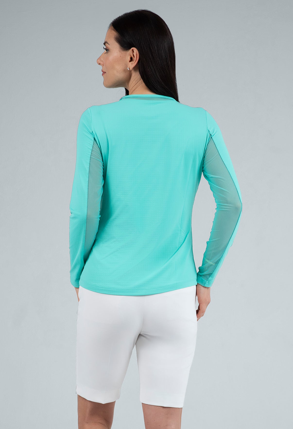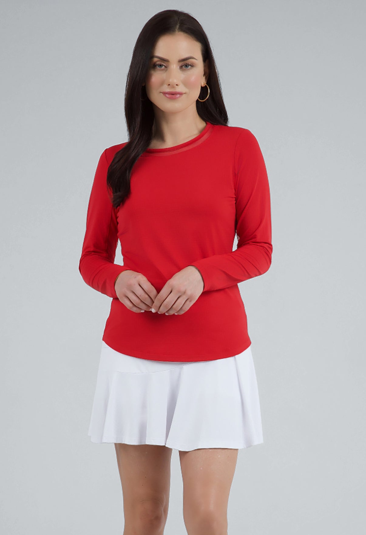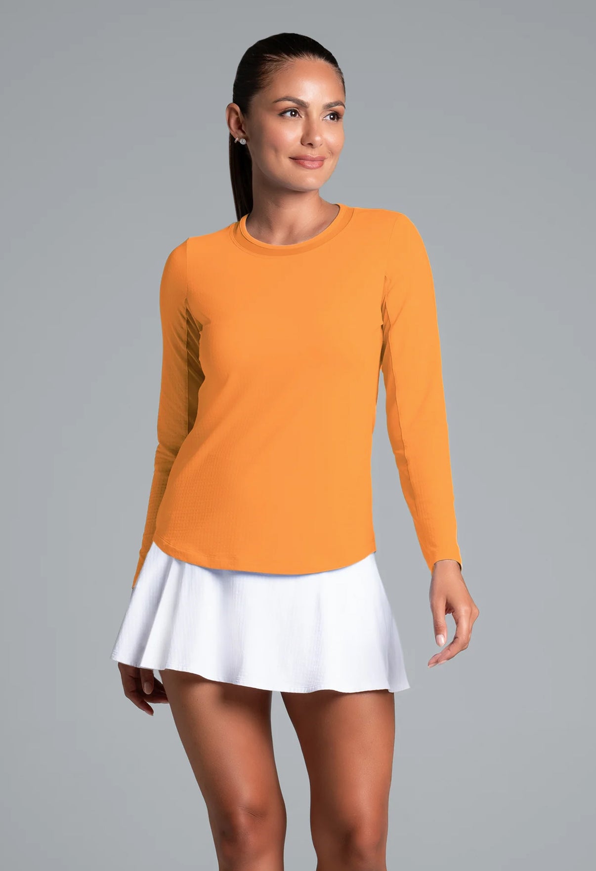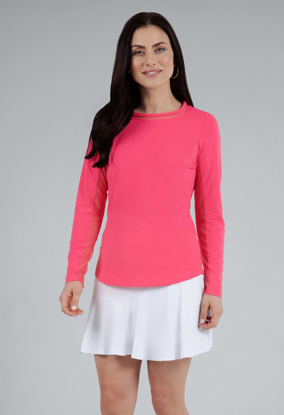 Our updated Long Sleeve Crew Neck Top features a mesh inlay around the neck to complement the under-arm mesh panel, promoting additional comfort and breathability, giving this athleisure top a feminine twist. This silhouette features our patented Iceƒil® cooling technology, converting sweat to refrigerant and cooling your skin up to 5 degrees, keeping you cool and dry on the hottest, most humid days. This garment also features UPF 50+ sun protection, moisture-wicking, and anti-odor properties.