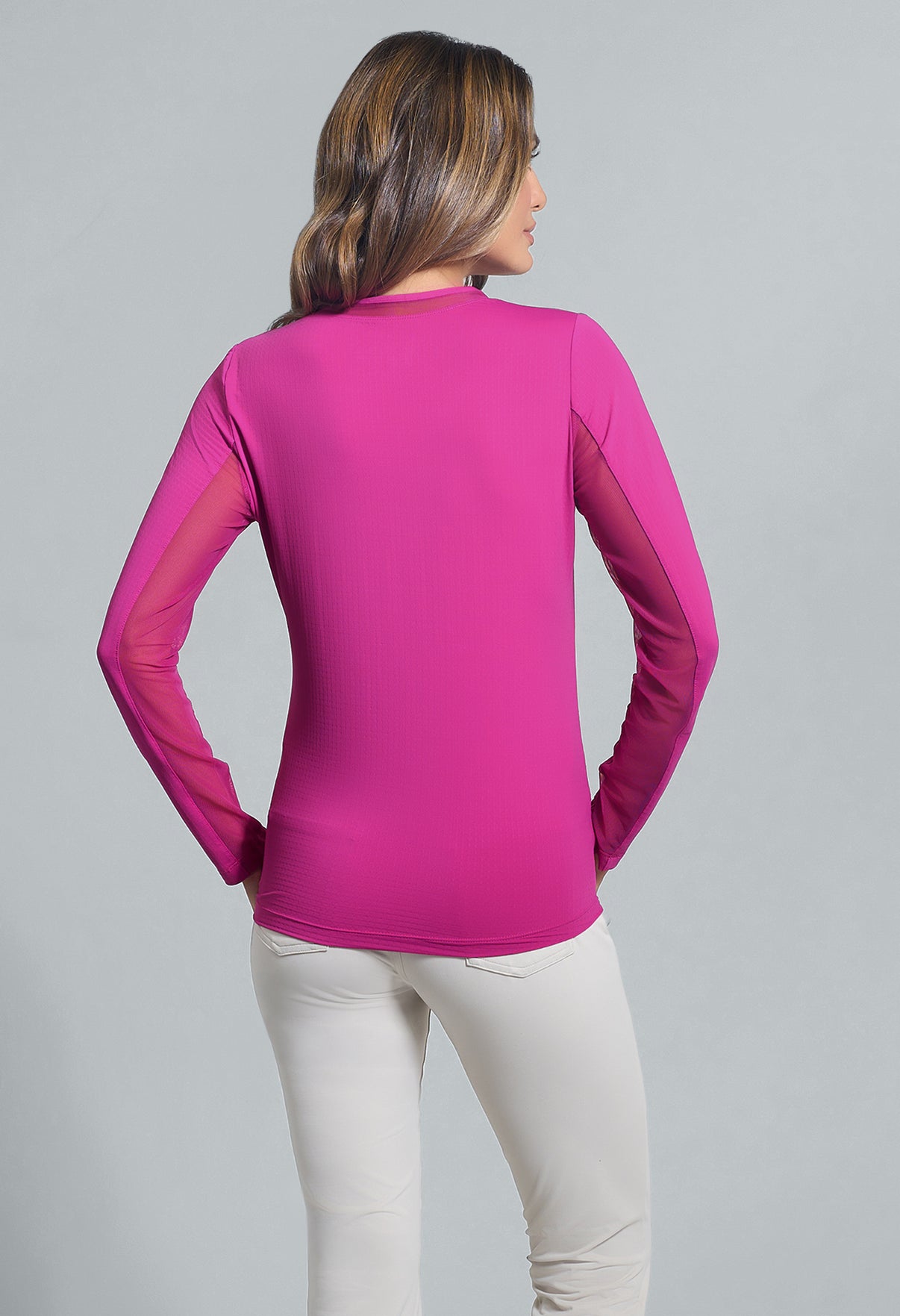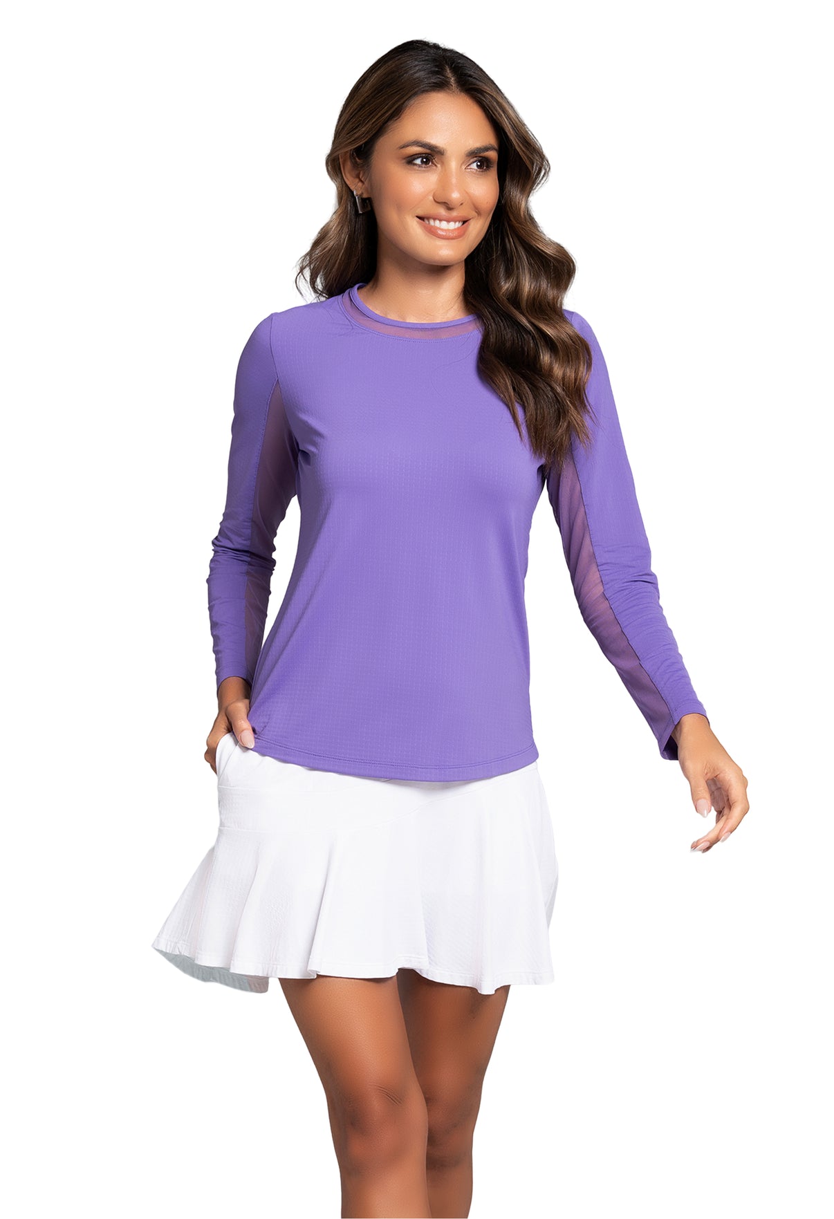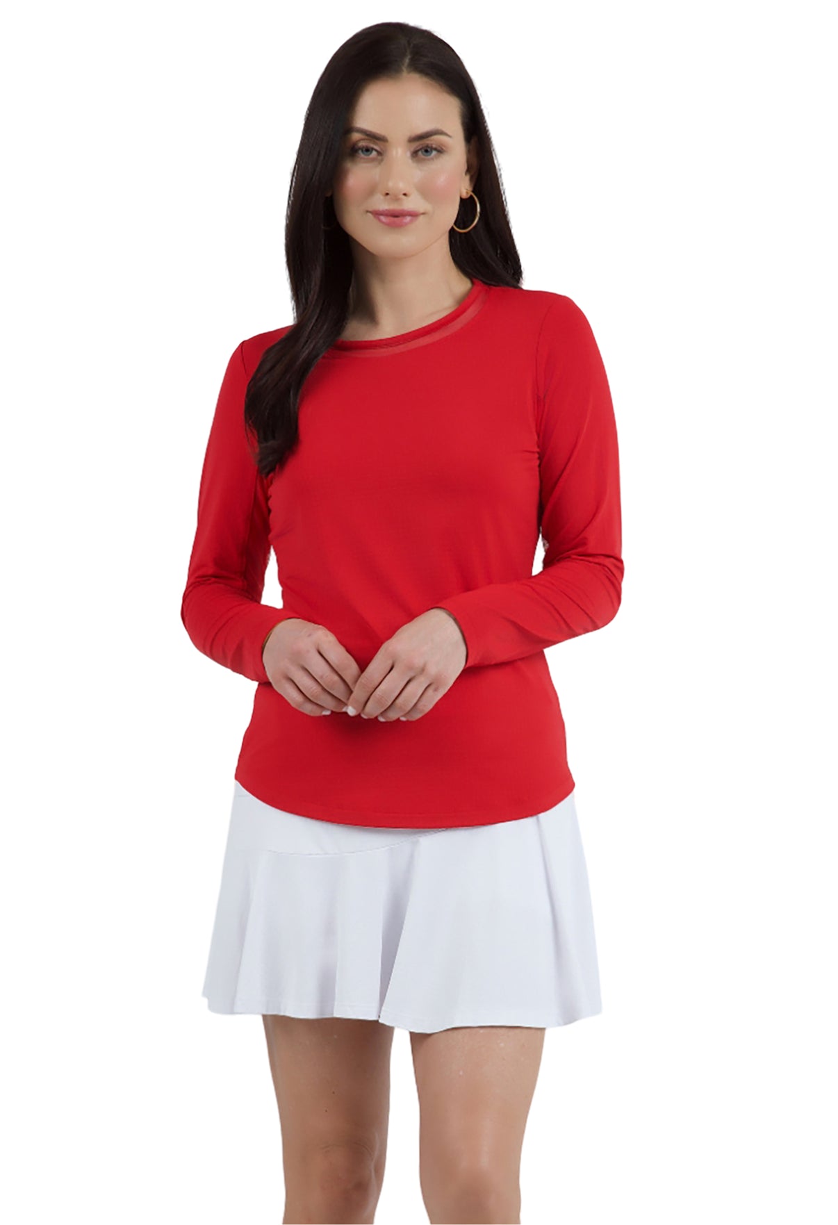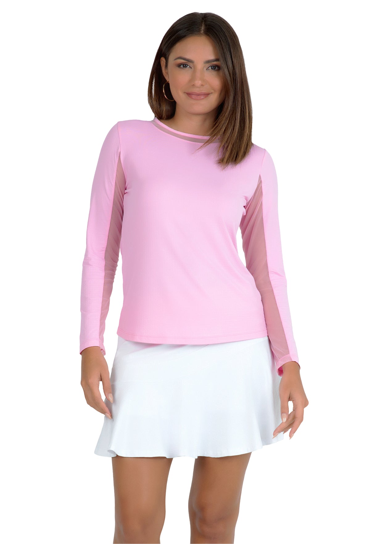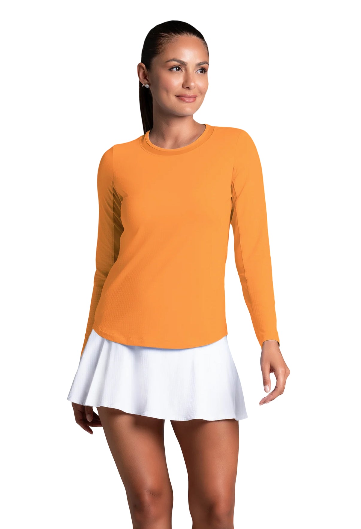 Our updated Long Sleeve Crew Neck Top features a mesh inlay around the neck to complement the under-arm mesh panel, promoting additional comfort and breathability, giving this athleisure top a feminine twist. This silhouette features our patented Iceƒil® cooling technology, converting sweat to refrigerant and cooling your skin up to 5 degrees, keeping you cool and dry on the hottest, most humid days. This garment also features UPF 50+ sun protection, moisture-wicking, and anti-odor properties.