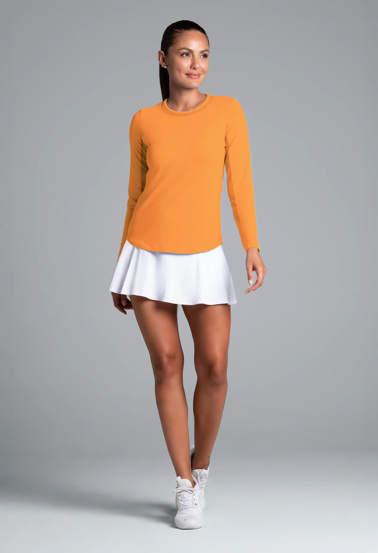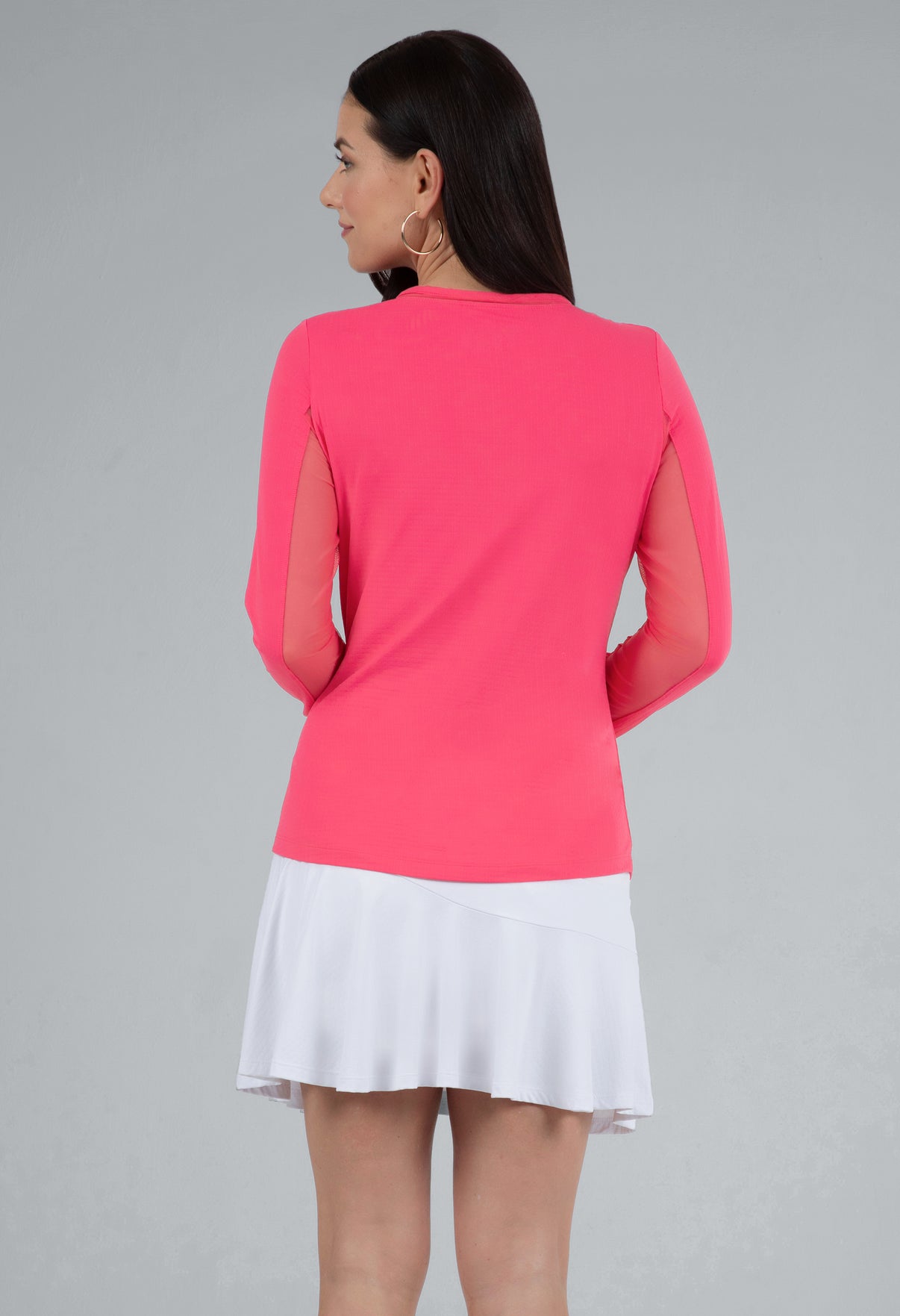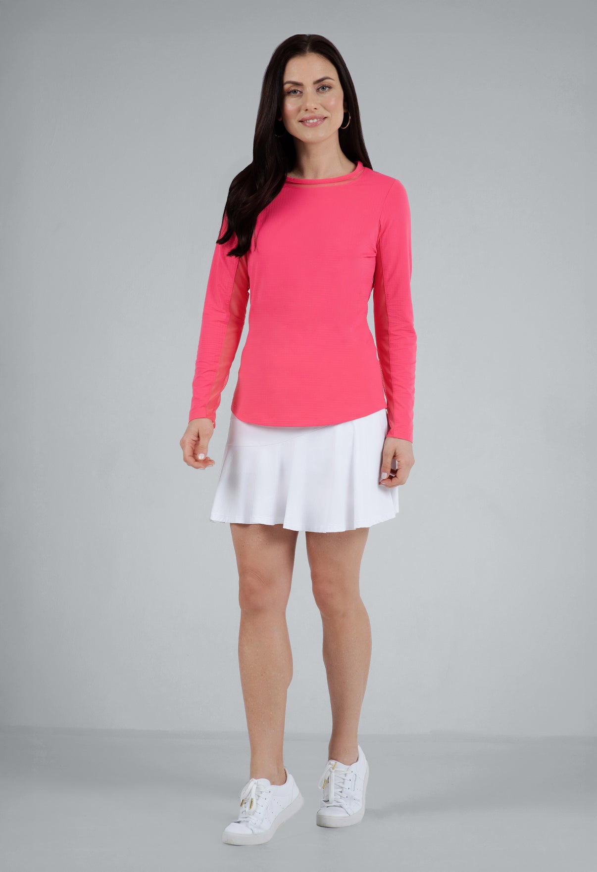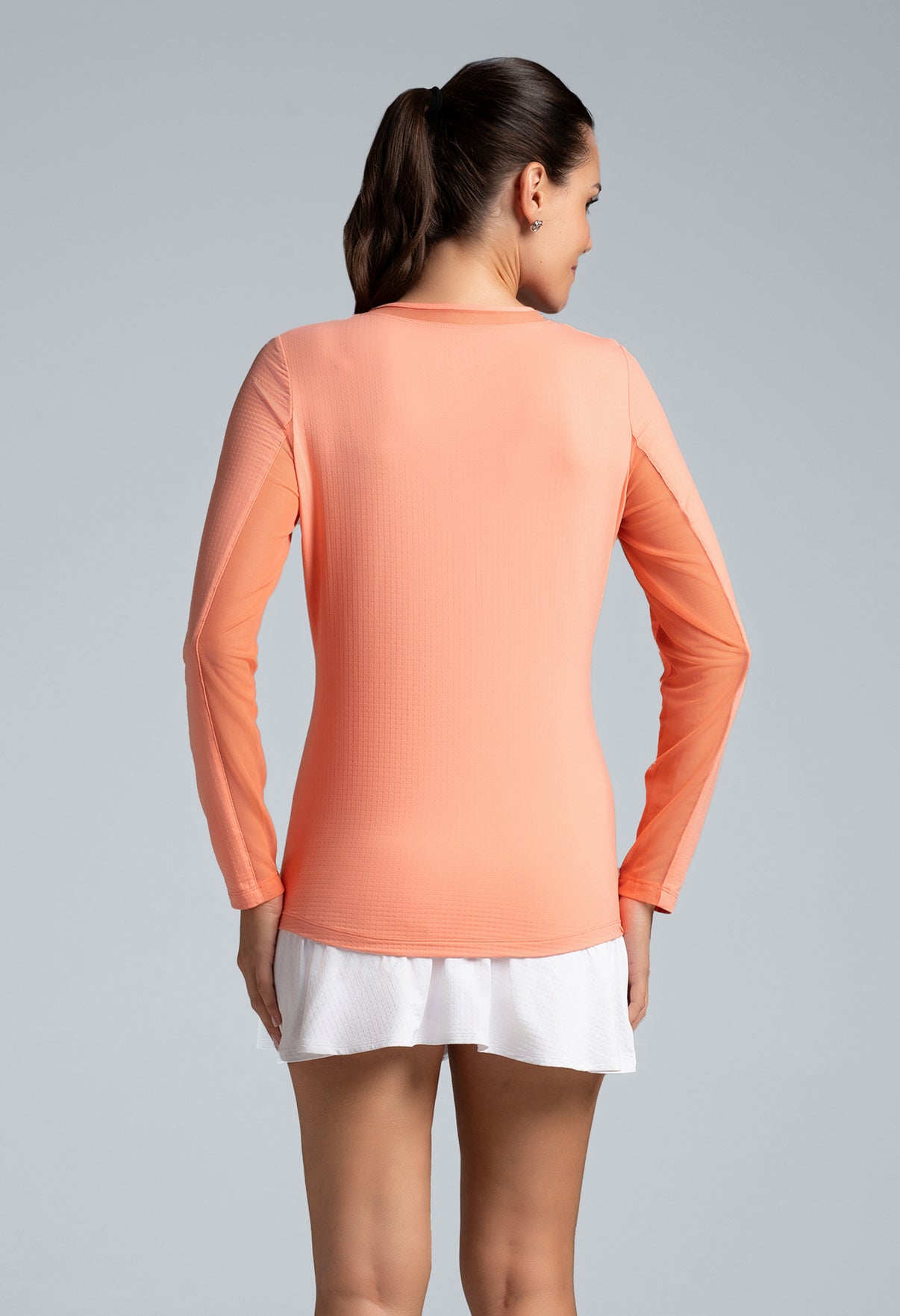 Our updated Long Sleeve Crew Neck Top features a mesh inlay around the neck to complement the under-arm mesh panel, promoting additional comfort and breathability, giving this athleisure top a feminine twist. This silhouette features our patented Iceƒil® cooling technology, converting sweat to refrigerant and cooling your skin up to 5 degrees, keeping you cool and dry on the hottest, most humid days. This garment also features UPF 50+ sun protection, moisture-wicking, and anti-odor properties.