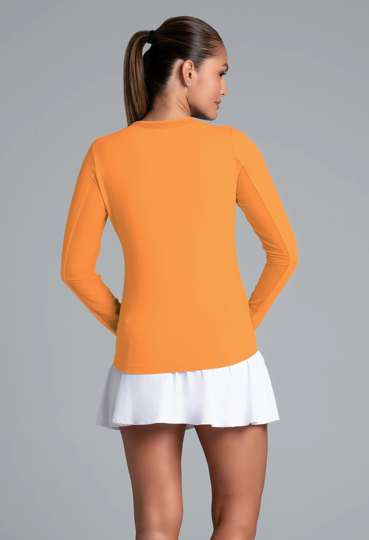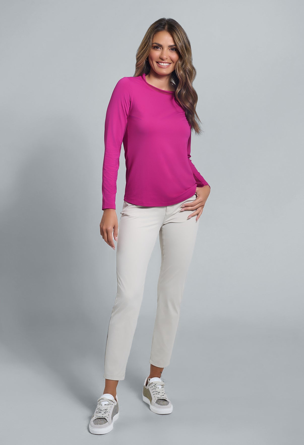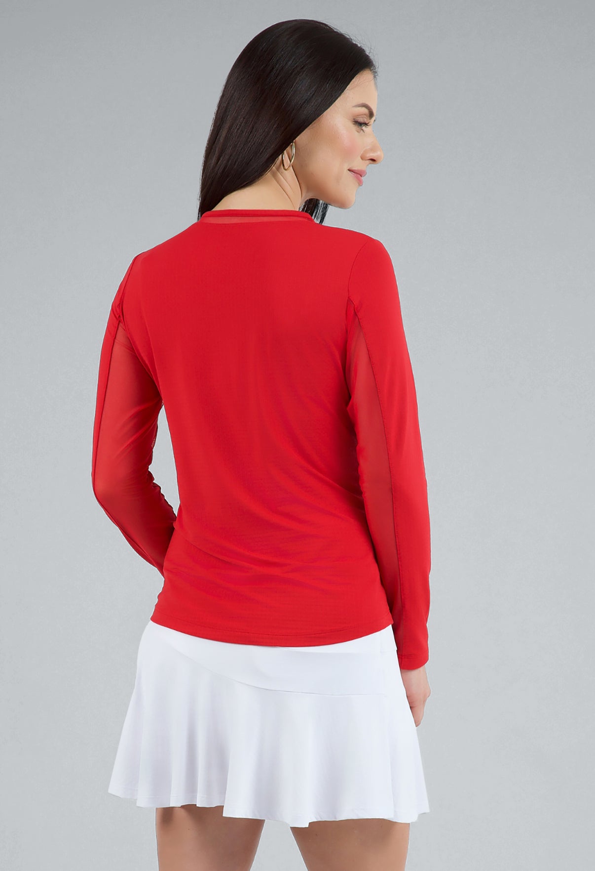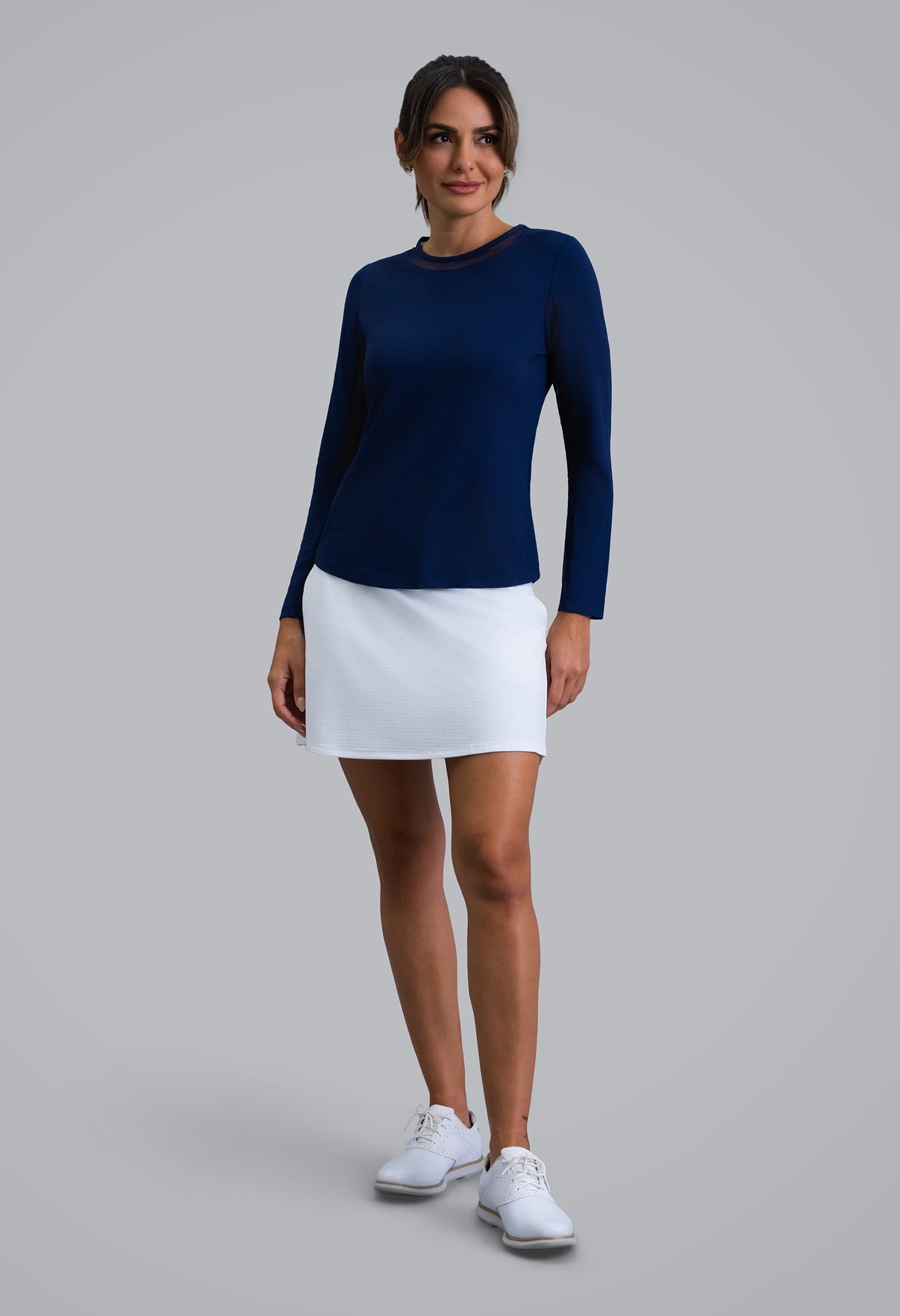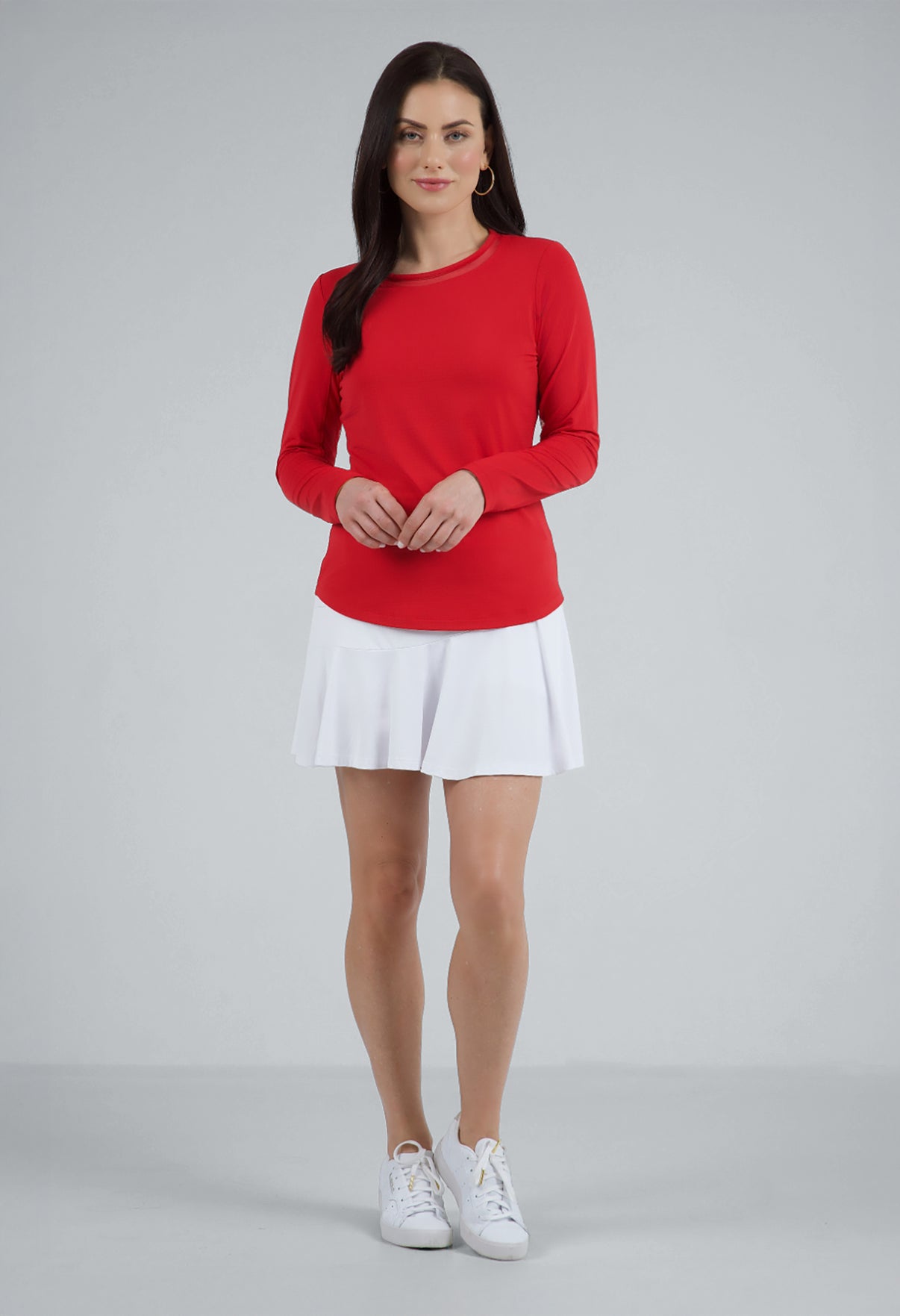 Our updated Long Sleeve Crew Neck Top features a mesh inlay around the neck to complement the under-arm mesh panel, promoting additional comfort and breathability, giving this athleisure top a feminine twist. This silhouette features our patented Iceƒil® cooling technology, converting sweat to refrigerant and cooling your skin up to 5 degrees, keeping you cool and dry on the hottest, most humid days. This garment also features UPF 50+ sun protection, moisture-wicking, and anti-odor properties.