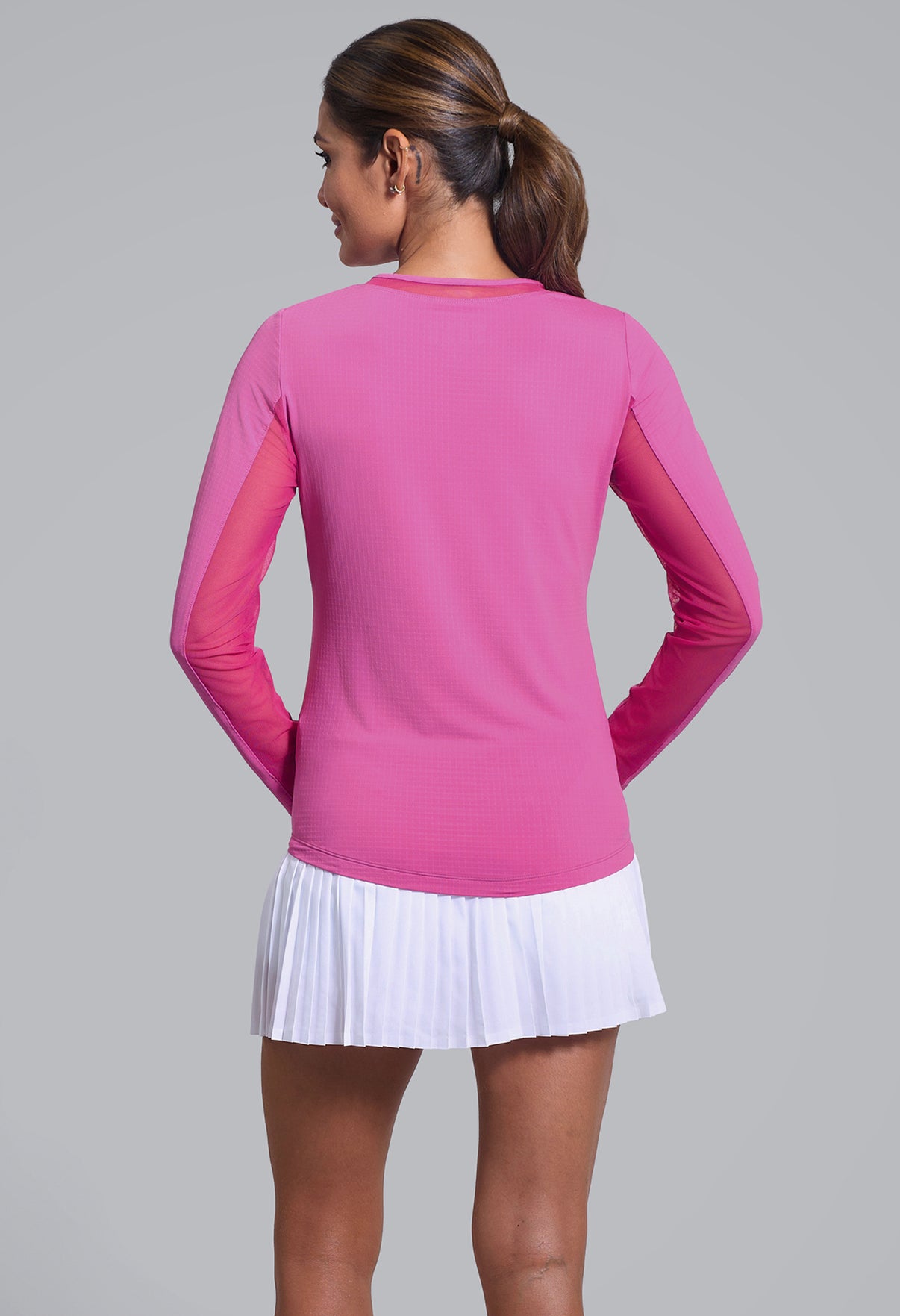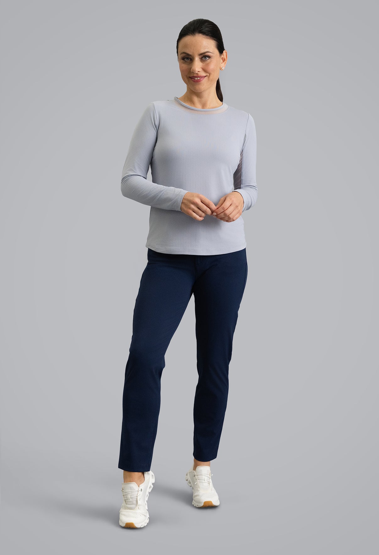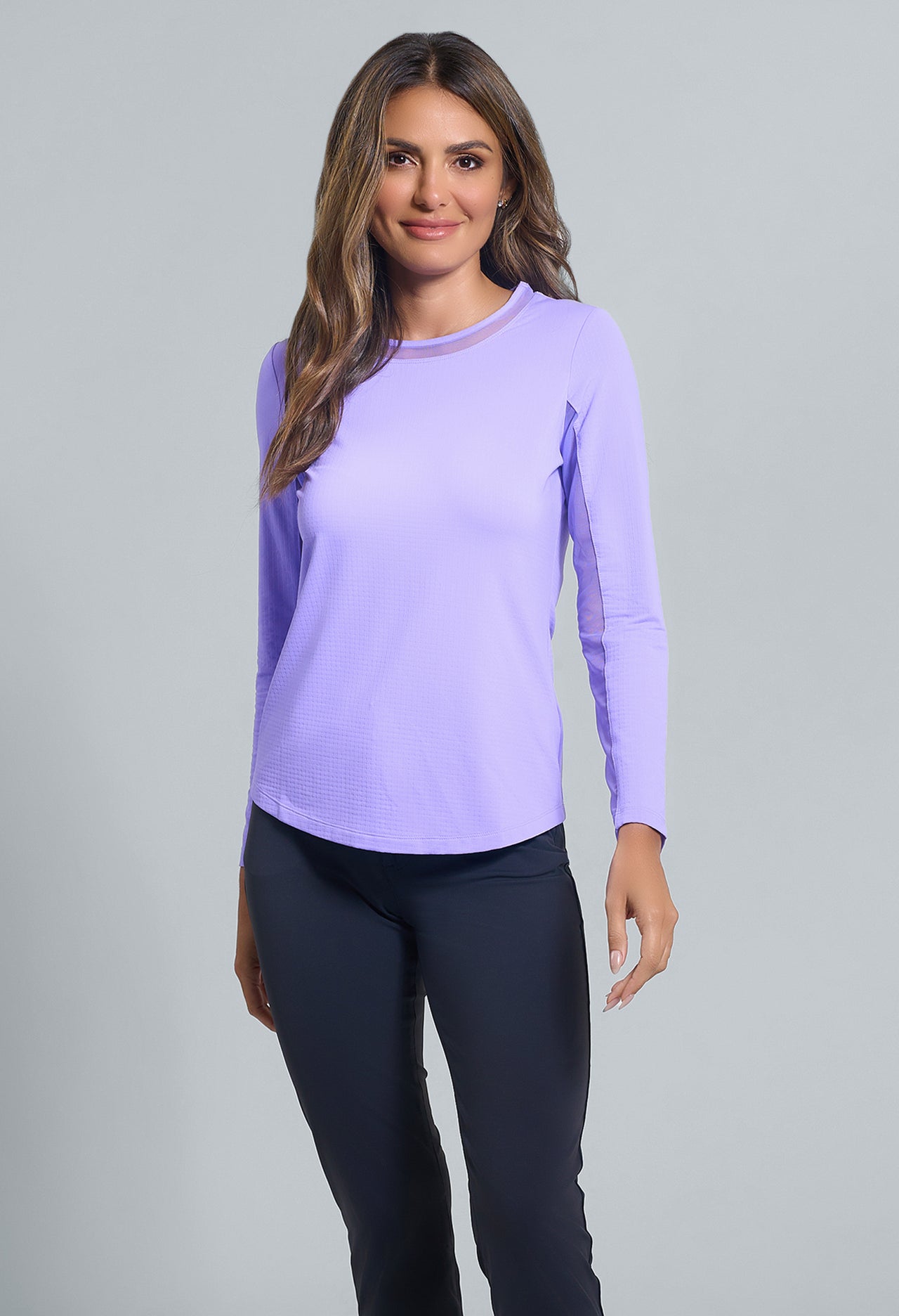 Our updated Long Sleeve Crew Neck Top features a mesh inlay around the neck to complement the under-arm mesh panel, promoting additional comfort and breathability, giving this athleisure top a feminine twist. This silhouette features our patented Iceƒil® cooling technology, converting sweat to refrigerant and cooling your skin up to 5 degrees, keeping you cool and dry on the hottest, most humid days. This garment also features UPF 50+ sun protection, moisture-wicking, and anti-odor properties.
