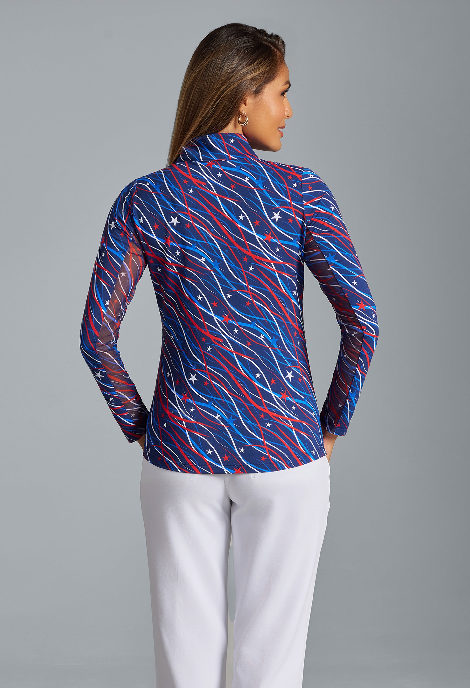 IBKÜL - Patriotic Confetti Print Long Sleeve Mock Neck Top – 10091 - Color: Navy
