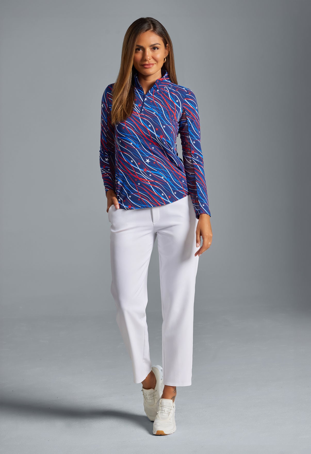 Celebrate in style with the Long Sleeve Mock Neck Top in the Patriotic Confetti Print. Featuring a quarter-zip neckline and breathable mesh panels along the inner sleeves, this top delivers cooling comfort whether you're hitting the course or heading to a holiday gathering. The Patriotic Confetti print swirls with red, white, and blue energy—complete with scattered stars for a festive, all-American feel. Made with patented Iceƒil® cooling technology, UPF 50+ sun protection, moisture-wicking fabric, and anti-odor properties, this top keeps you cool, dry, and spirited all day long.