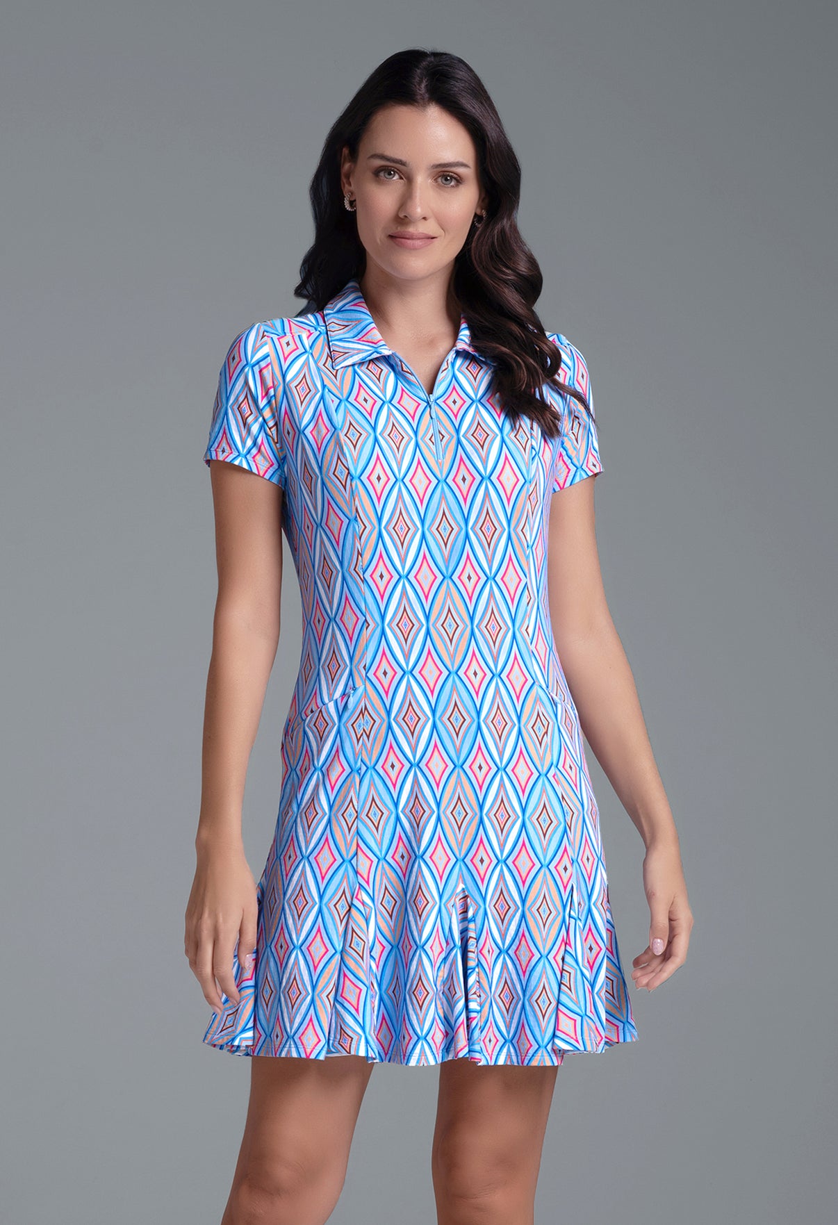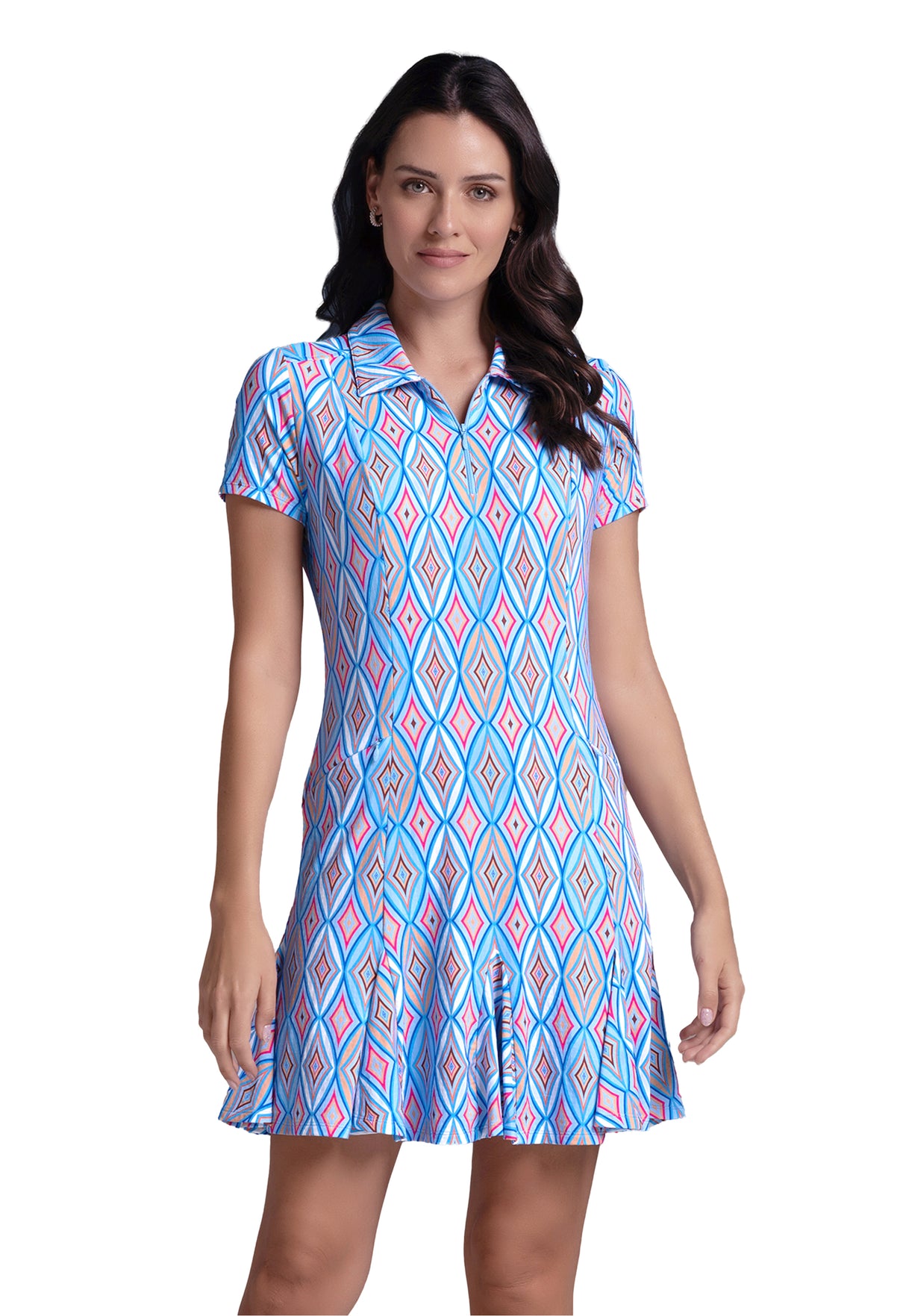 Make a bold entrance on or off the course with the Short Sleeve Godet Dress in the Romina Print. This flattering polo-style dress features a short front zipper, tailored sleeves, and a flared godet hem that moves effortlessly with you. Hidden zipper pockets at the front offer functional storage without disrupting the sleek silhouette. The Romina print showcases a striking diamond pattern that adds energy and modern flair. Made with patented Iceƒil® cooling technology, UPF 50+ sun protection, moisture-wicking fabric, and anti-odor properties, this dress keeps you cool, dry, and confidently styled from the first swing to post-game plans.