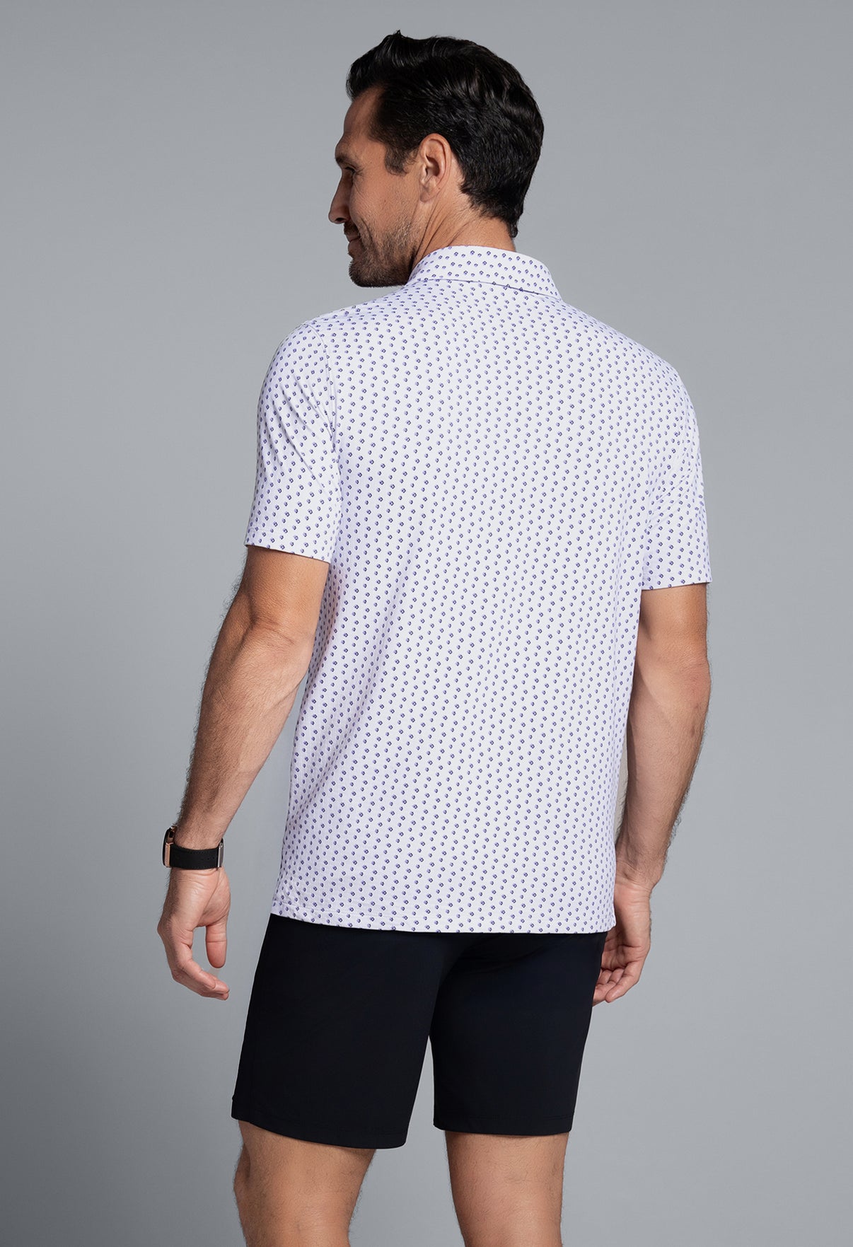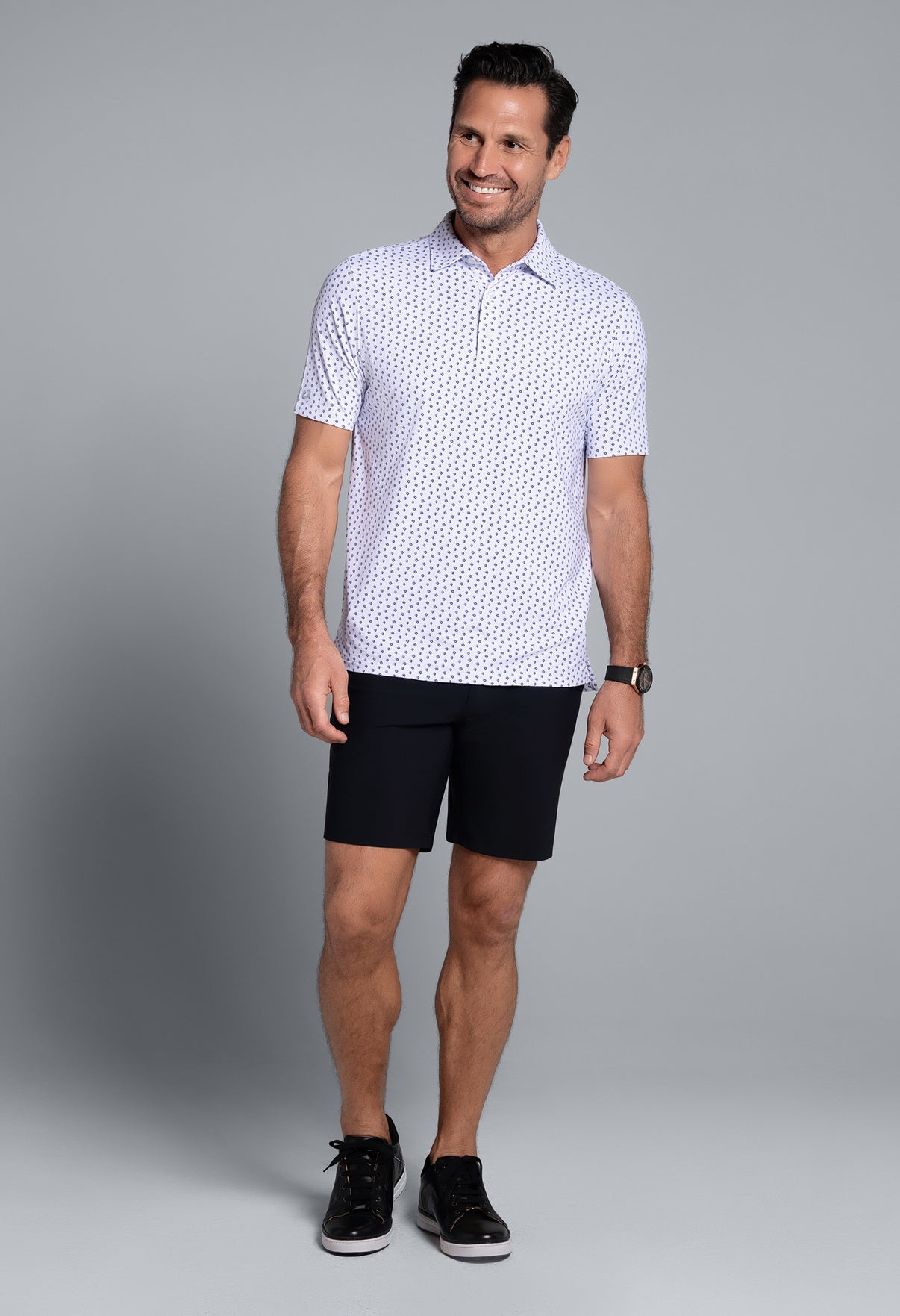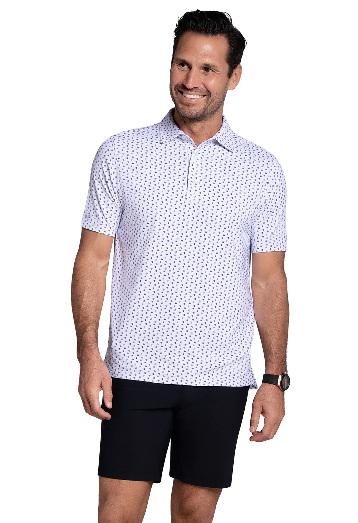 Subtle, sharp, and endlessly wearable. The Scattered Shadow Polo features a refined geometric motif across a crisp white background—perfect for elevating your everyday look without overdoing it. Crafted from soft, light, and breathable Iceƒil® fabric, this performance polo cools your skin by up to five degrees, wicks moisture, and keeps odor at bay with anti-stink tech. Finished with UPF 50+ sun protection, it’s designed to keep you looking—and feeling—good.