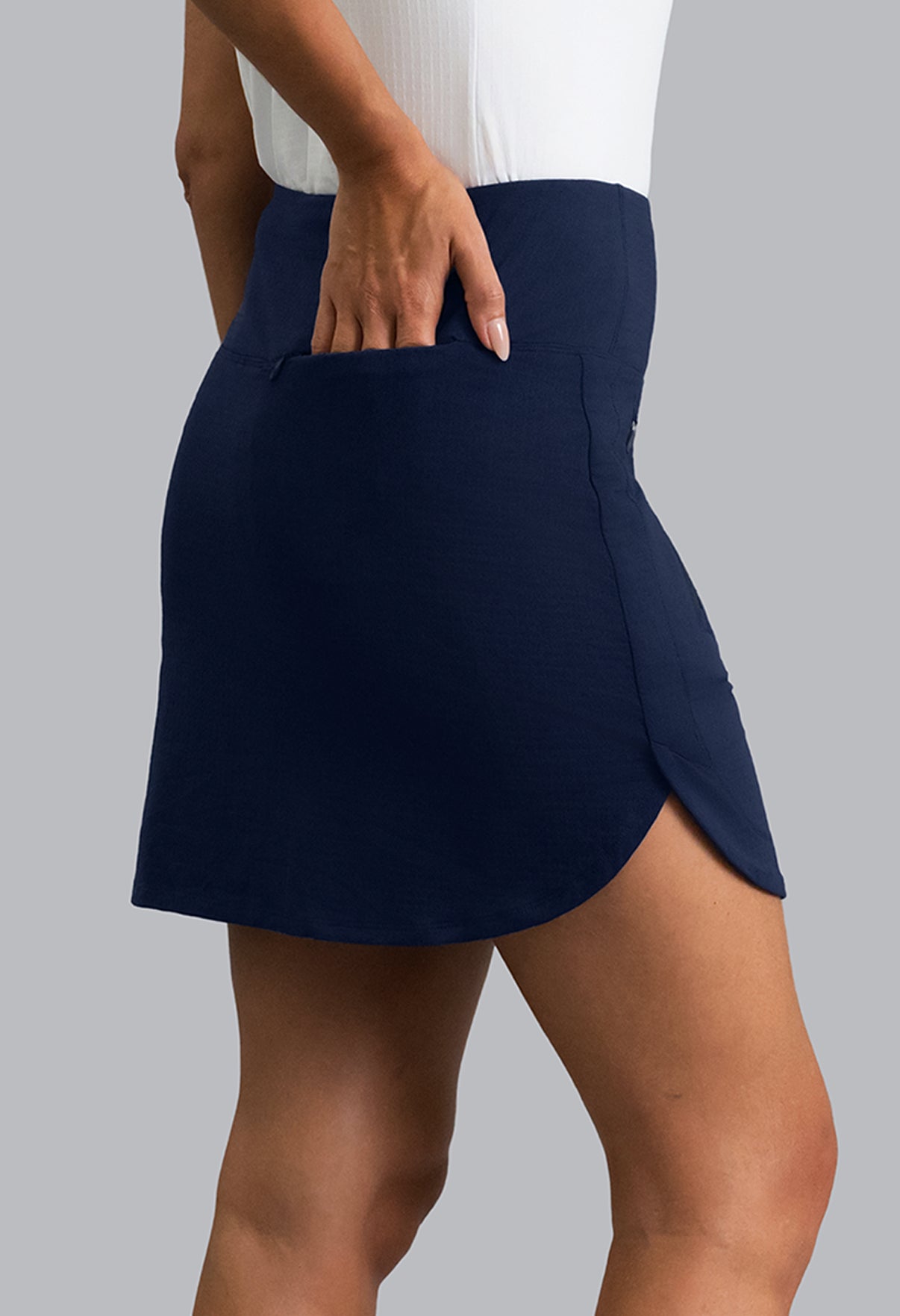 This skort provides ultimate style, comfort, and mobility for all your golf or leisure activities. We have your needs matched to a "T" with two loops on the left side to hold your tees while you make your way to the next hole. Zip pockets on the front, an invisible zip pocket on the right rear hip, along with two more pockets on the inner short liner secures all your needed belongings. The buttery soft, stretchy, patented Iceƒil® cooling technology fabric lowers your skin temperature up to 5 degrees while protecting you from the sun's harmful UV rays. UPF 50+ sun protection, wicking, and anti-odor features allow plenty of airflow to keep you cool, dry, and comfortable on hot, humid days.