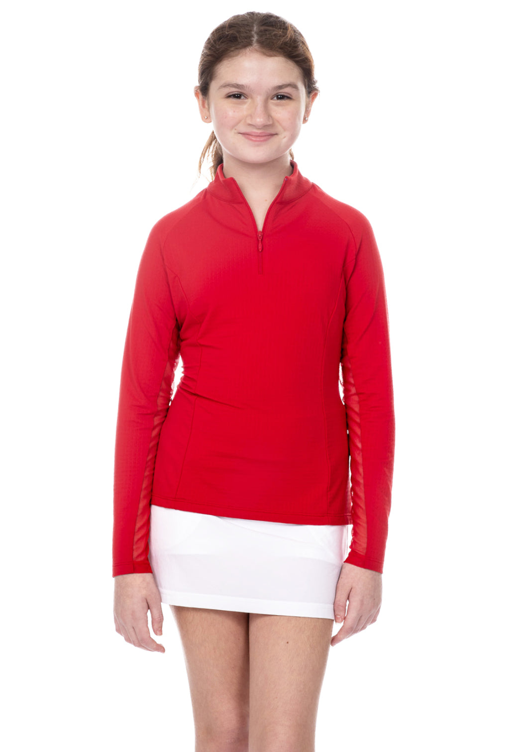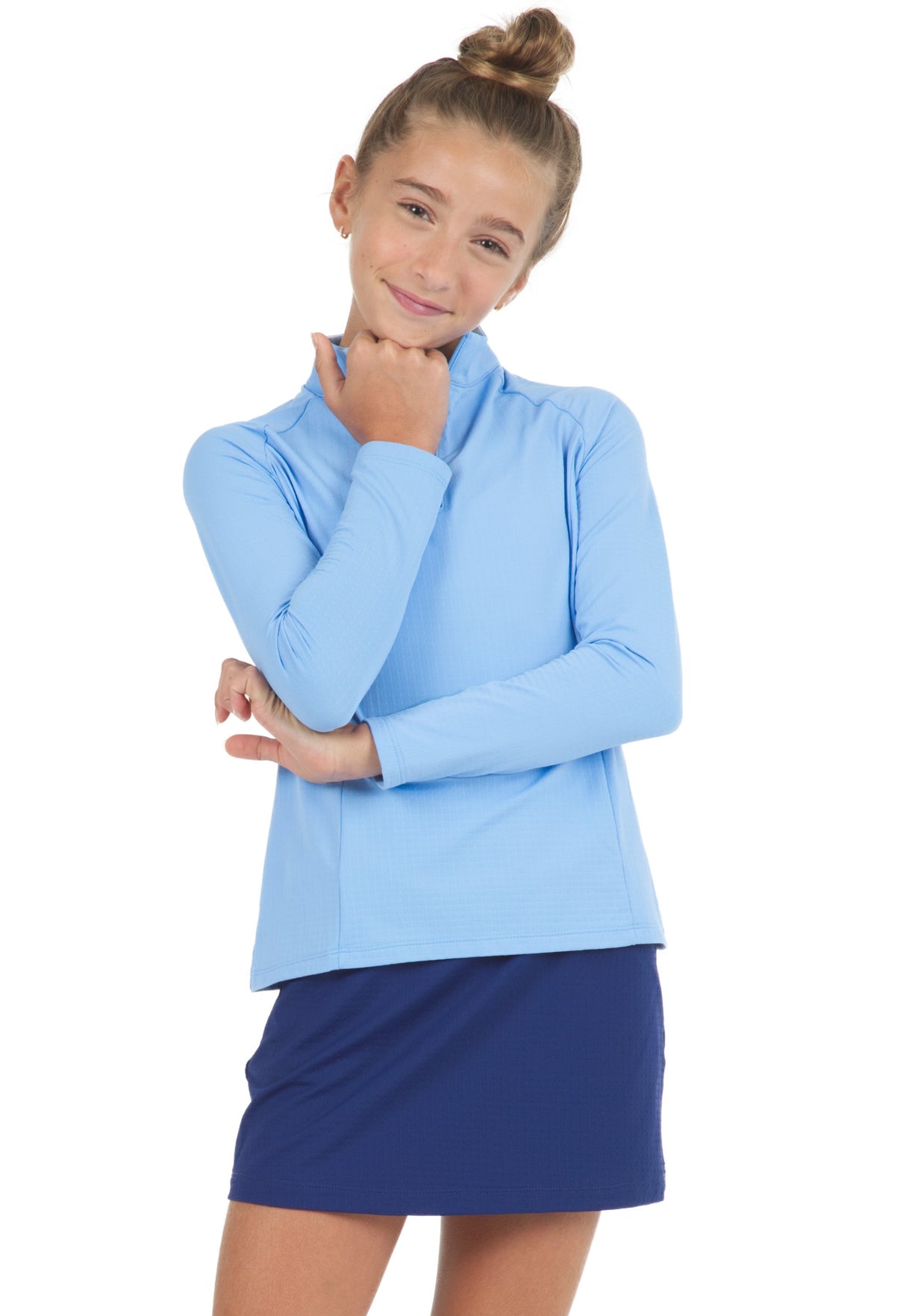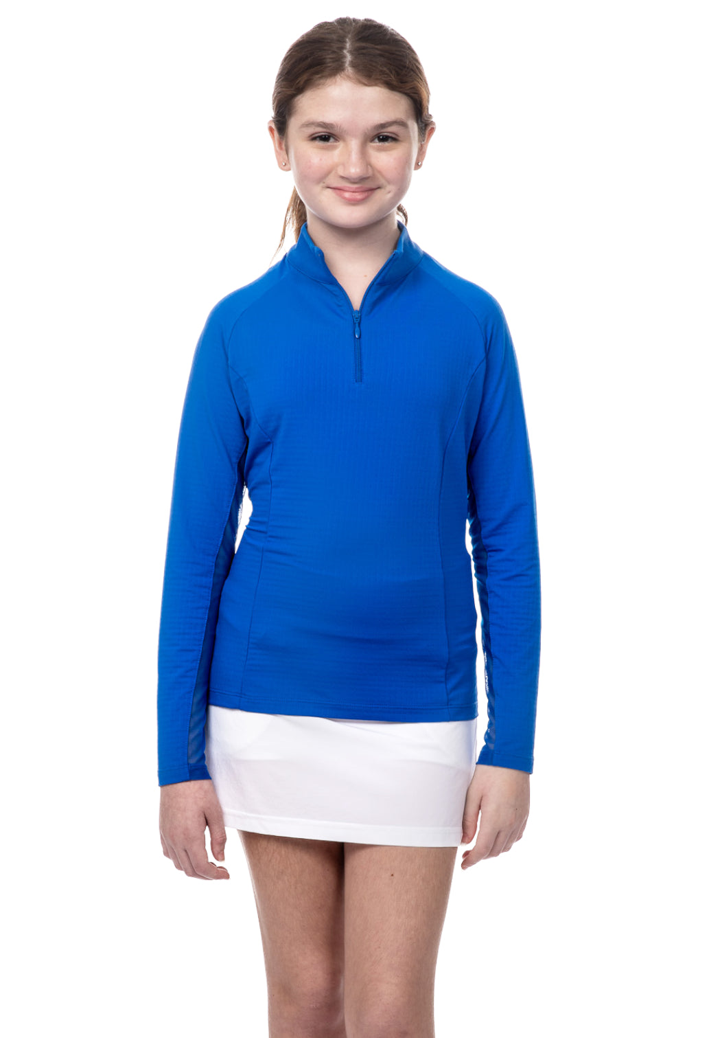 Our Girl's Long Sleeve Zip Mock Neck is available in blue, navy, peri, red, white and hot pink. It features our patented IceFil technology fabric which works by converting sweat to refrigerant; cooling your skin 3 to 5 degrees, allowing you to be cool, comfortable and dry on the hottest humid days.