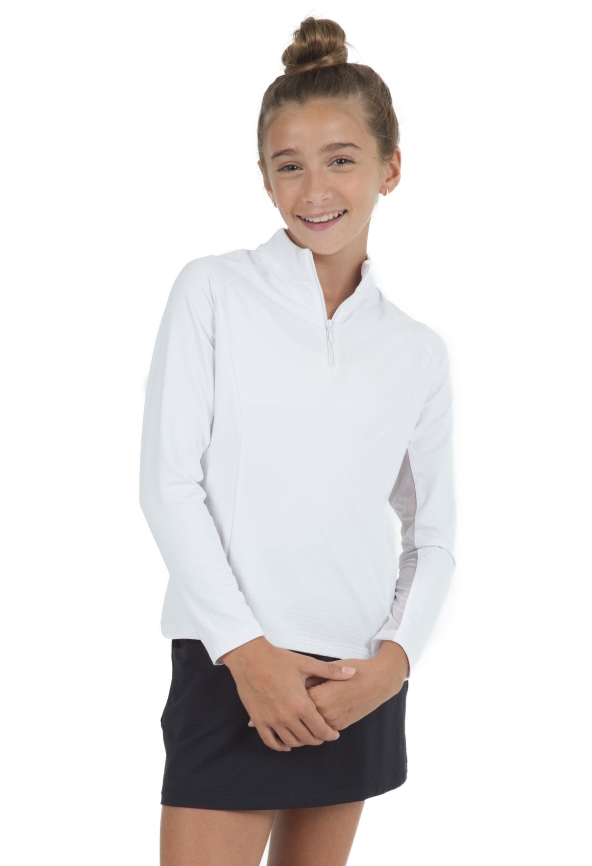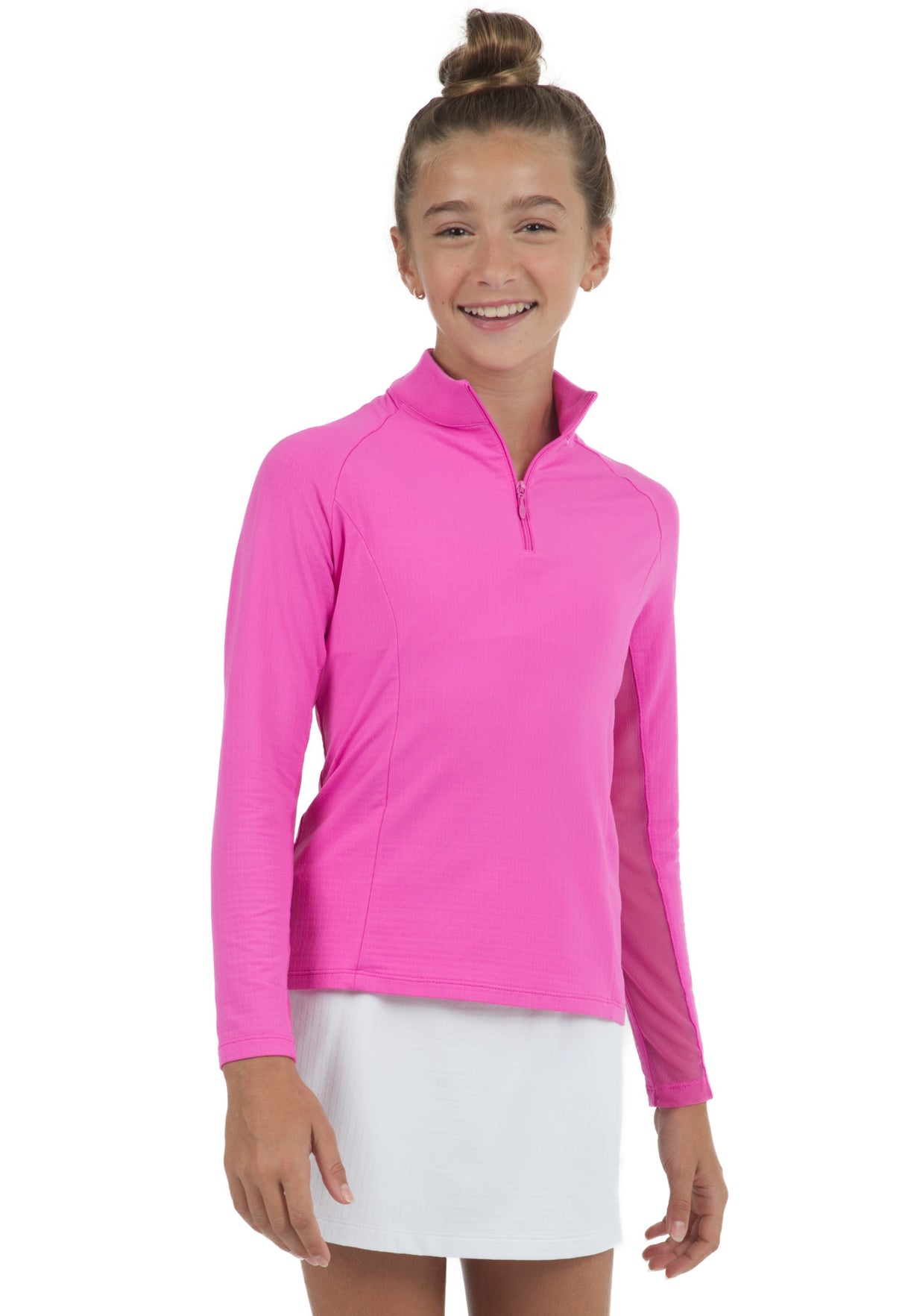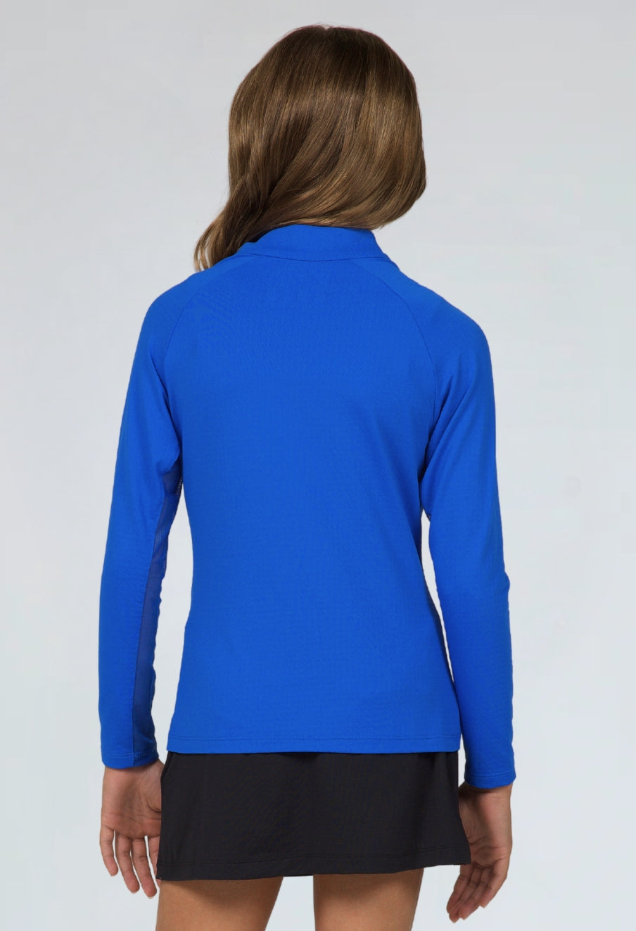 Our Girl's Long Sleeve Zip Mock Neck is available in blue, navy, peri, red, white and hot pink. It features our patented IceFil technology fabric which works by converting sweat to refrigerant; cooling your skin 3 to 5 degrees, allowing you to be cool, comfortable and dry on the hottest humid days.