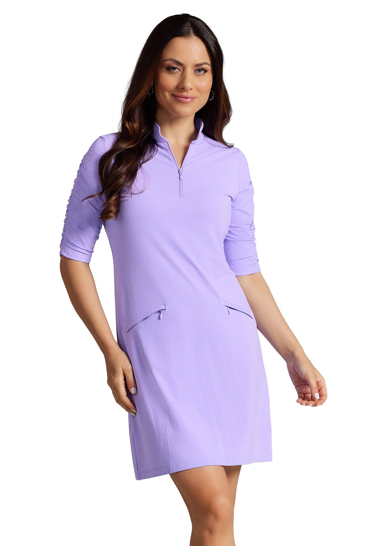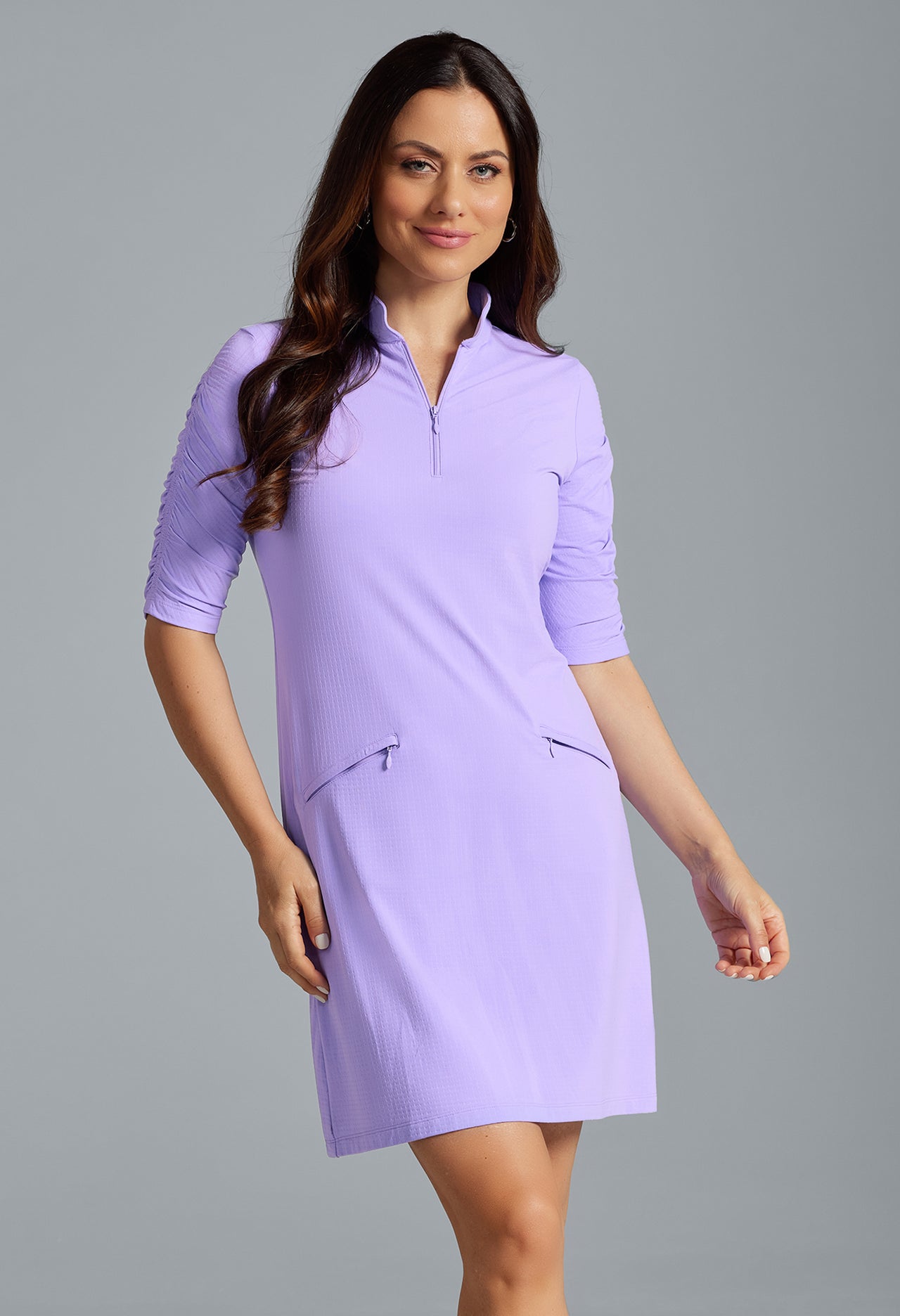 Sophisticated shaping featuring a mandarin collar and feminine shirring down the elbow-length sleeves makes this dress especially flattering, as well a practical with two front-zip welt pockets. Made in our patented Iceƒil® fabric, which lowers your skin temperature by up to five degrees using your perspiration as a catalyst, plus the added elements of UPF 50+ protect you from the sun's harmful UVA/UVB rays, moisture-wicking, anti-odor properties keep you dry and fresh throughout the day.