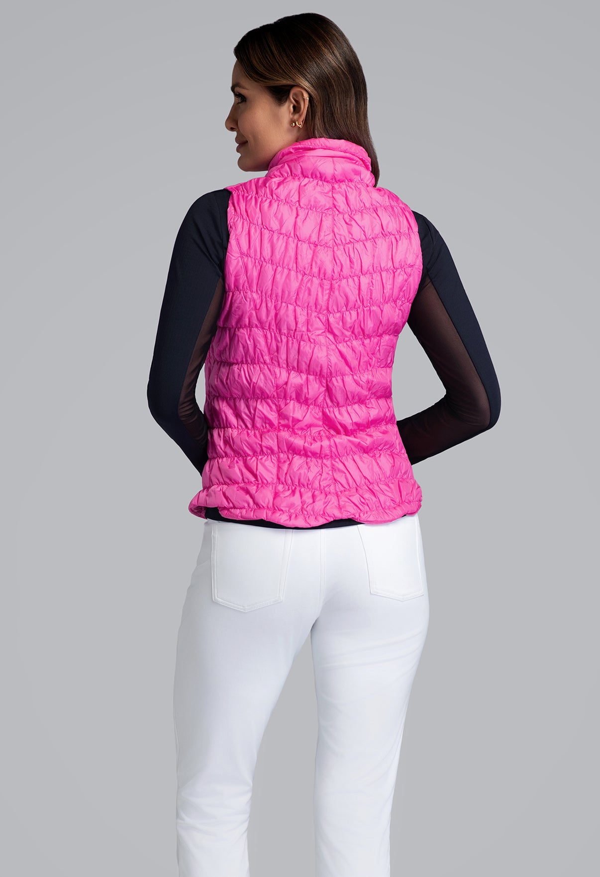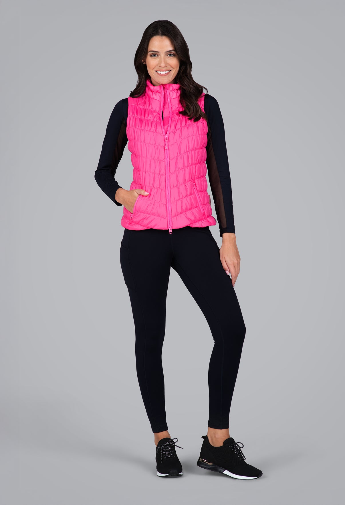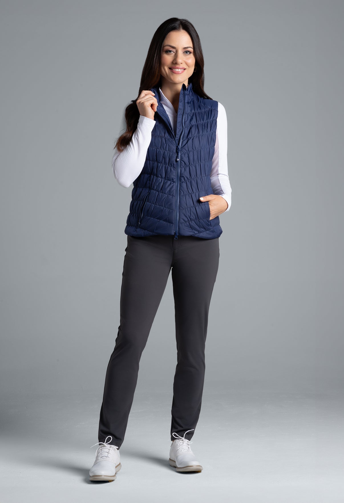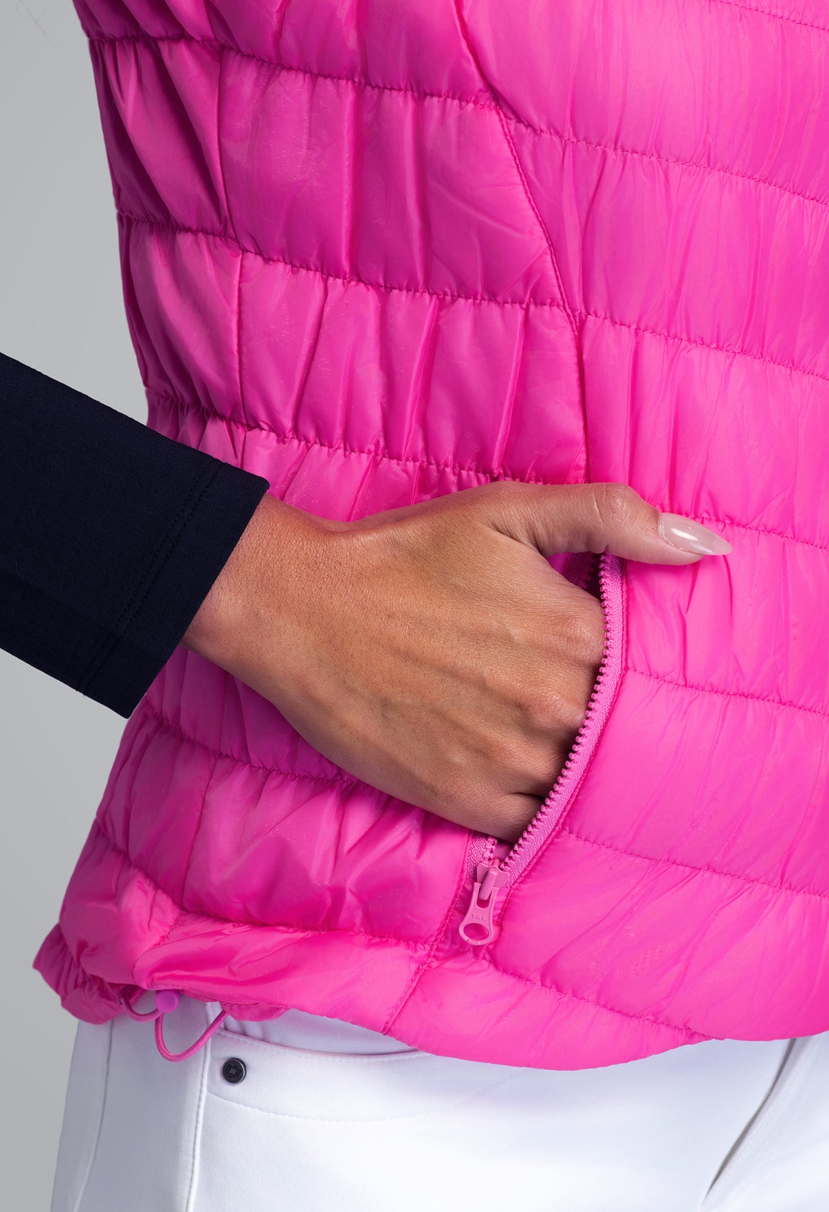 You’ll feel warm inside and out wearing this cozy, breathable and sustainable vest filled with environmentally friendly, renewable bio-based fibers. Shirred elastic quilting, princess seaming detail and an adjustable hem makes this garment flattering to all body types and fashionable. Zip pockets keep your hands warm on cool days and all your essentials secured. Look, feel and play your best while keeping the chill and winds at bay.