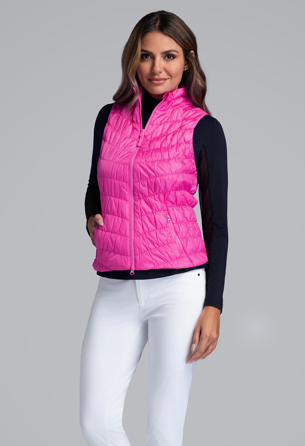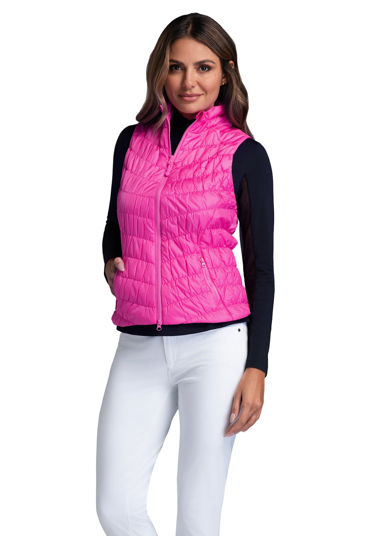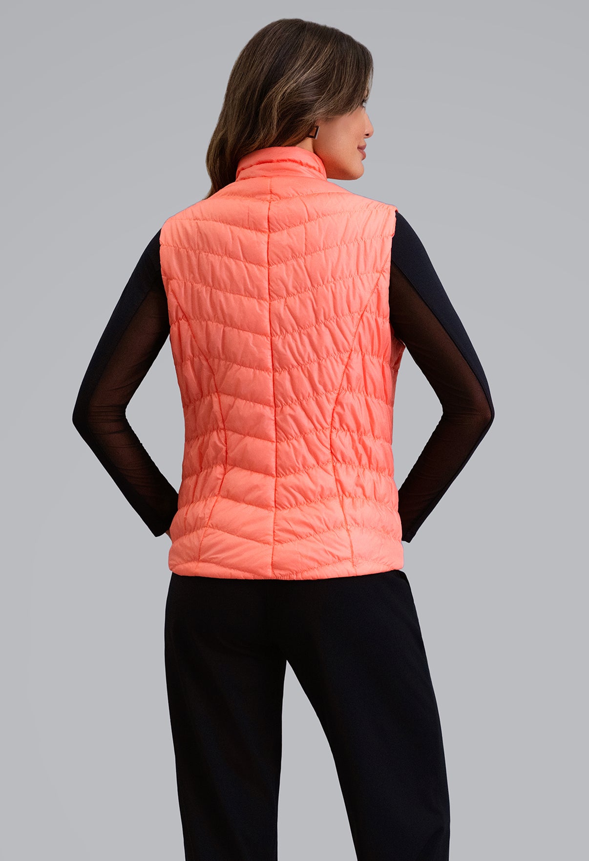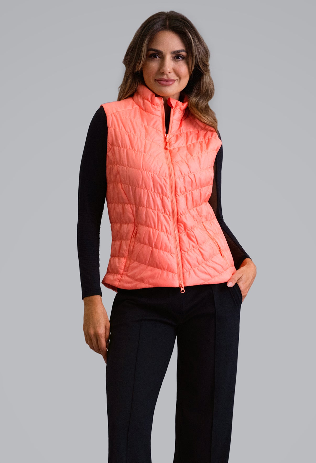 You’ll feel warm inside and out wearing this cozy, breathable and sustainable vest filled with environmentally friendly, renewable bio-based fibers. Shirred elastic quilting, princess seaming detail and an adjustable hem makes this garment flattering to all body types and fashionable. Zip pockets keep your hands warm on cool days and all your essentials secured. Look, feel and play your best while keeping the chill and winds at bay.