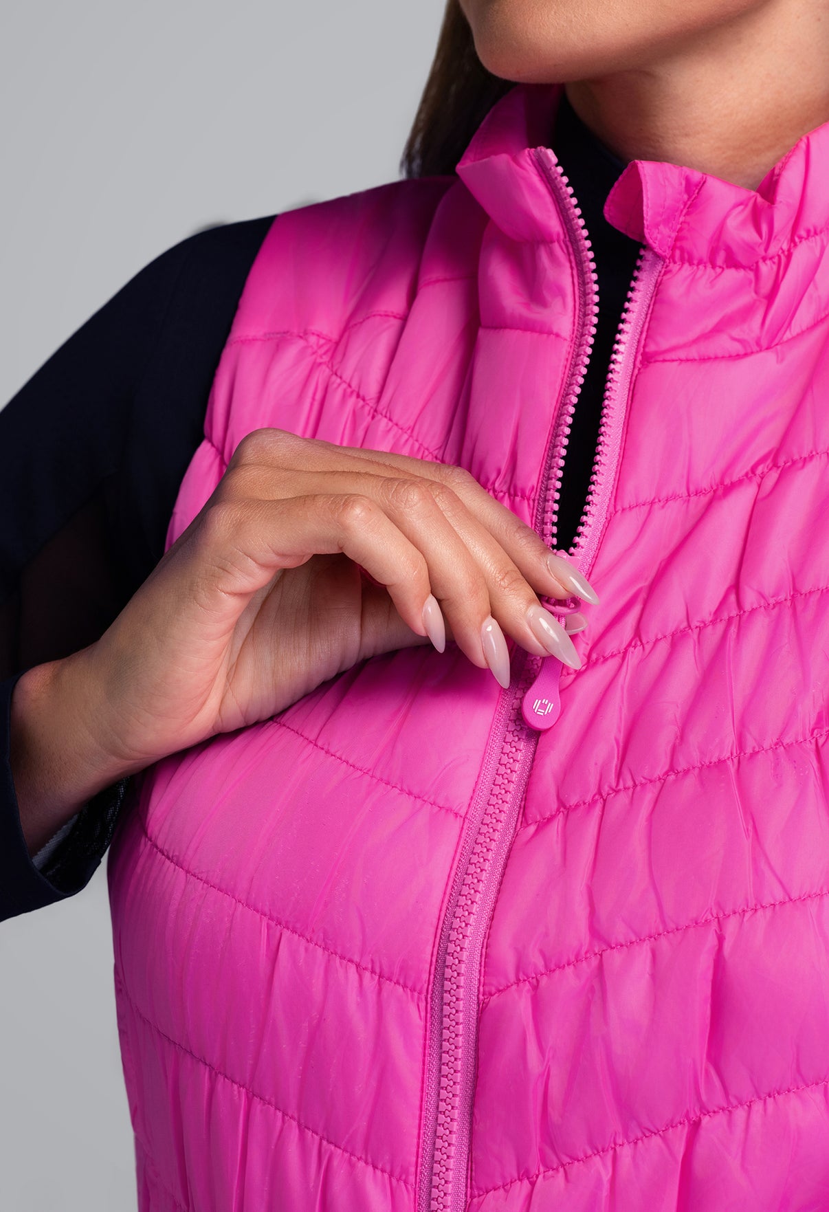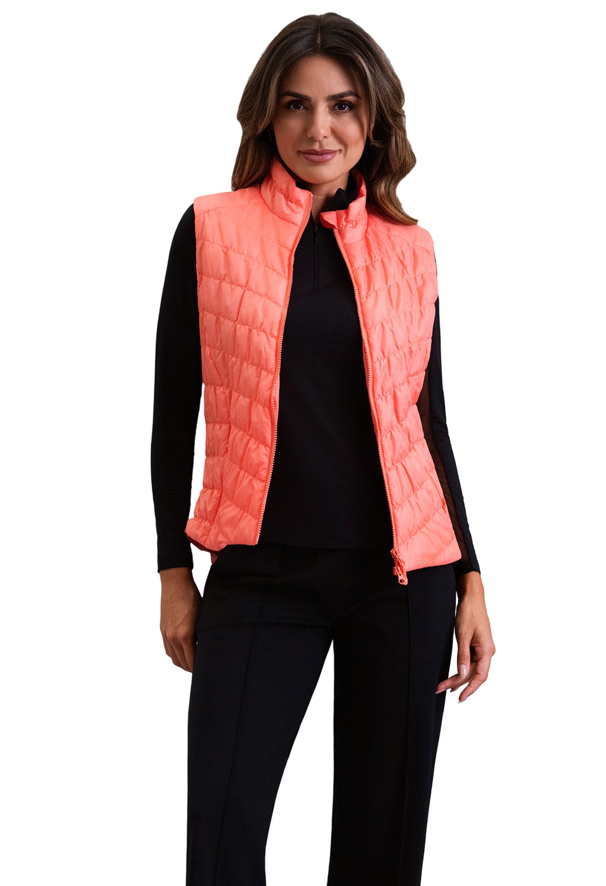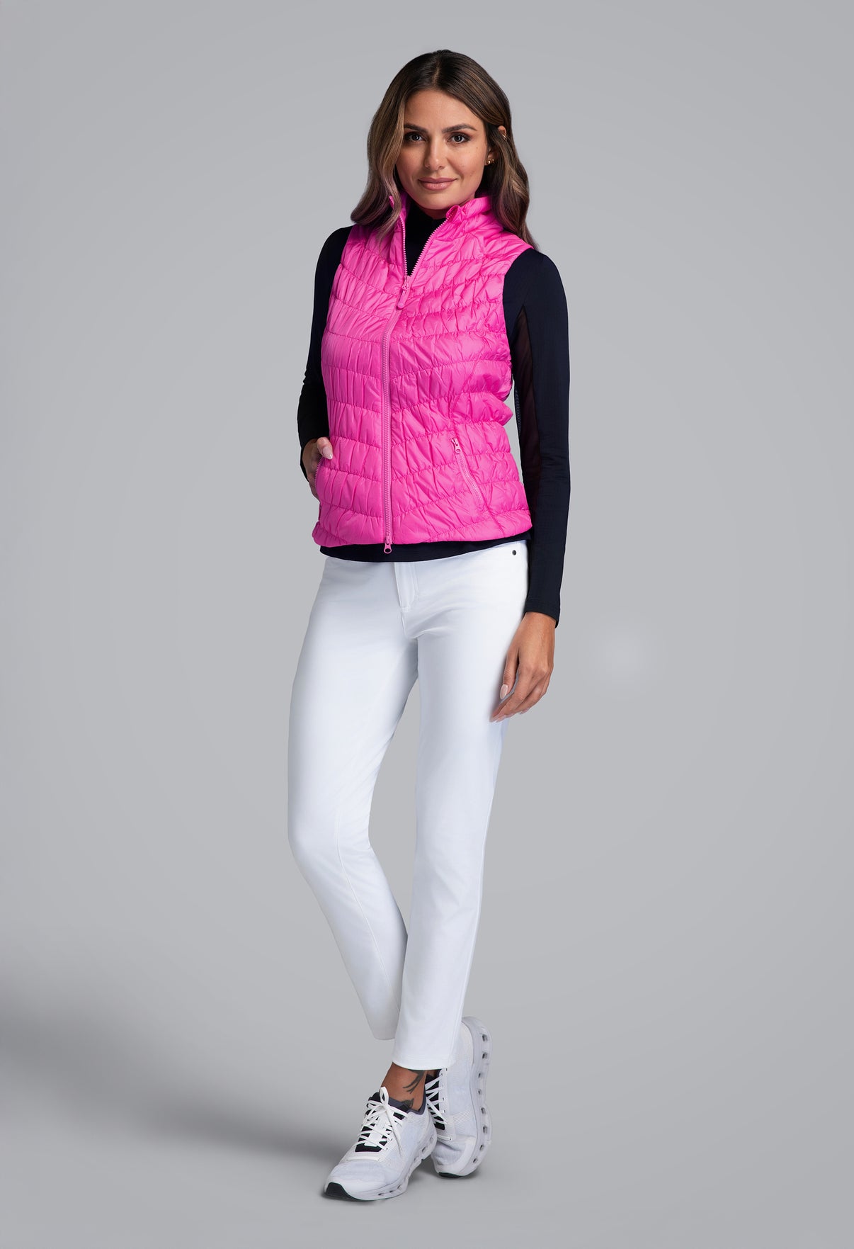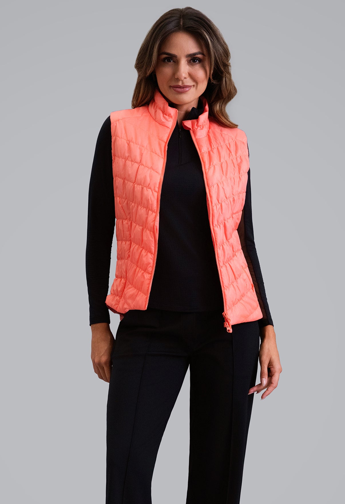 You’ll feel warm inside and out wearing this cozy, breathable and sustainable vest filled with environmentally friendly, renewable bio-based fibers. Shirred elastic quilting, princess seaming detail and an adjustable hem makes this garment flattering to all body types and fashionable. Zip pockets keep your hands warm on cool days and all your essentials secured. Look, feel and play your best while keeping the chill and winds at bay.