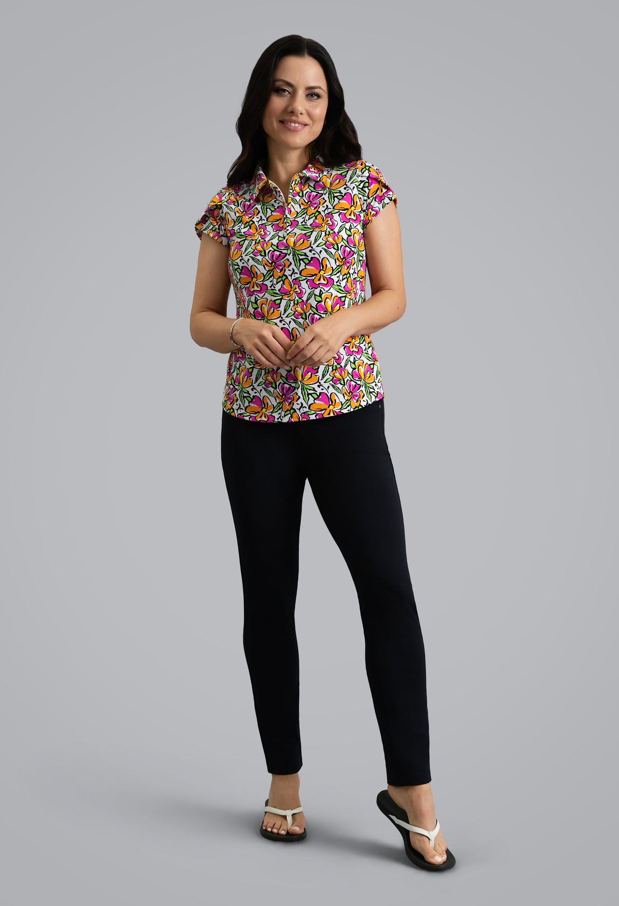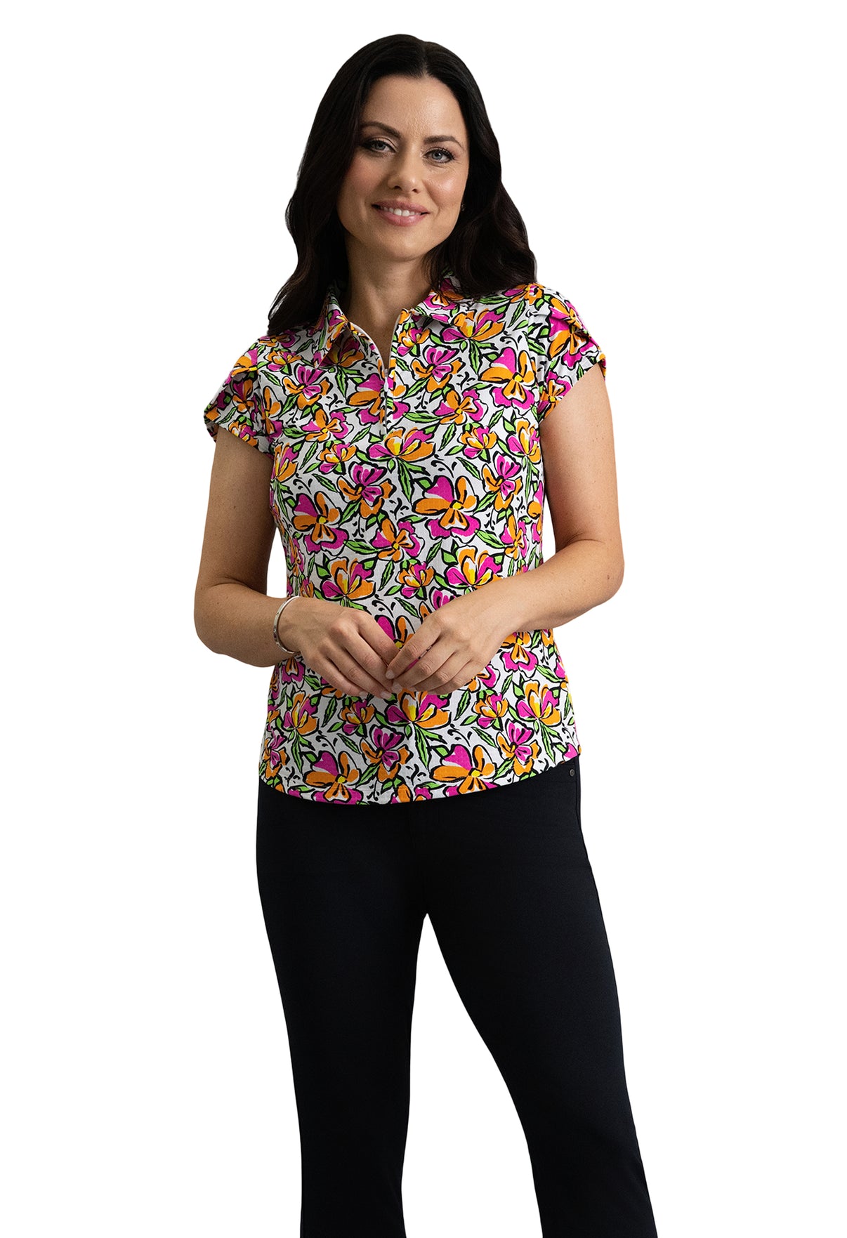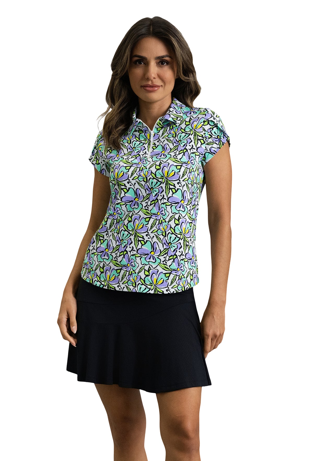 Bright and bold, the Sonia Print brings tropical flair to this modern polo. The feminine tulip sleeve allows easy movement with a flattering finish, while the zip placket adds a sleek, sporty touch. Crafted from soft, breathable IceFil® fabric, it cools the skin, wicks away moisture, and provides UPF 50+ sun protection—keeping you comfortable and confident on and off the course.