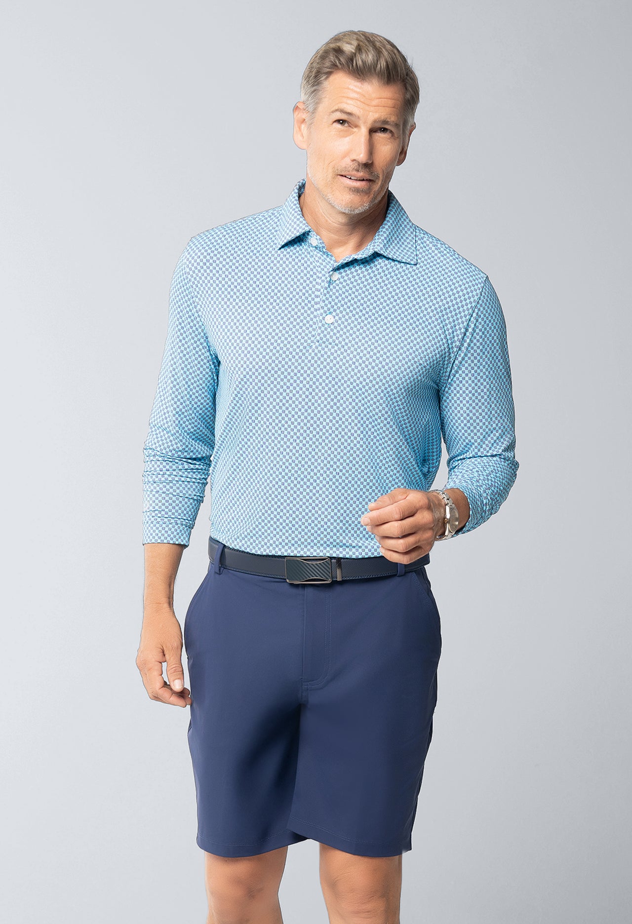 A fresh take on a classic, the Square Spiral Print Polo keeps you cool and comfortable no matter where the day leads. The subtle geometric pattern adds just enough personality, while the soft, lightweight fabric works hard behind the scenes—thanks to patented Iceƒil® cooling technology, UPF 50+ sun protection, moisture-wicking performance, and anti-odor properties. Whether you're heading to the course or out for lunch, this polo has you covered in more ways than one.