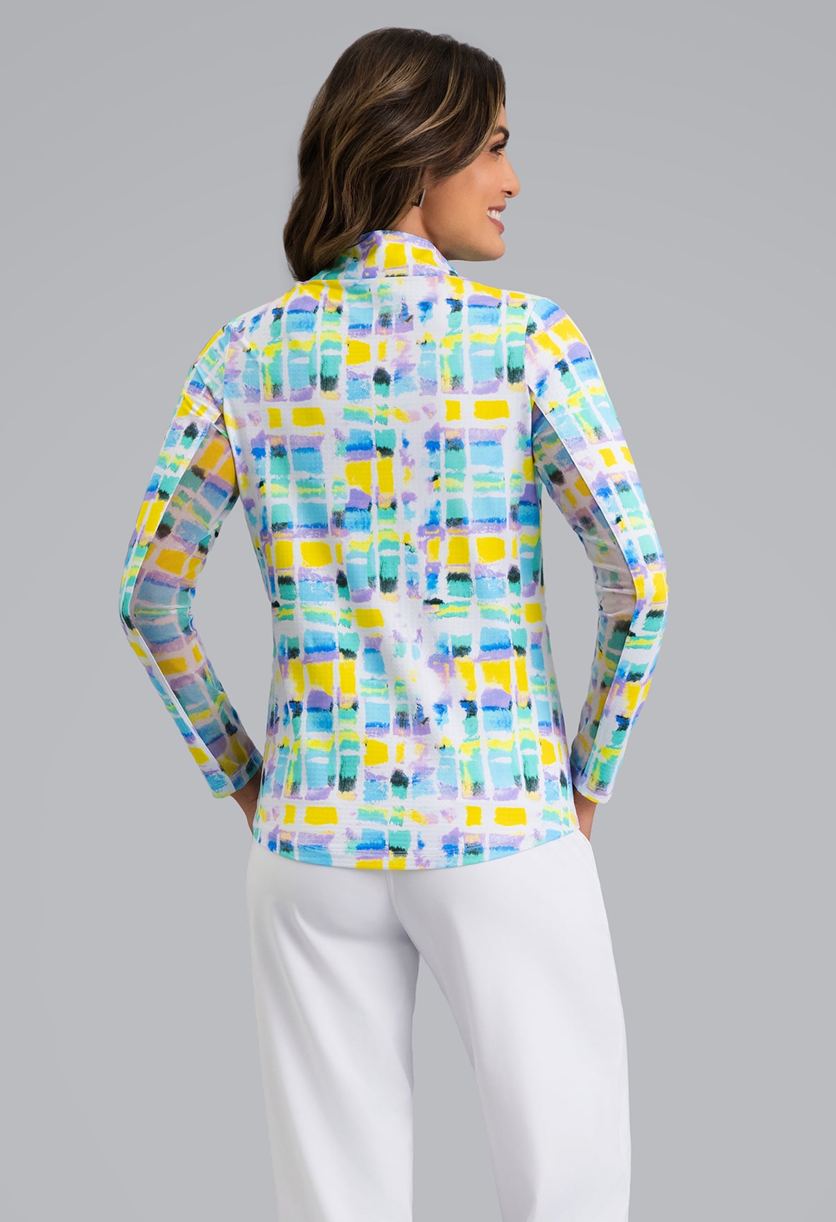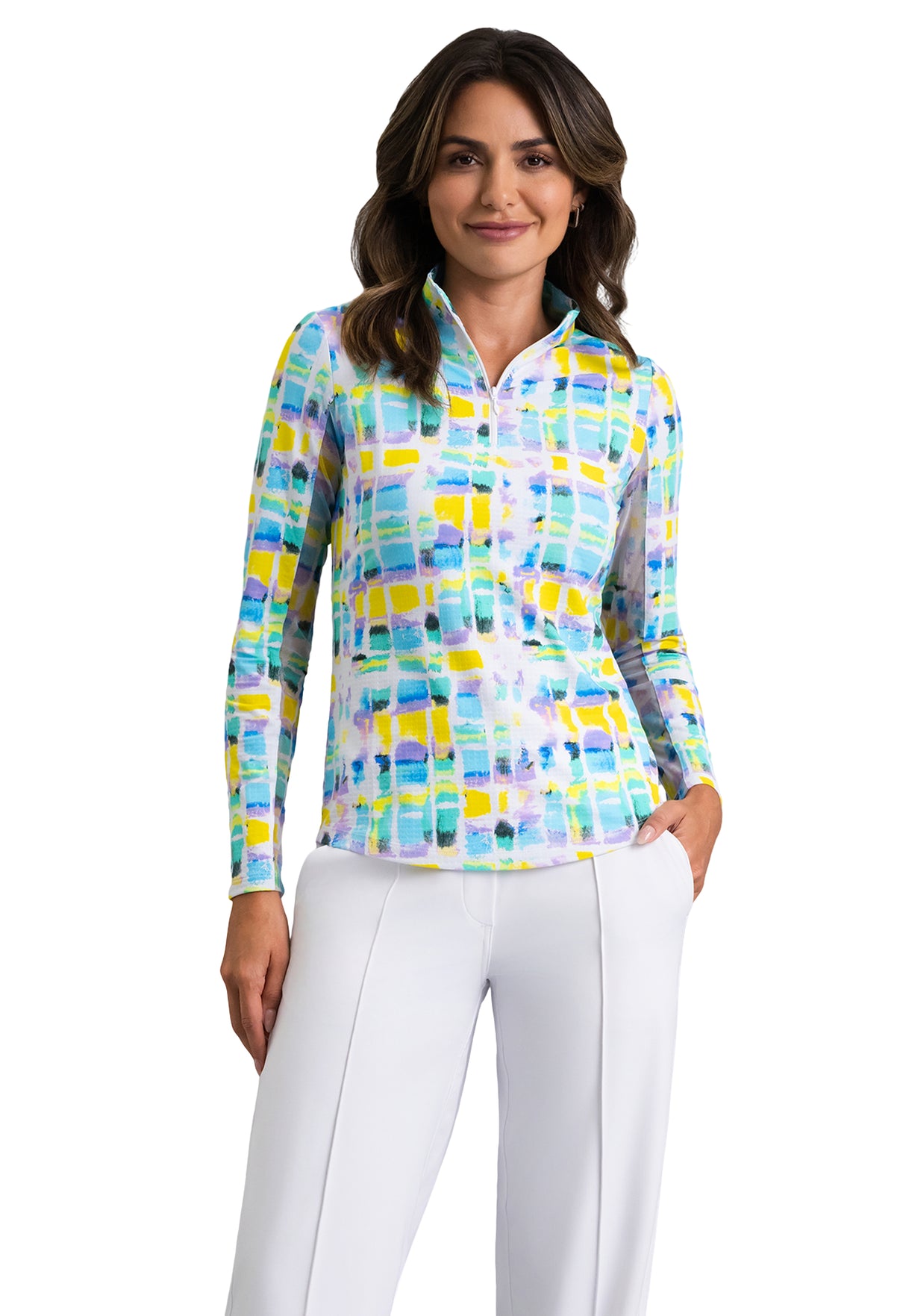 Bright, breezy, and full of energy—the Long Sleeve Mock Neck Top in the Tatiana Print brings color and comfort to your everyday lineup. Designed with a quarter-zip neckline and mesh panels along the inner sleeves for added breathability, this top is made to move with you. The Tatiana print features a watercolor grid of vibrant hues, offering a fresh, artistic twist on performance wear. Crafted with patented Iceƒil® cooling technology, UPF 50+ sun protection, moisture-wicking fabric, and anti-odor properties, it keeps you cool, dry, and effortlessly styled wherever the day takes you.